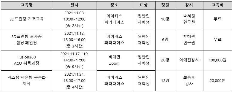 메이커 스페이스에서 11월에는 3D프린팅 기초 교육과 후가공 교육, AutoDesk Fusion 360 ACU 교육을 준비했습니다. 학과와 학생들의 많은 참여 부탁드립니다.