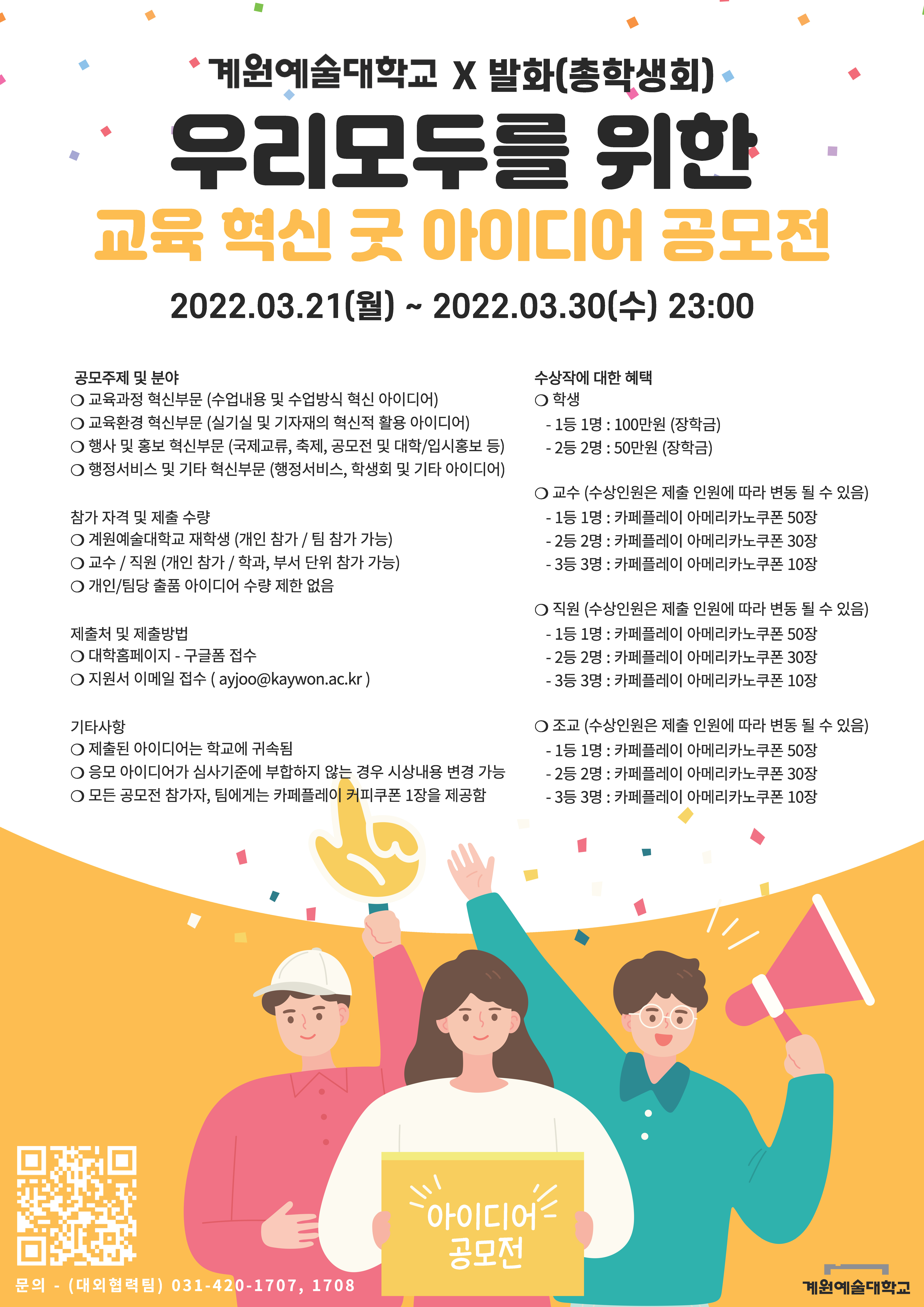 2022학년도 계원예술대학교×발화(총학생회) 교육 혁신을 위한 아이디어 공모전 우리모두를 위한 대학 교육 혁신 굿 아이디어 계원예술대학교와 총학생회 발화는 “2022학년도 계원예술대학교 교육 혁신을 위한 아이디어 공모전 「우리모두를 위한 대학 교육 굿 아이디어」” 를 아래와 같이 시행합니다. 우리대학 구성원의 참신한 교육혁신 아이디어를 확보하여 혁신적이고 차별화된 계원만의 혁신 교육과 효율적인 수요자 중심 혁신 교육 방안을 마련하고자 합니다. 계원 구성원 여러분의 많은 관심과 참여 바랍니다. - 1. 참여자격 : 계원 재학생, 교수, 직원, 조교 (개인 참가 또는 팀(학과,부서) 단위 참가) 2. 공모부문 및 주제 ❍ 교육과정 혁신부문 (수업내용 및 수업방식 혁신 아이디어) - 우리 대학 ..