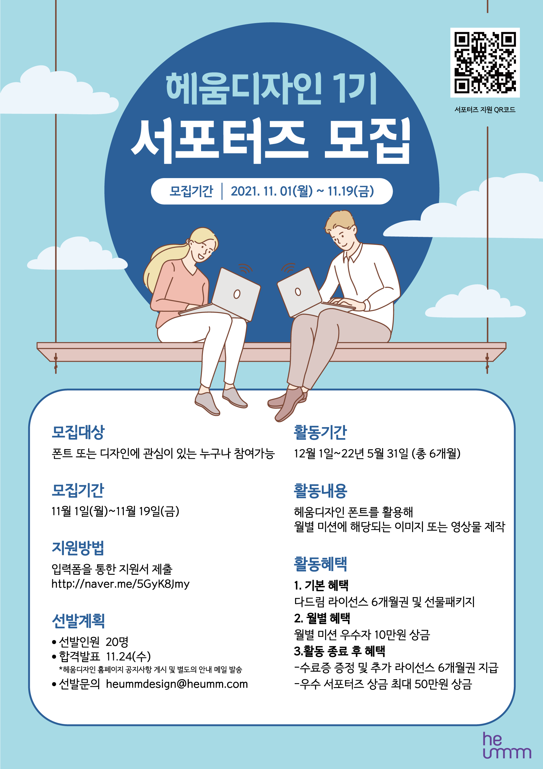 [해움디자인 1기 서포터즈 모집] ﹒모집대상: 폰트 또는 디자인에 관심이 있는 누구나 참여가능 ﹒모집기간: 11월 1일(월) ~ 11월 19일(금) ﹒지원방법: 입력폼을 통한 지원서 제출 http://naver.me/5GyK8Jmy ﹒선발계획 ①선발인원 : 20명 ②합격발표 : 11월 24일(수) - 해움디자인 홈페이지 공지사항 게시 및 별도의 안내 메일 발송 ③선발문의 : heummdesign@heumm.com ﹒활동기간: 12월 1일 ~ 22년 5월 31일 (총 6개월) ﹒활동내용: 헤움디자인 폰트를 활용해 월별 미션에 해당되는 이미지 또는 영상물 제작 ﹒활동혜택 ①기본 혜택 : 다드림 라이선스 6개월권 및 선물패키지 ②월별 혜택 : 월별 미션 우수자 10만원 상금 ③활동 종료 후 혜택 : 수료증 증..