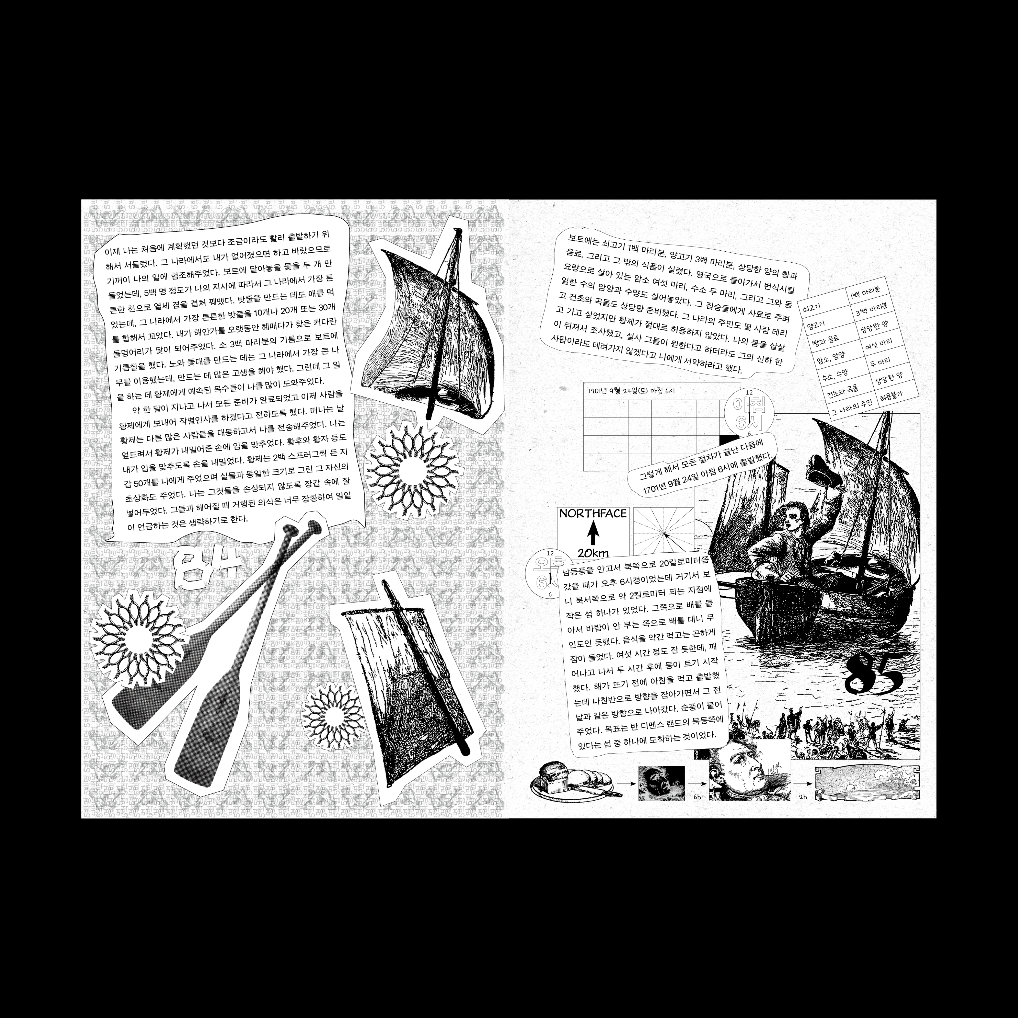 쓸 데 없이 디테일 한 숫자가 들어간 부분(시계, 명 수 등)들을 살리려고 했고 튼튼한 밧줄을 10개~30개로 꼬았다고 해서 꼬은 밧줄로 꽃을 만들기도 했다. 그런 디테일이 웃기지만 디자인하기에는 흥미로웠고 걸리버 여행기 원본에 들어가 있지 않은 이미지를 유사한 분위기로 편집하며 작업했다. 쪽번호를 굳이 수제로 만든 것도 걸리버의 변덕이라고 생각한다.