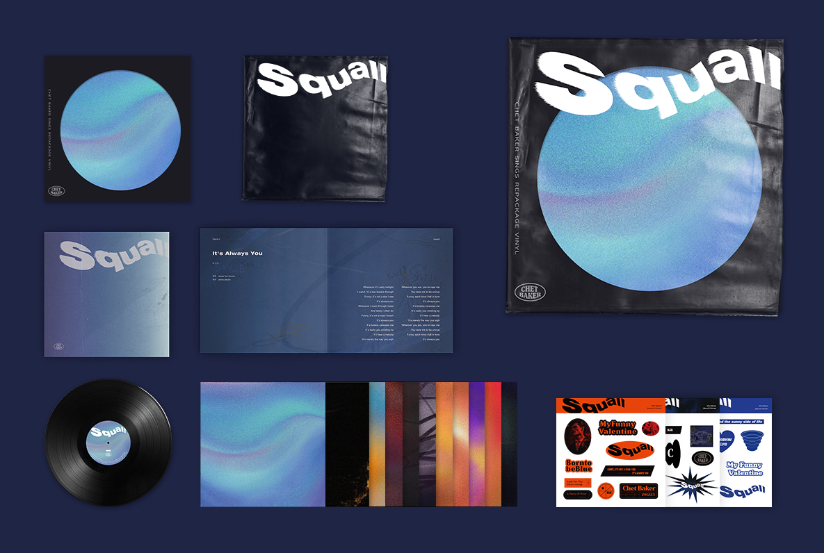 쳇 베이커의 [Sings]라는 음반을 리디자인했다. [Sings]는 청춘의 목소리로 사랑 감정들을 이야기하는 14곡이 수록되어 있다. 우리는 이 음반명을 'squall'이라는 이름으로 재해석했다. 청춘의 처음 겪는 사랑들이 미숙해서 돌풍처럼 거칠다는 의미가 담겨있다. 14개의 곡들로 이야기를 만들어 트랙리스트를 작성하고 스콜에서 거친, 뜨거운, 차가운이라는 키워드를 가져와 전체적인 디자인을 완성했다.