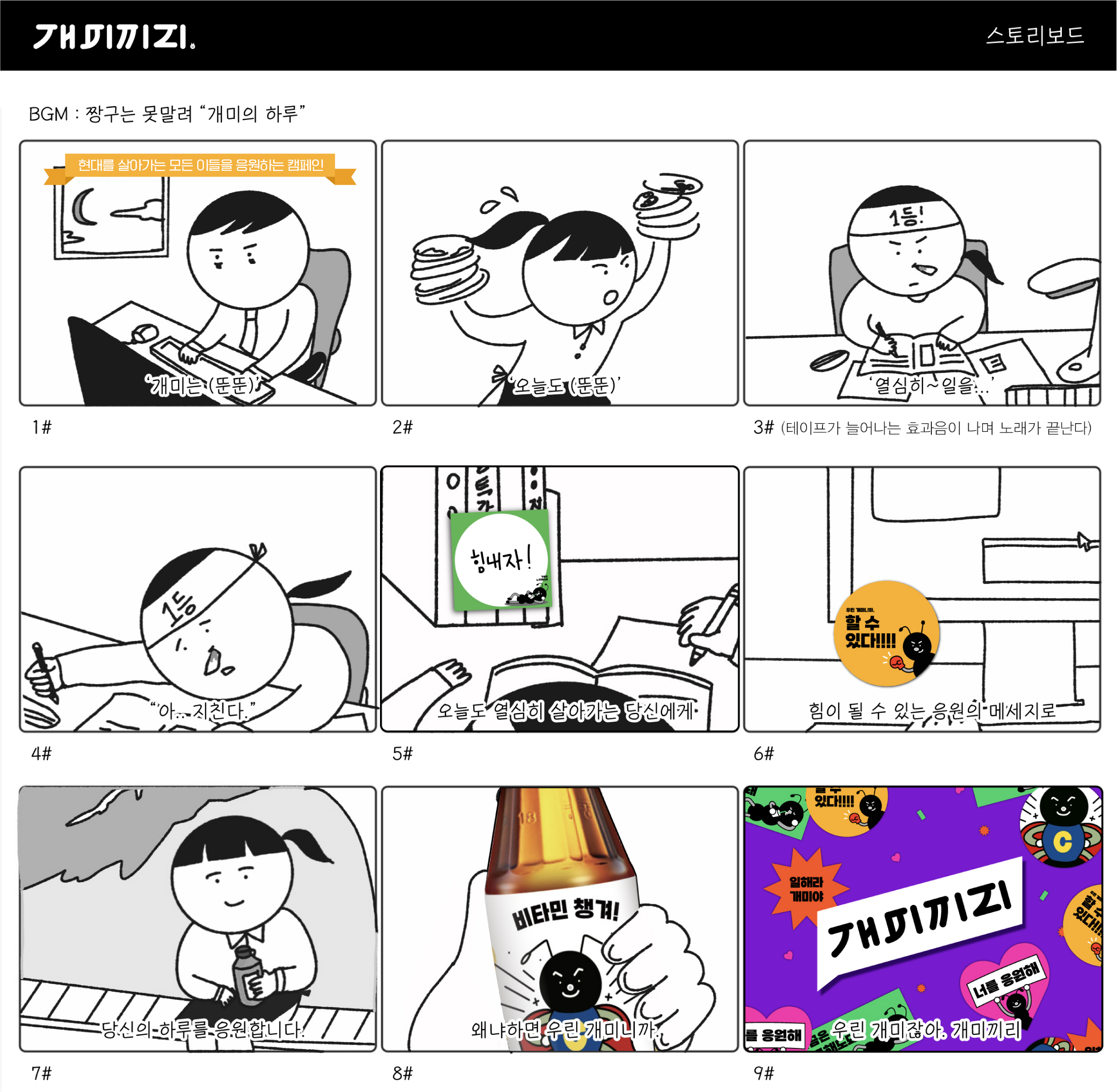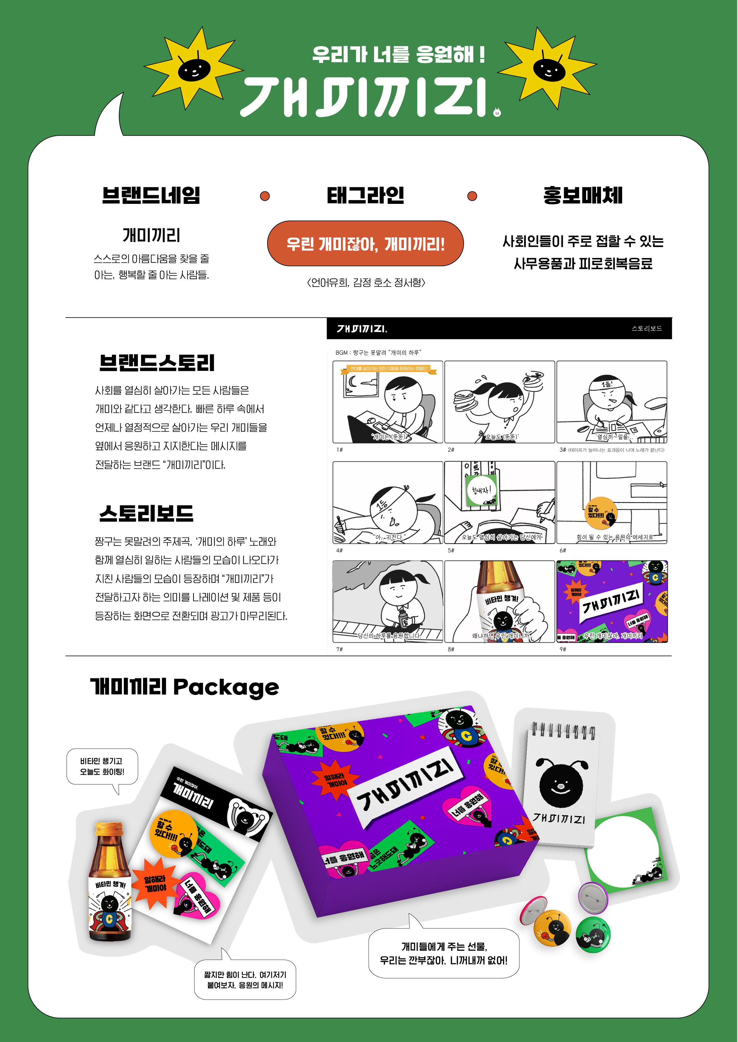 <개미끼리> 는 "현대 사회를 살아가는 모든 사람들" 의 삶을 응원하고자 응원키트를 제작하였다. 직장인, 대학생과 같은 보통의 모든 사람들을 개미로 지칭하며, 언제나 열정적으로 살아가는 우리 개미들은 서로 모여 응원하고 지지한다는 메시지를 전달하는 브랜드 '개미끼리'를 디자인하였다. 실생활에서 유용하게 사용할 수 있는 노트, 메모지, 핀버튼, 스티커와 피로 회복 음료의 라벨링을 제작하고, 넷플릭스의 '오징어게임'의 깐부 대사를 차용하여 "우리는 개미잖아, 개미끼리"라는 정서형 헤드라인을 전략으로 사용하였다.