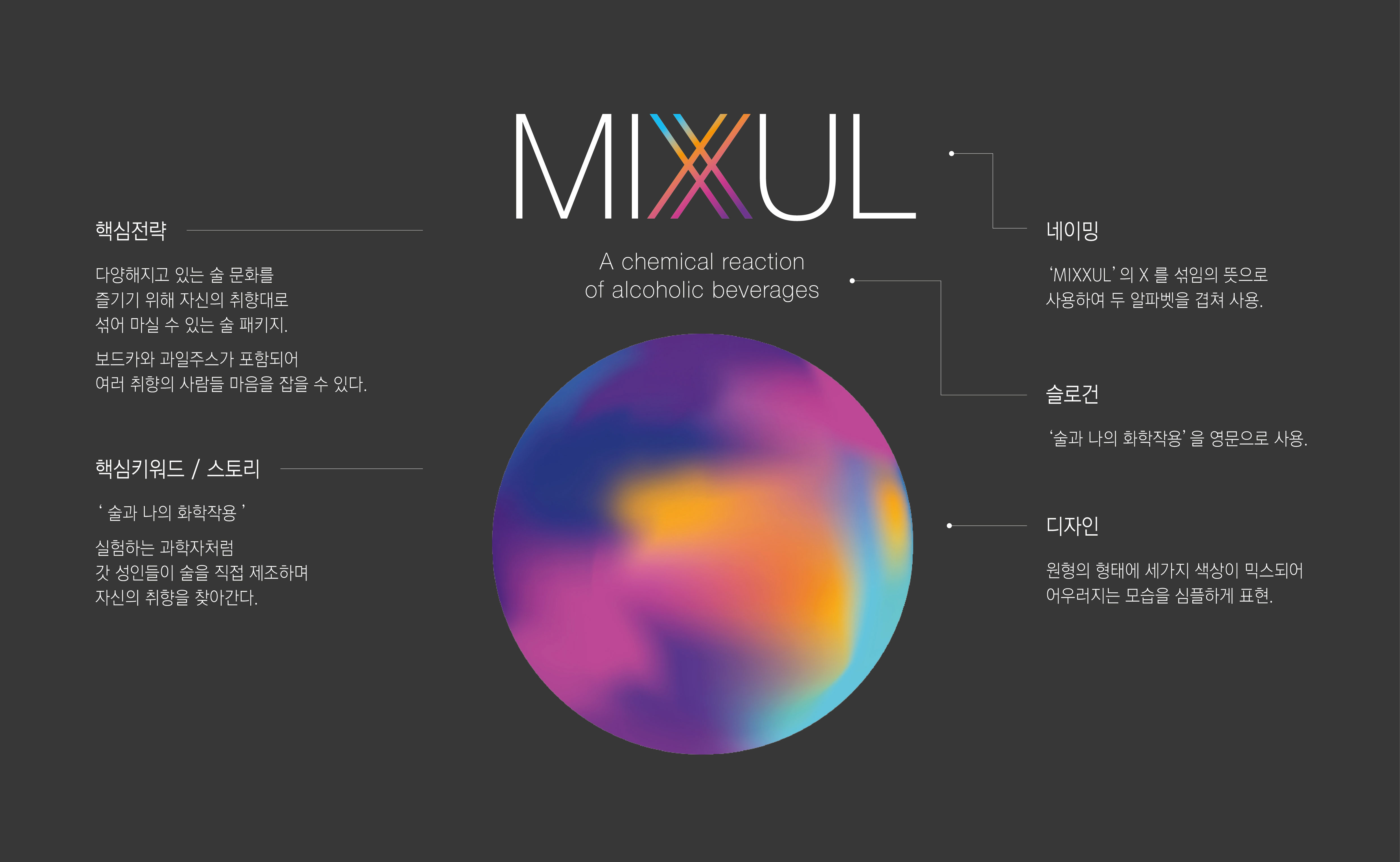 '술과 나의 화학작용' 실험하는 과학자처럼 갓 성인들이 술을 직접 제조하여 자신의 취향을 찾아간다. 다양해지고 있는 술 문화를 즐기기 위해 자신의 취향대로 섞어 마실 수 있는 술 패키지. 메인의 보드카와 과일맛의 주스들이 포함되어 여러 취향의 사람들 마음을 잡을 수 있다. 김민지 mingi2363@naver.com 강희주 강도연 박성원 신민경