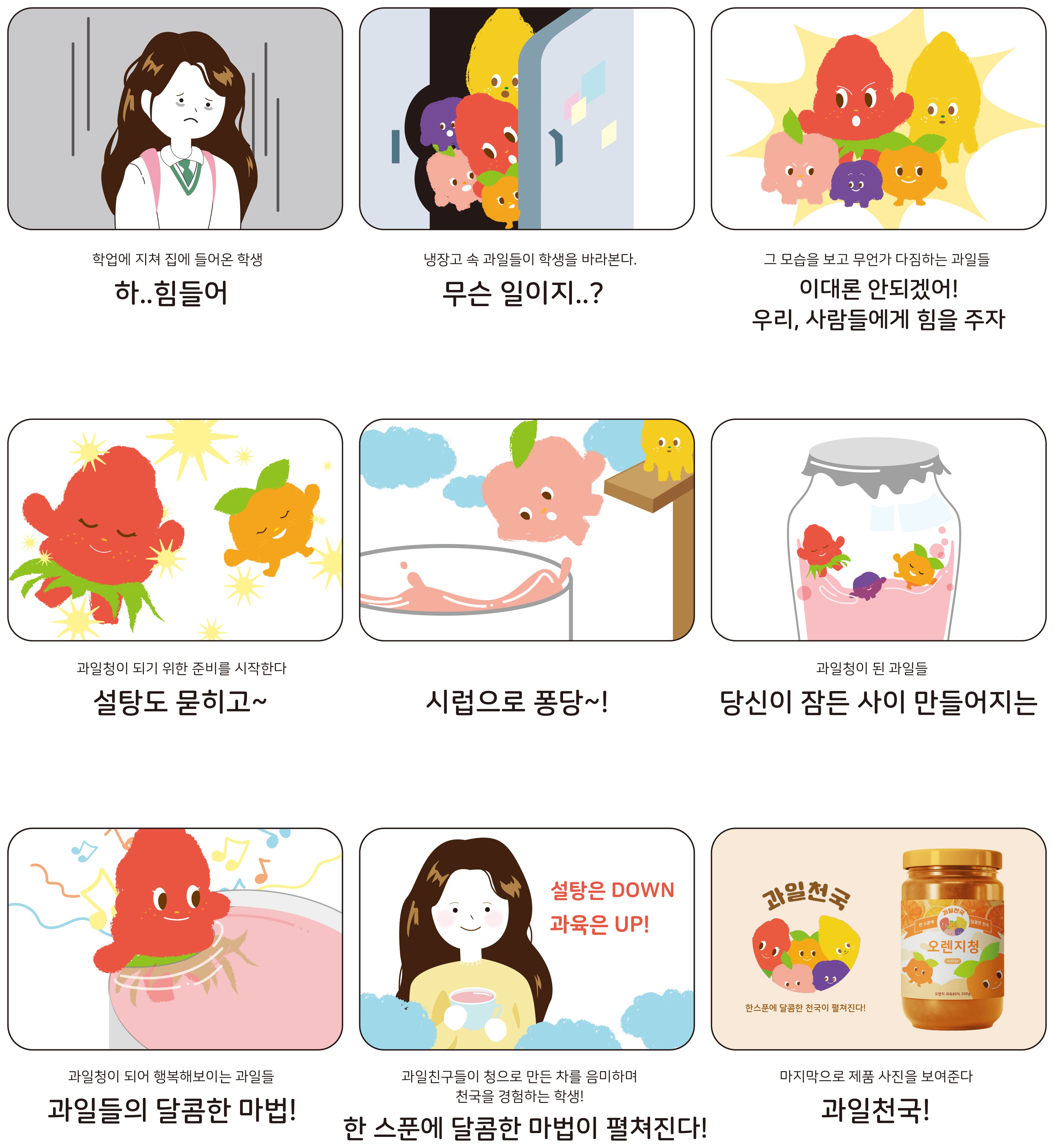 순수한 감성을 가진 소비자를 겨냥한 귀여운 캐릭터와 일러스트를 사용해 탄생한 '과일천국'은 사람들이 잠든 사이 천국을 선사할 달달한 과일청으로 변신하는 이야기를 담고있다.