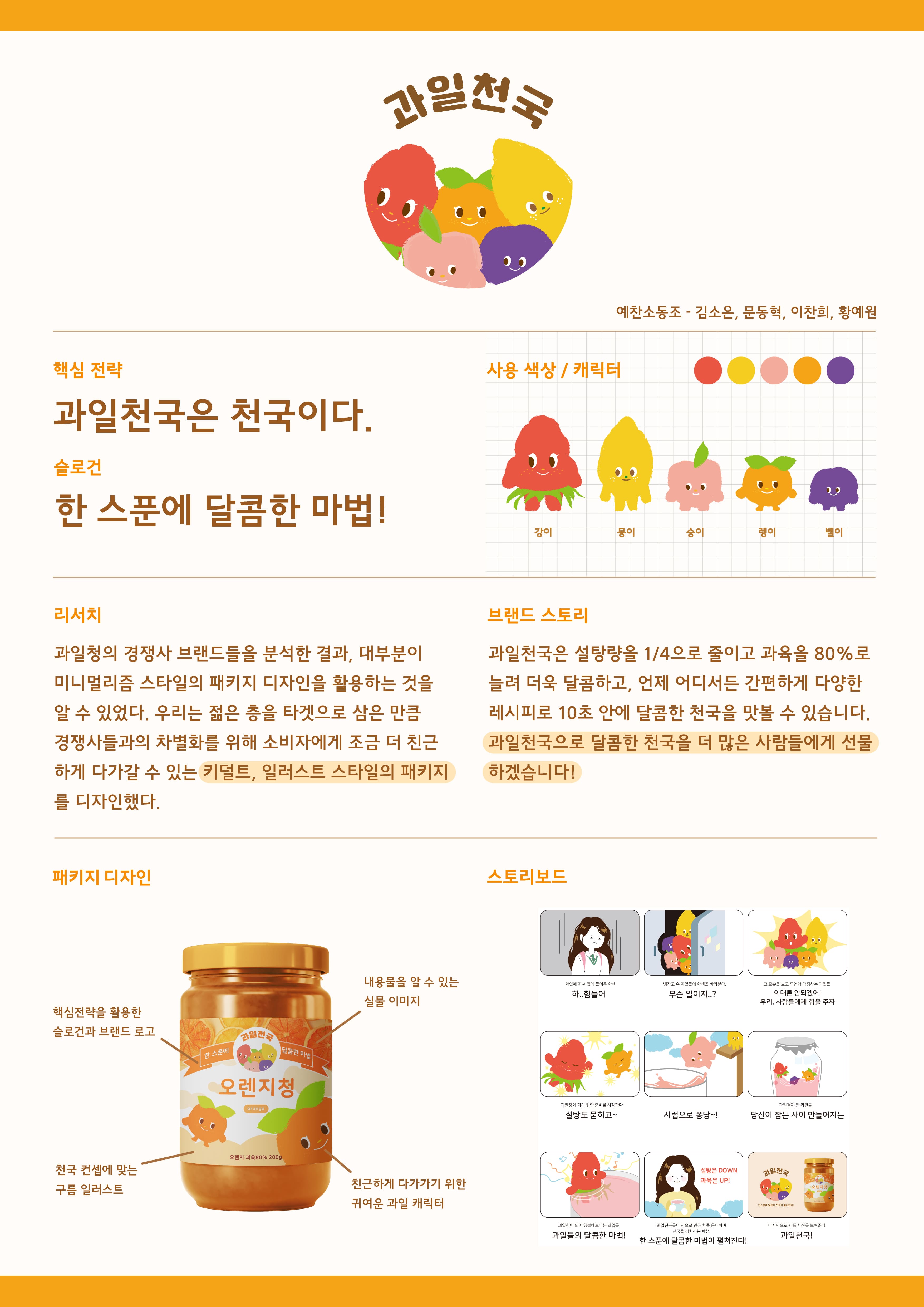'한 스푼에 달콤한 마법이 펼쳐진다!' 순수한 감성을 가진 소비자를 겨냥한 귀여운 캐릭터와 일러스트를 사용해 탄생한 '과일천국'은 사람들이 잠든 사이 천국을 선사할 달달한 과일청으로 변신하는 이야기를 담고있다. 김소은 soeunnnn@naver.com @so.eunnn 문동혁 moondonghyuk@kakao.com @hyuk.jpg 이찬희 leechan0105@gmail.com 황예원 ekfmfmr123@naver.com