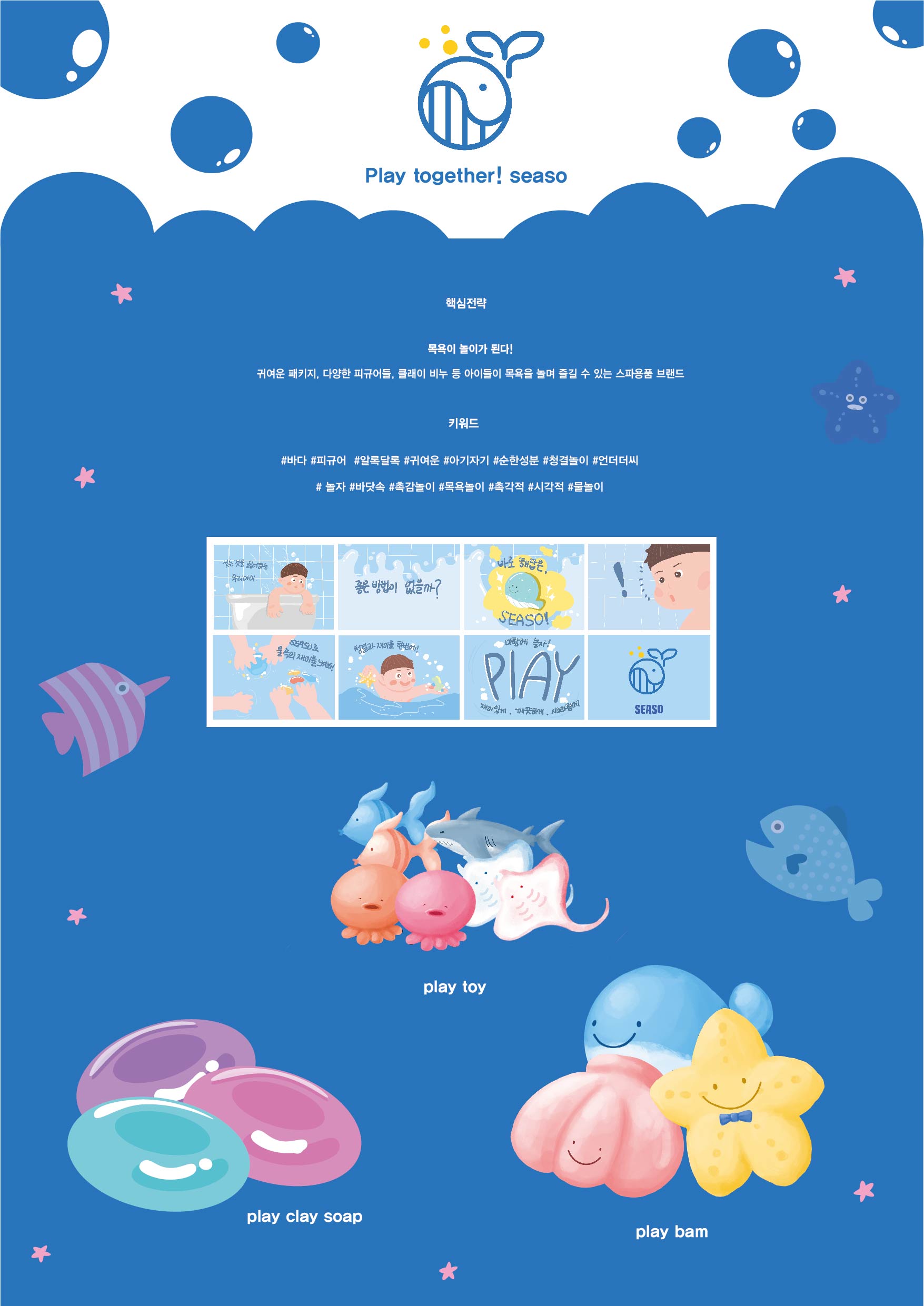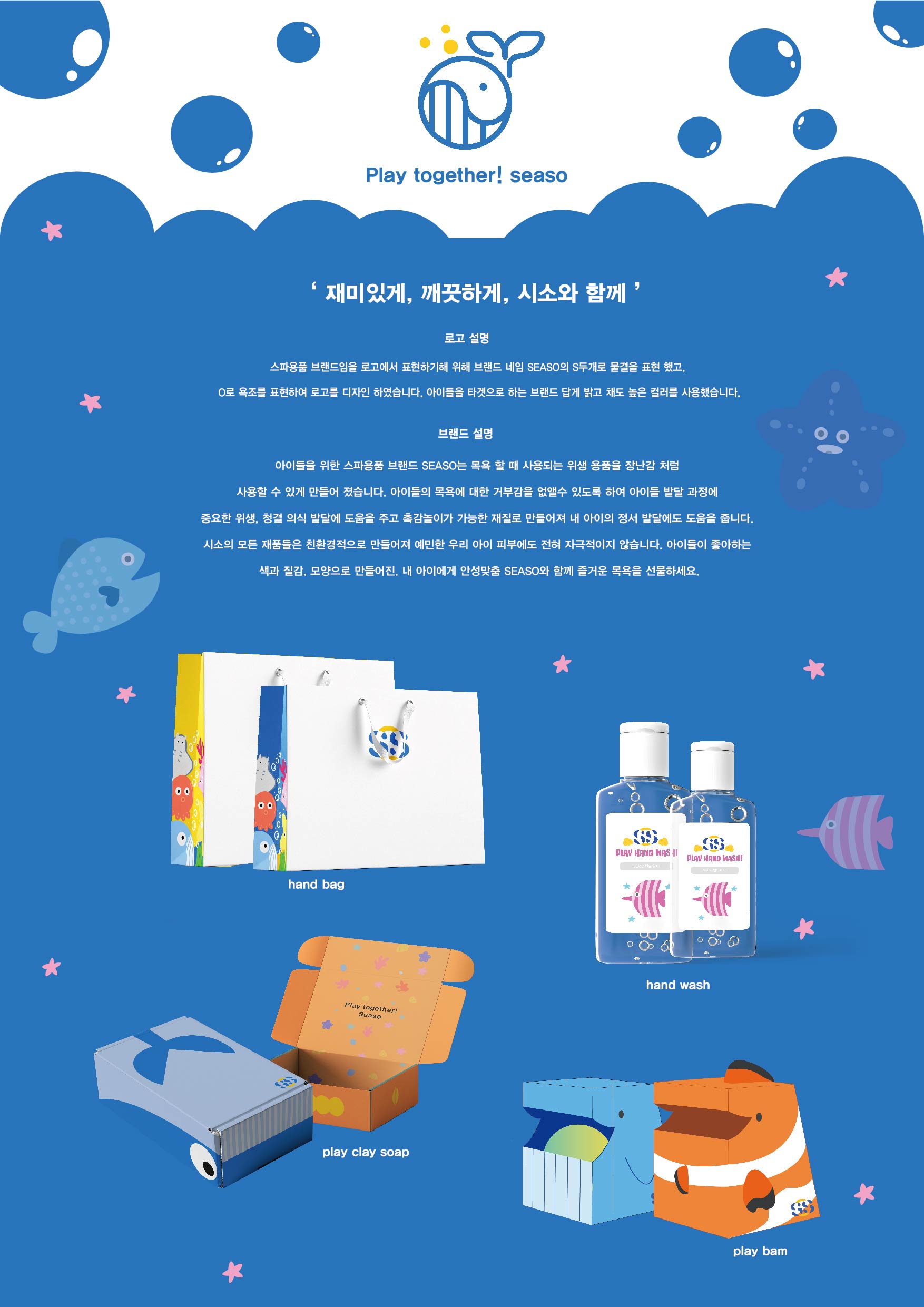 SEASO는 유아 스파 용품 브랜드로 목욕하기 싫어하는 아이들이 즐겁게 목욕하도록 도와주는 브랜드이다. “목욕이 놀이가 된다!” 는 전략을 가지고 귀여운 패키지와 제품을 통해 아이들이 재미있게 목욕할 수 있도록 도와준다. 메인 제품은 play clay soap(비누), play bam(입욕제), 핸드워시이다.