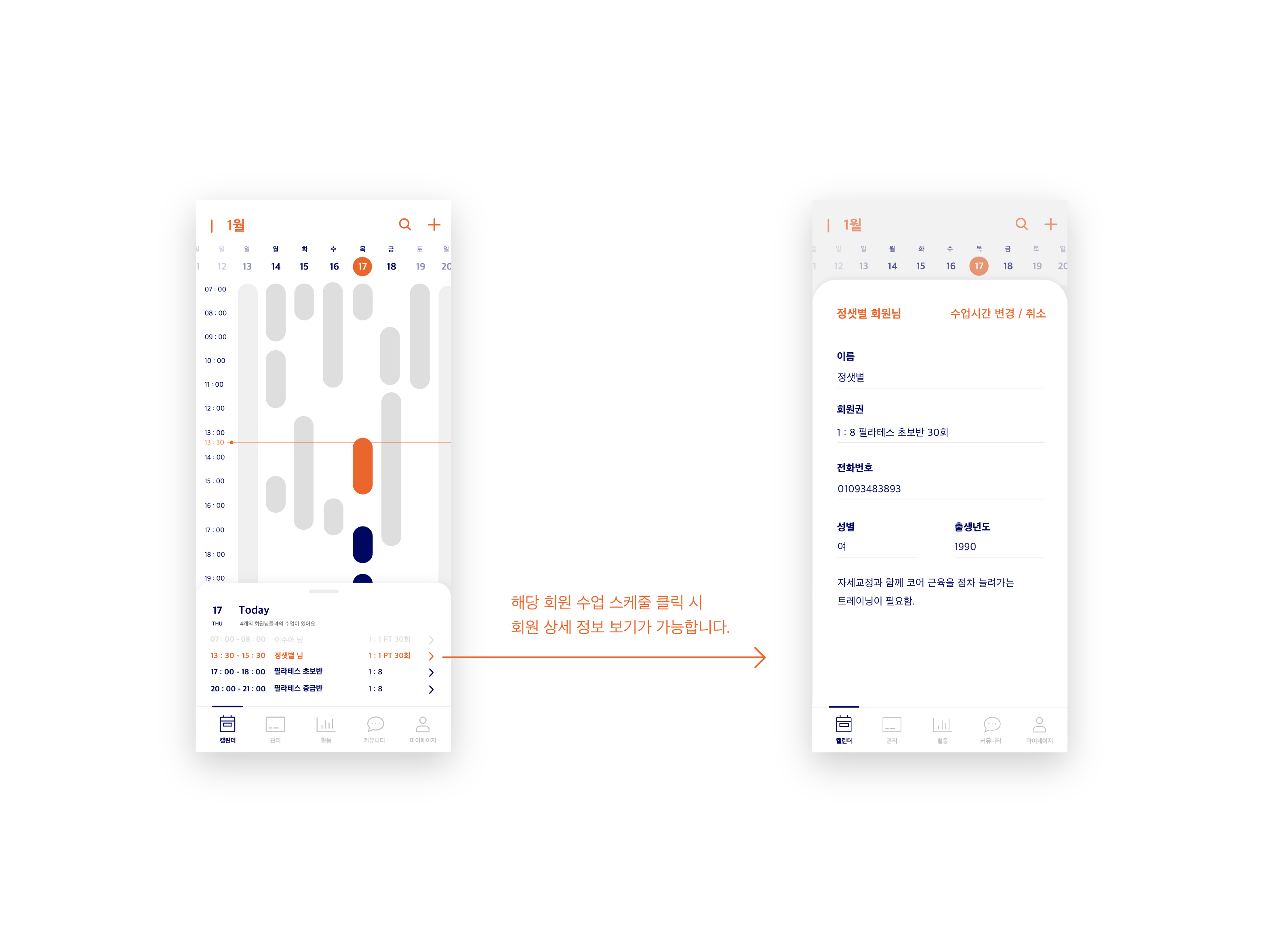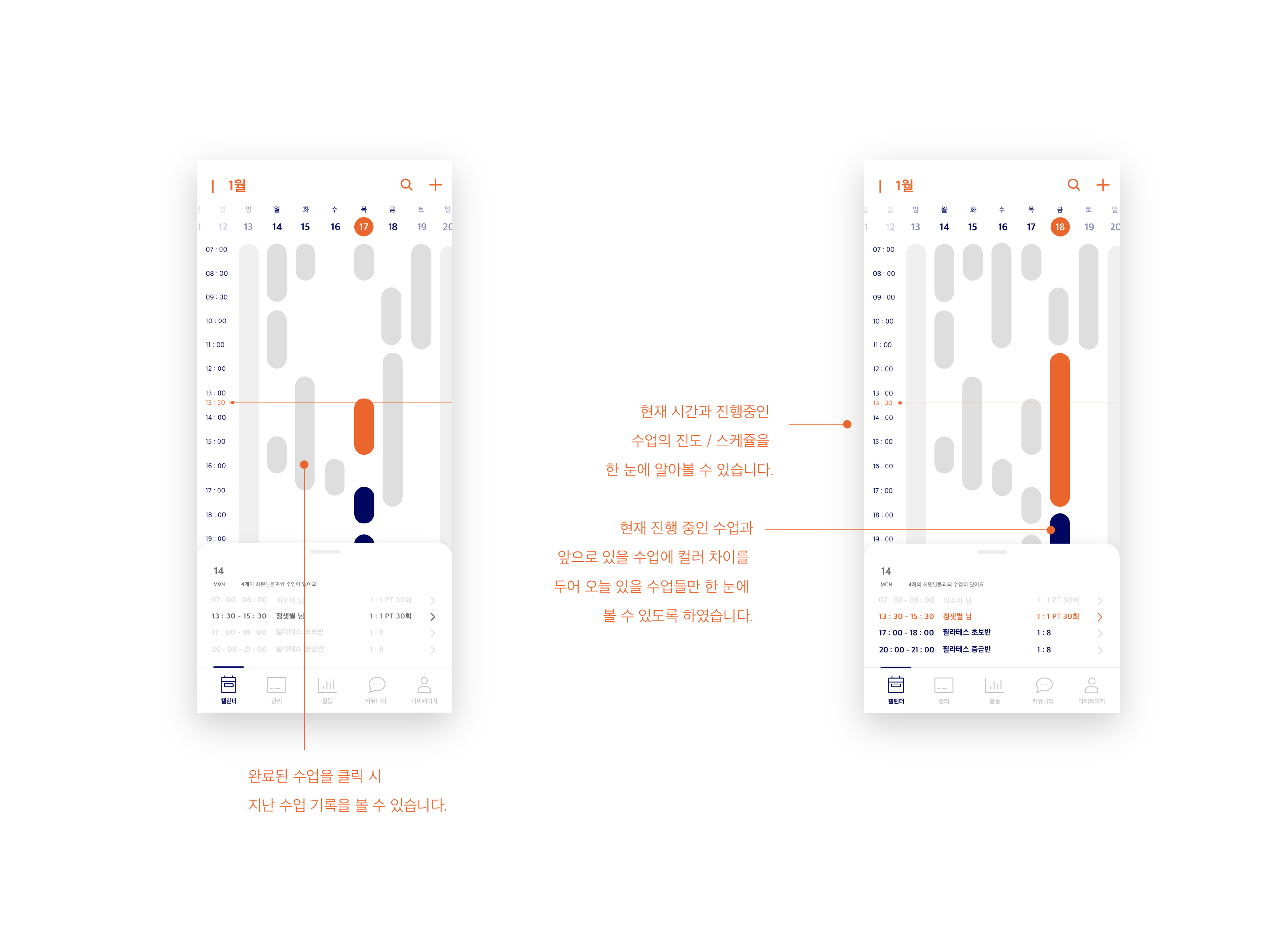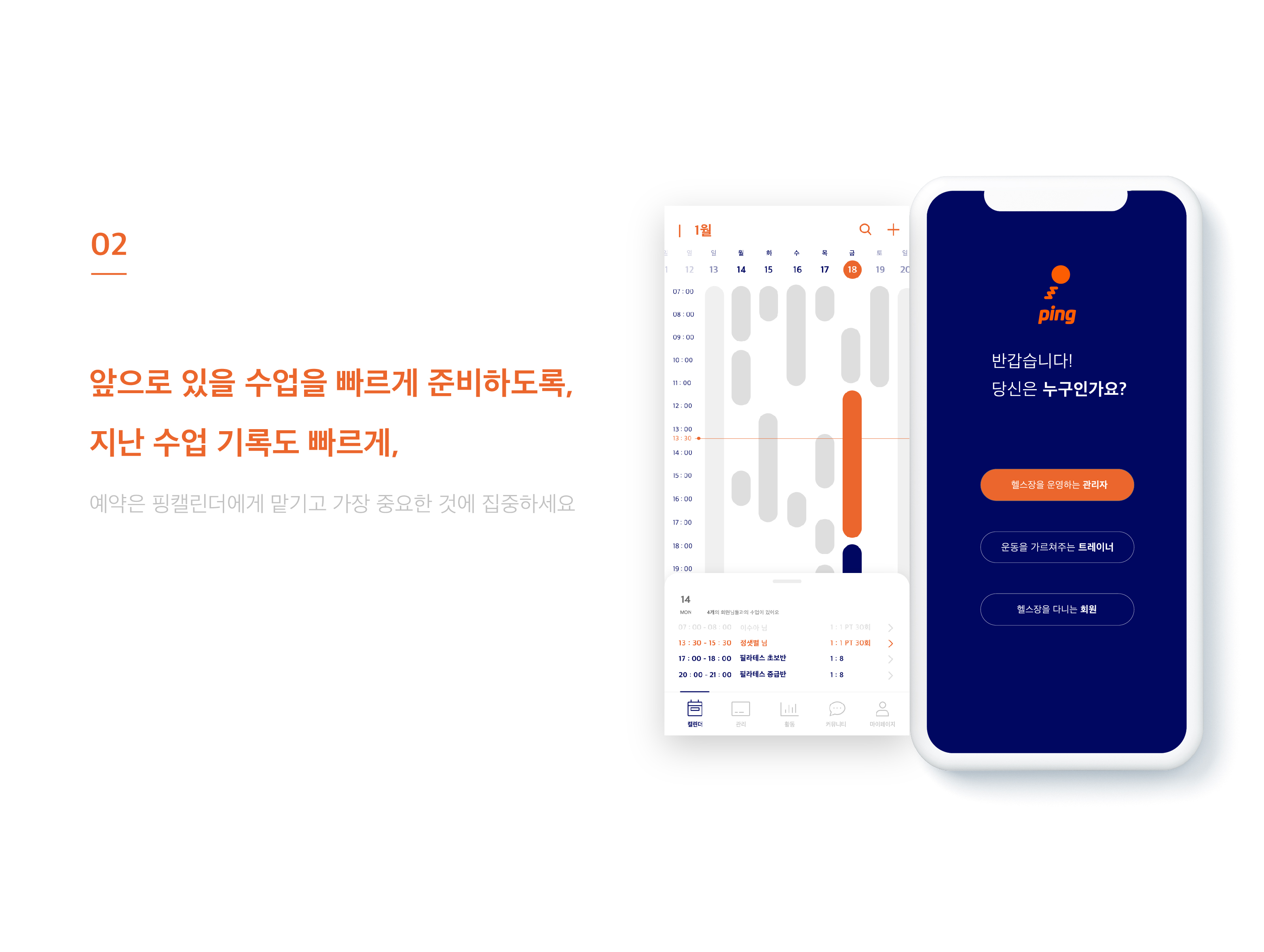 나에게 맞는 핑캘린더로 사용하자 ! 사용자에게 가장 편리한 예약방법으로 제공하는 핑캘린더로 앱을 재구성해보았다. 사용하는 사용자에게 맞춰서 앱의 사용기능이 변경된다. 또한 앞으로 있을 수업을 빠르게 준비하도록, 지난 수업 기록도 빠르게 볼 수 있도록 구성하며 현재 시간과 진행중인 수업의 진도 및 스케쥴을 한 눈에 알아볼 수 있다. 회원 예약과 개인 일정 또한 보다 빠르고 편리하게 예약하도록 리디자인 하였다.