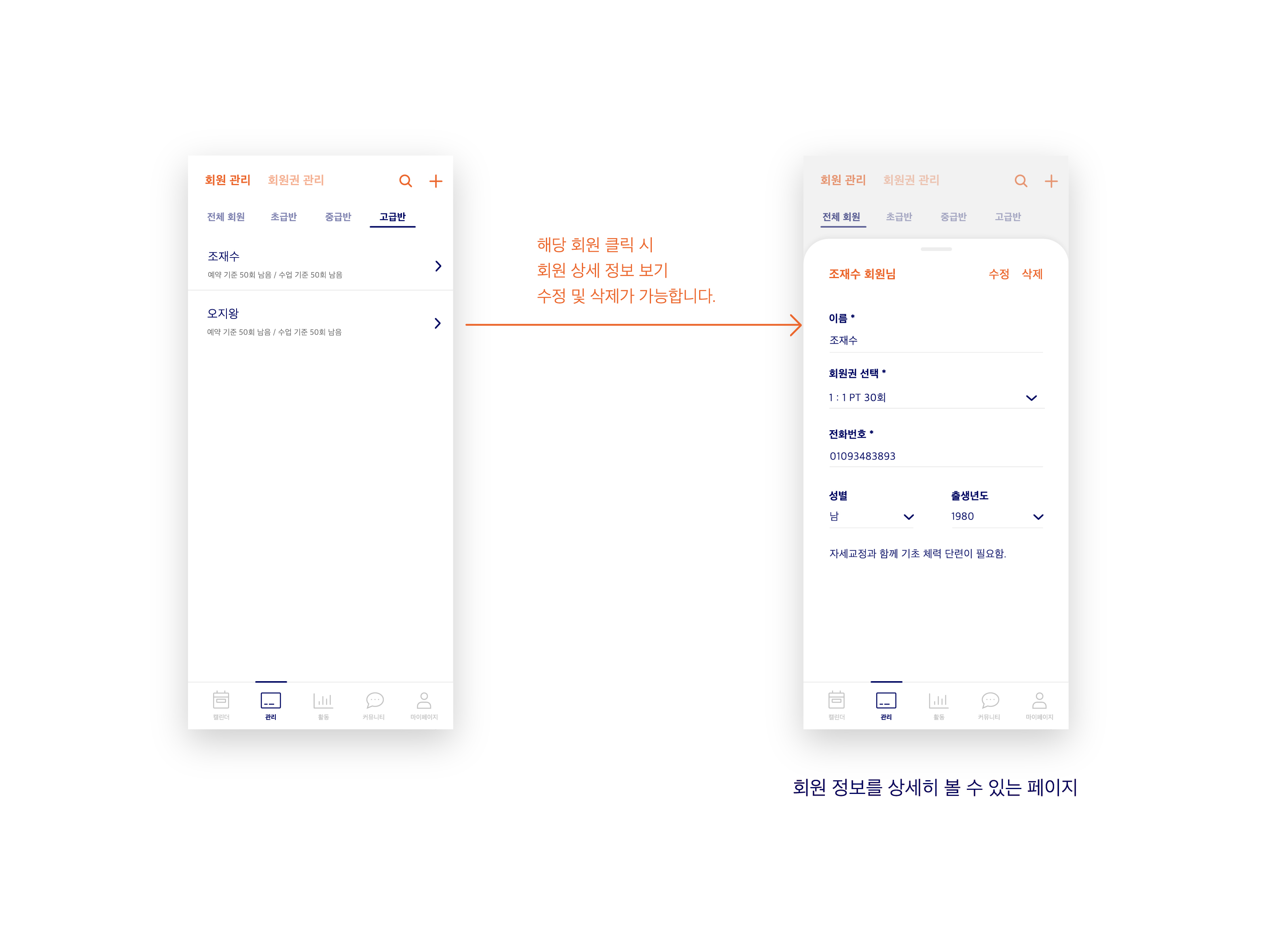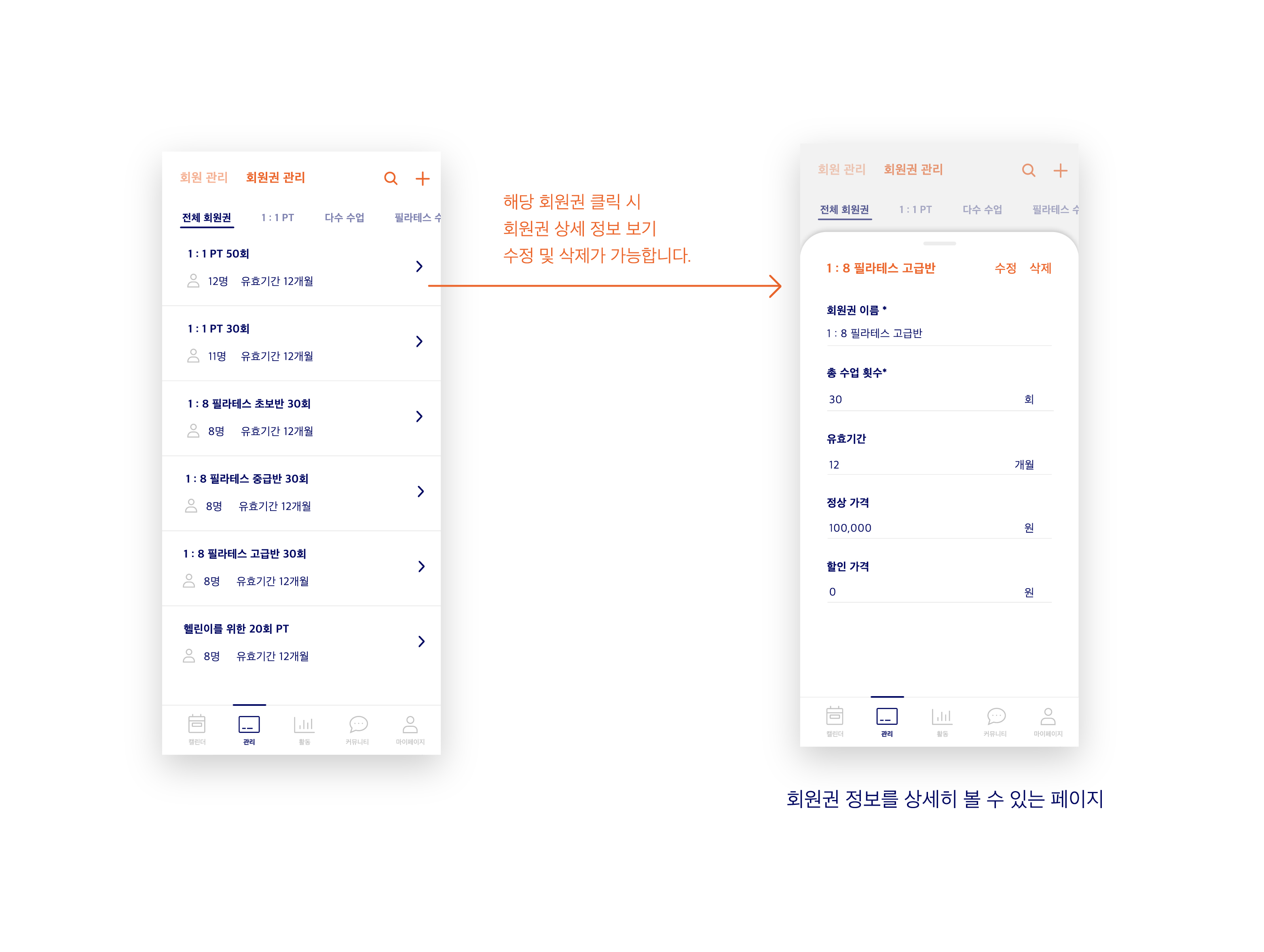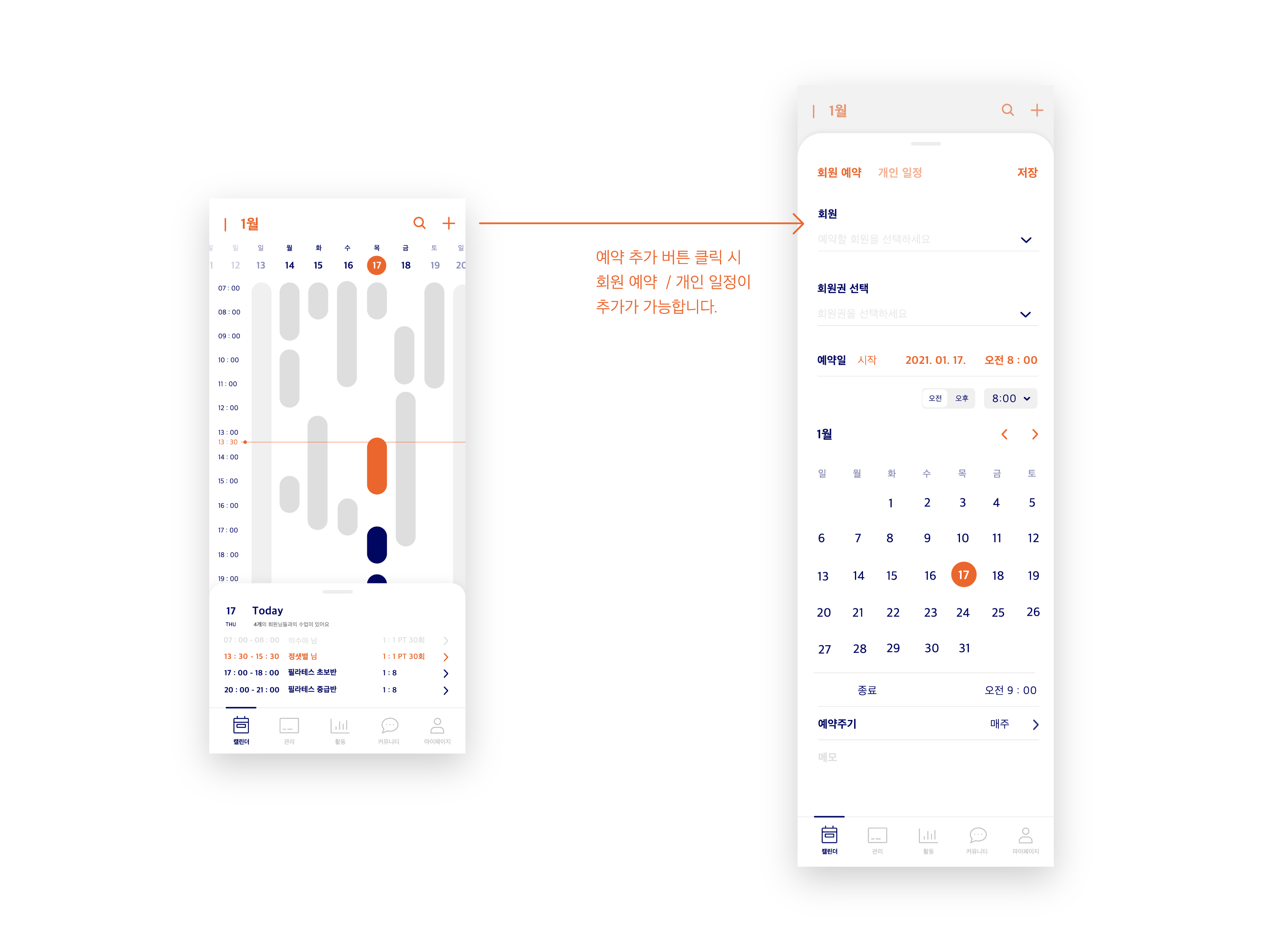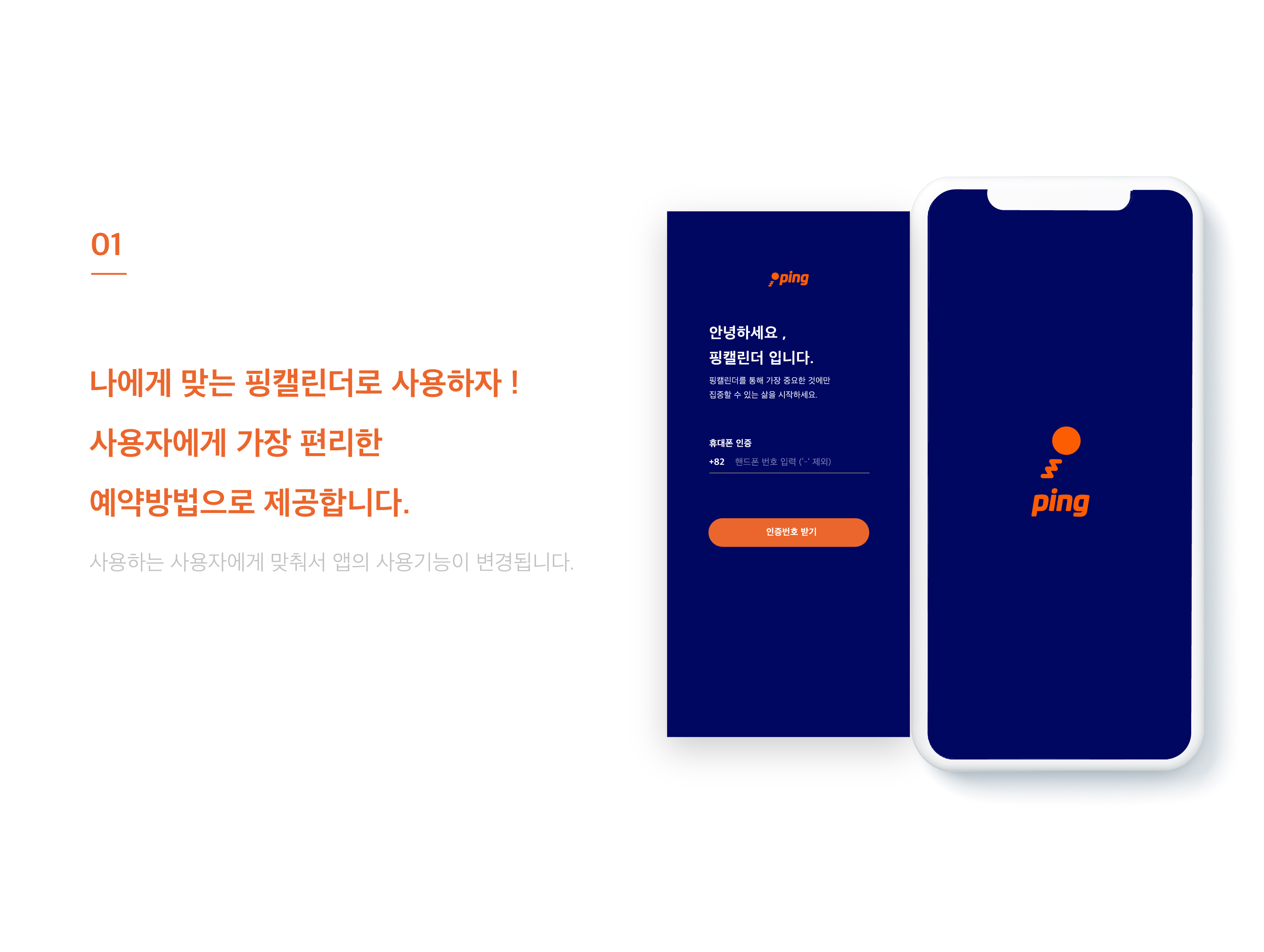나에게 맞는 핑캘린더로 사용하자 ! 사용자에게 가장 편리한 예약방법으로 제공하는 핑캘린더로 앱을 재구성해보았다. 사용하는 사용자에게 맞춰서 앱의 사용기능이 변경된다. 또한 앞으로 있을 수업을 빠르게 준비하도록, 지난 수업 기록도 빠르게 볼 수 있도록 구성하며 현재 시간과 진행중인 수업의 진도 및 스케쥴을 한 눈에 알아볼 수 있다. 회원 예약과 개인 일정 또한 보다 빠르고 편리하게 예약하도록 리디자인 하였다.