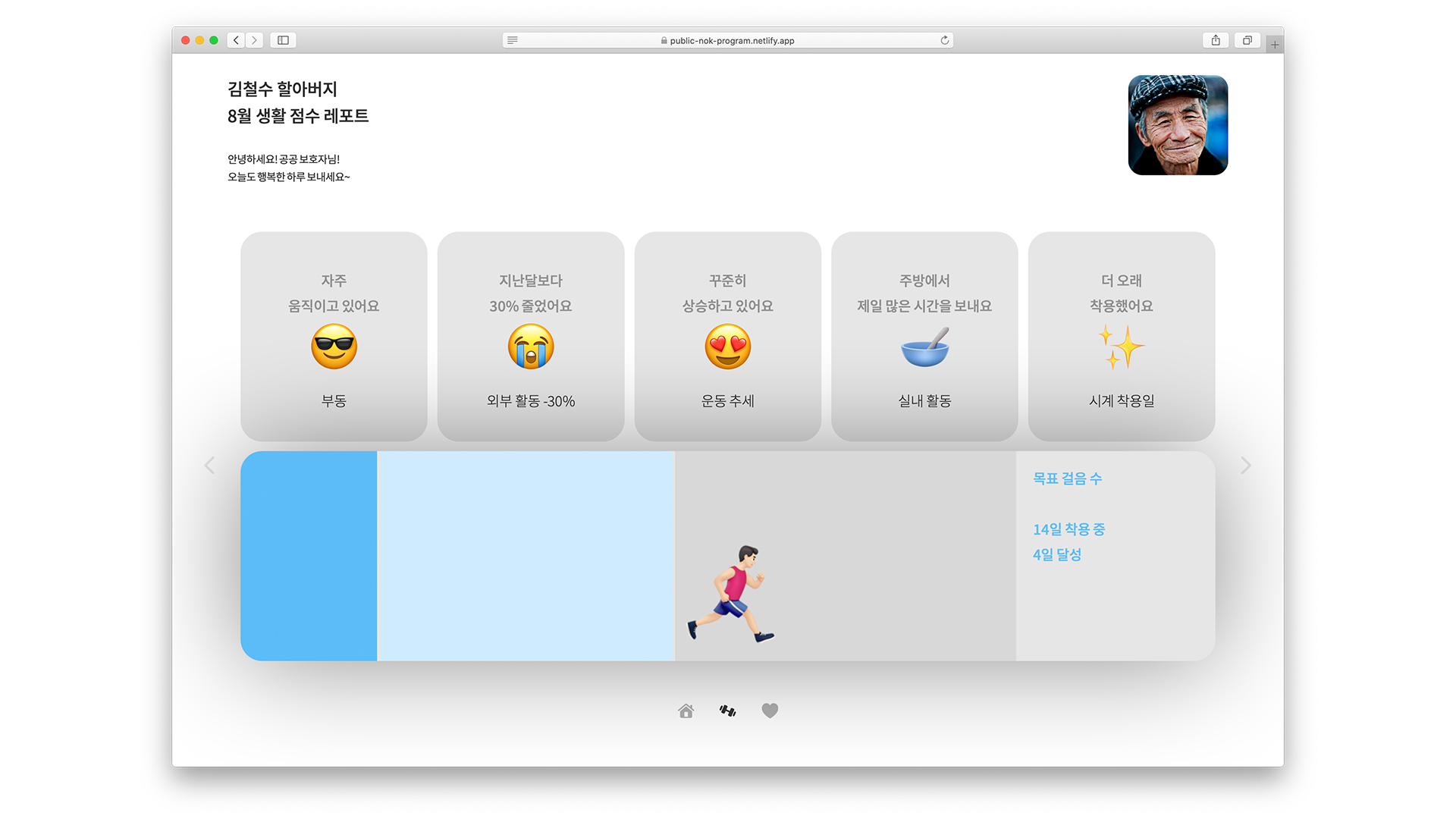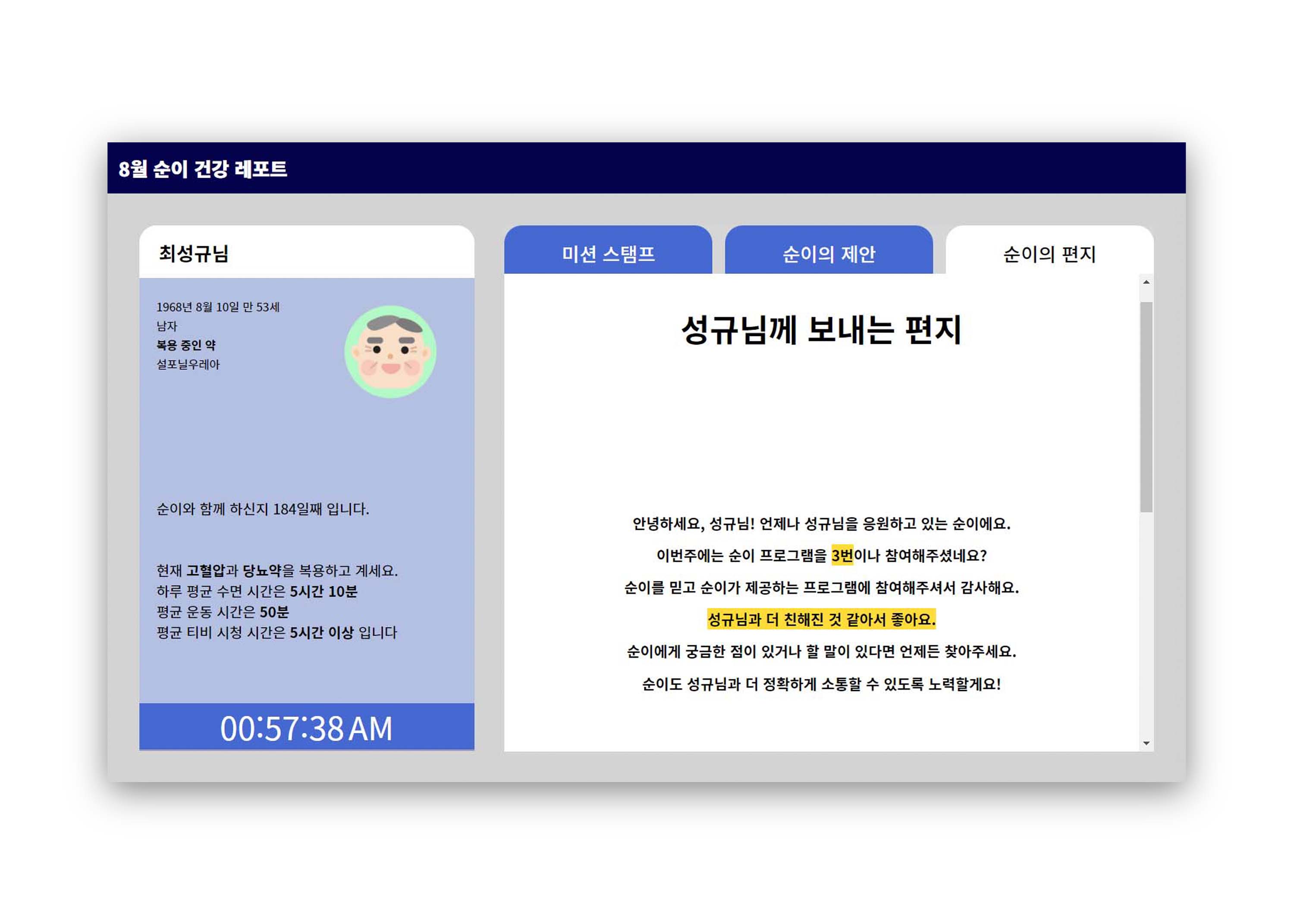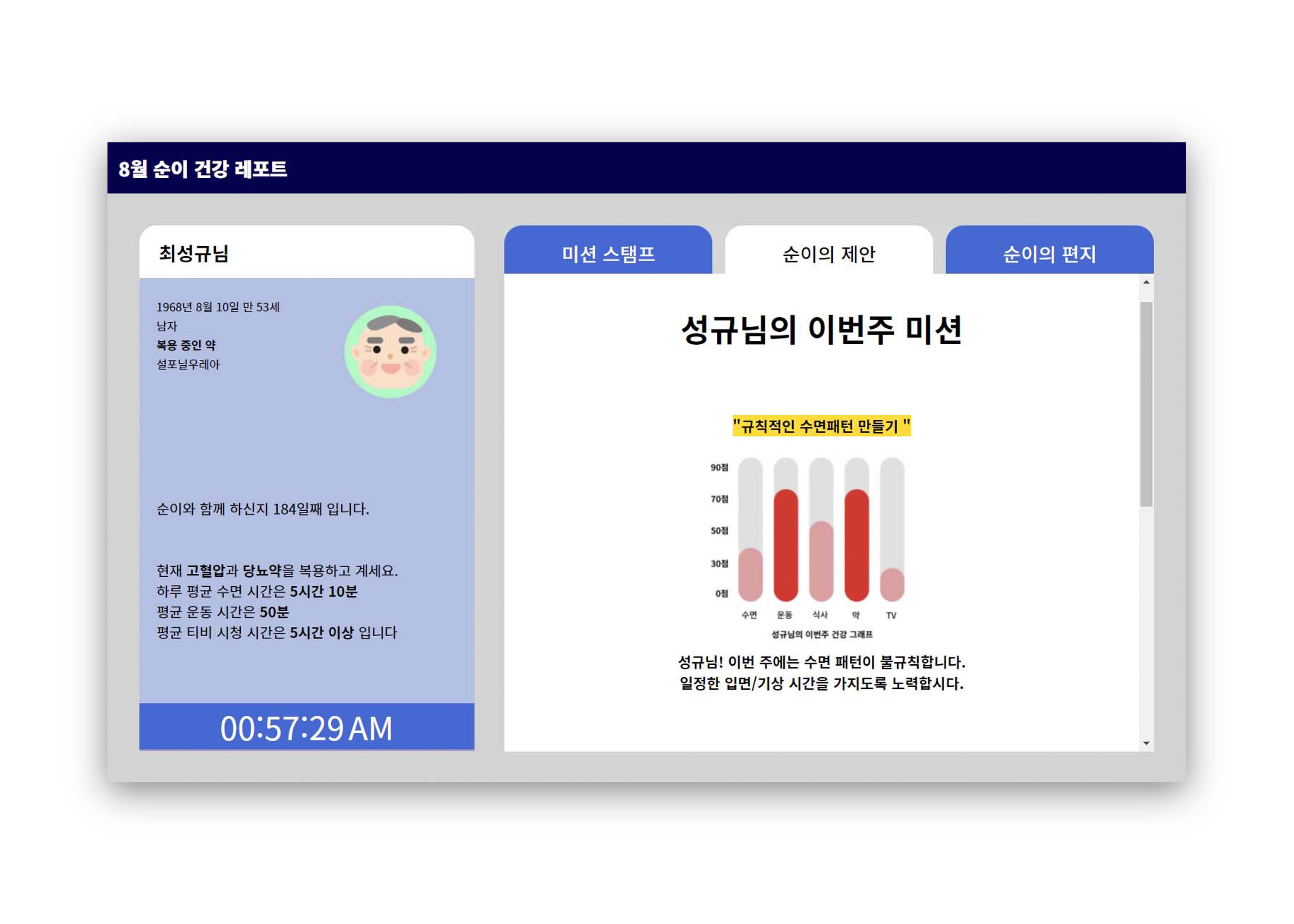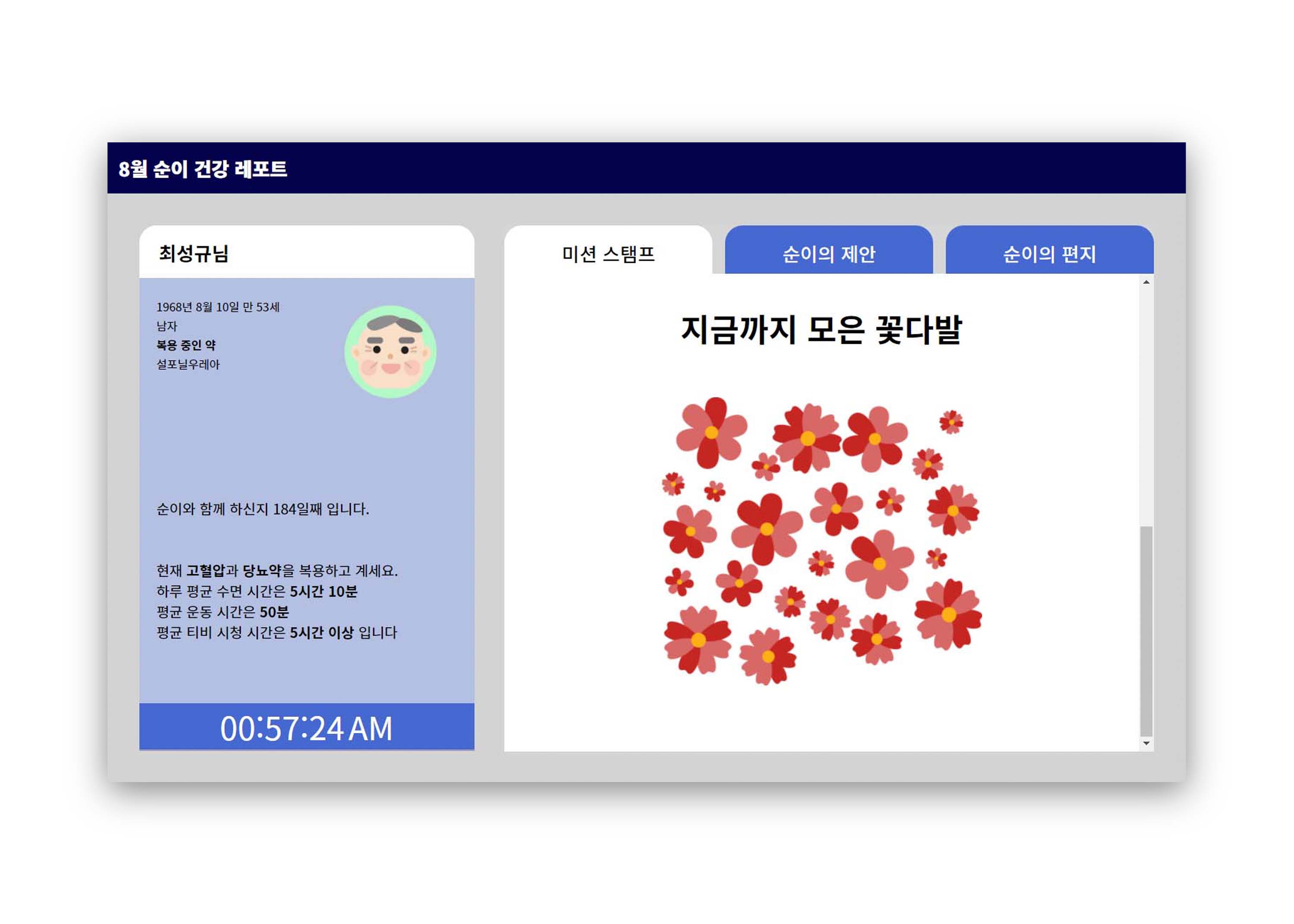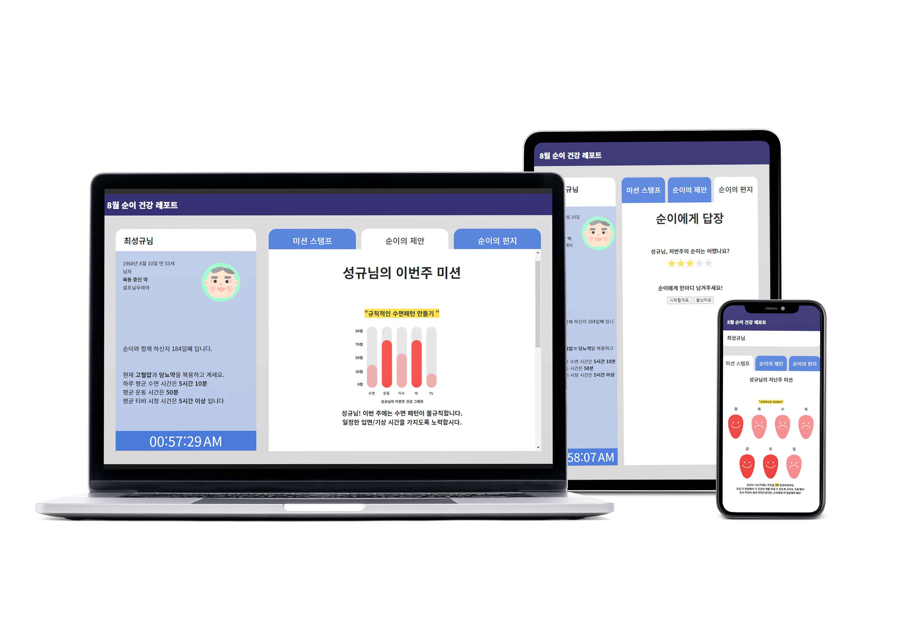 [순이 건강 레포트]는 홀로 사는 어르신들의 말동무이자 생활 지킴이 '순이'가 수집한 어르신들의 데이터를 분석하여 시각화한 웹 리포트로, PC와 모바일에서 확인 할 수 있다.