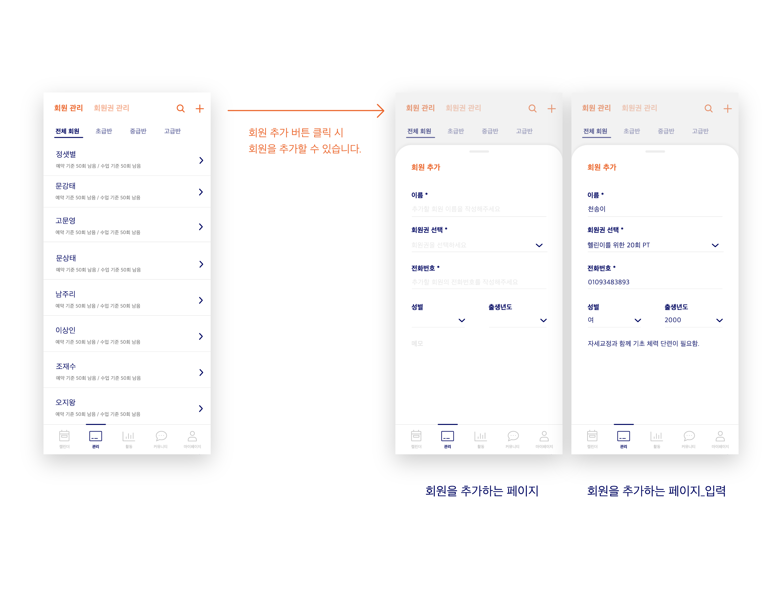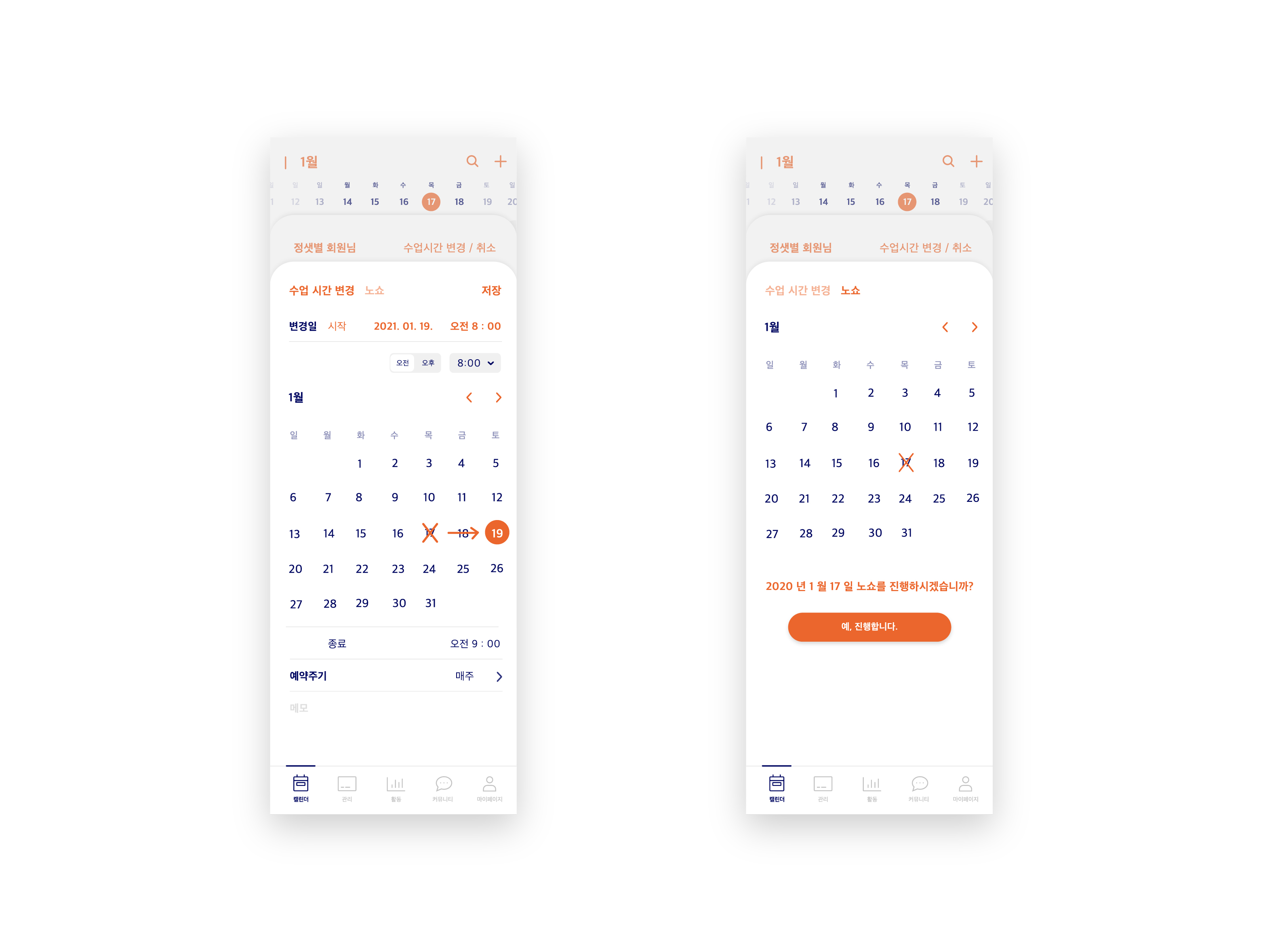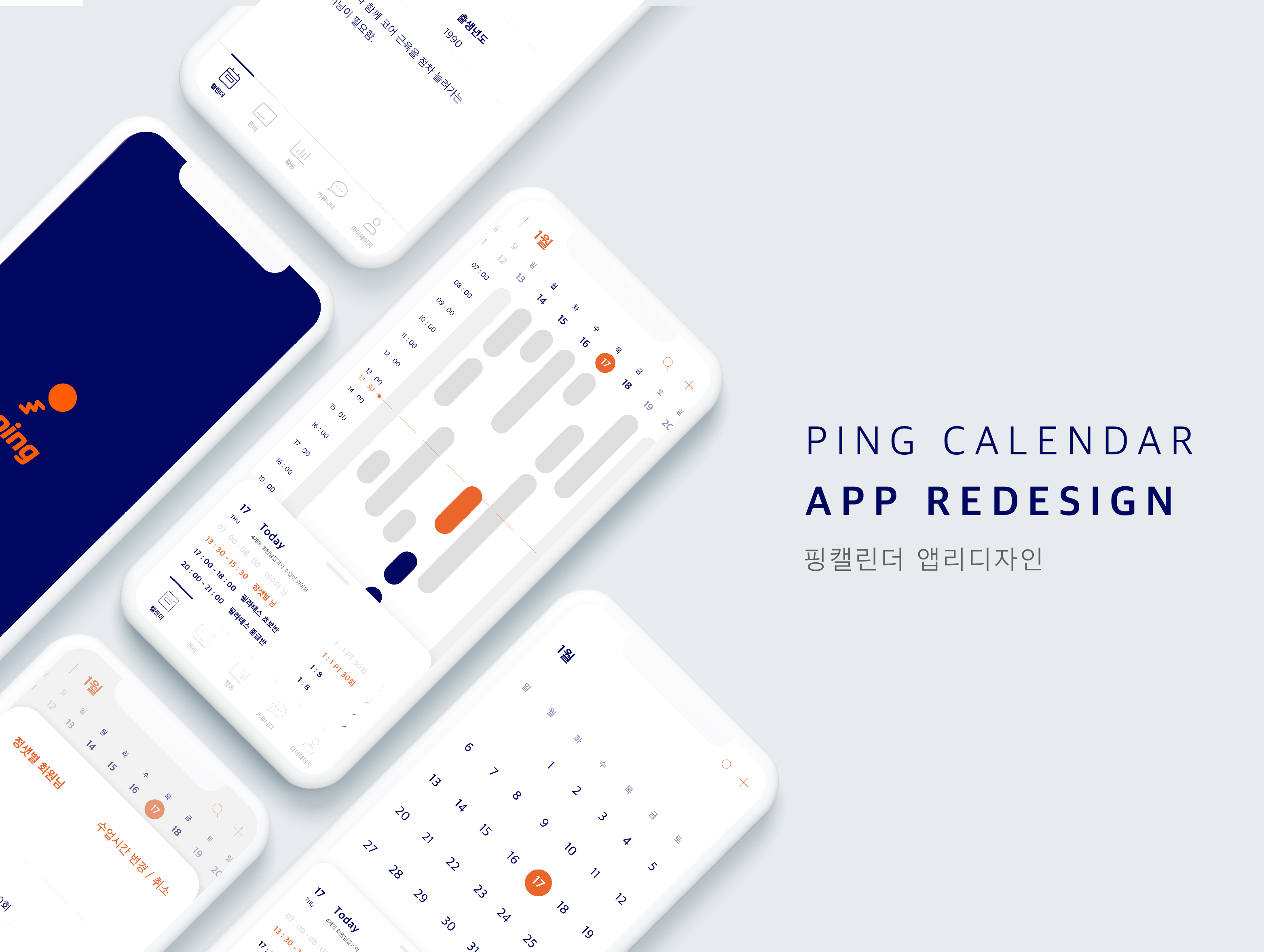 나에게 맞는 핑캘린더로 사용하자 ! 사용자에게 가장 편리한 예약방법으로 제공하는 핑캘린더로 앱을 재구성해보았다. 사용하는 사용자에게 맞춰서 앱의 사용기능이 변경된다. 또한 앞으로 있을 수업을 빠르게 준비하도록, 지난 수업 기록도 빠르게 볼 수 있도록 구성하며 현재 시간과 진행중인 수업의 진도 및 스케쥴을 한 눈에 알아볼 수 있다. 회원 예약과 개인 일정 또한 보다 빠르고 편리하게 예약하도록 리디자인 하였다. 임선영 7bcbc@naver.com