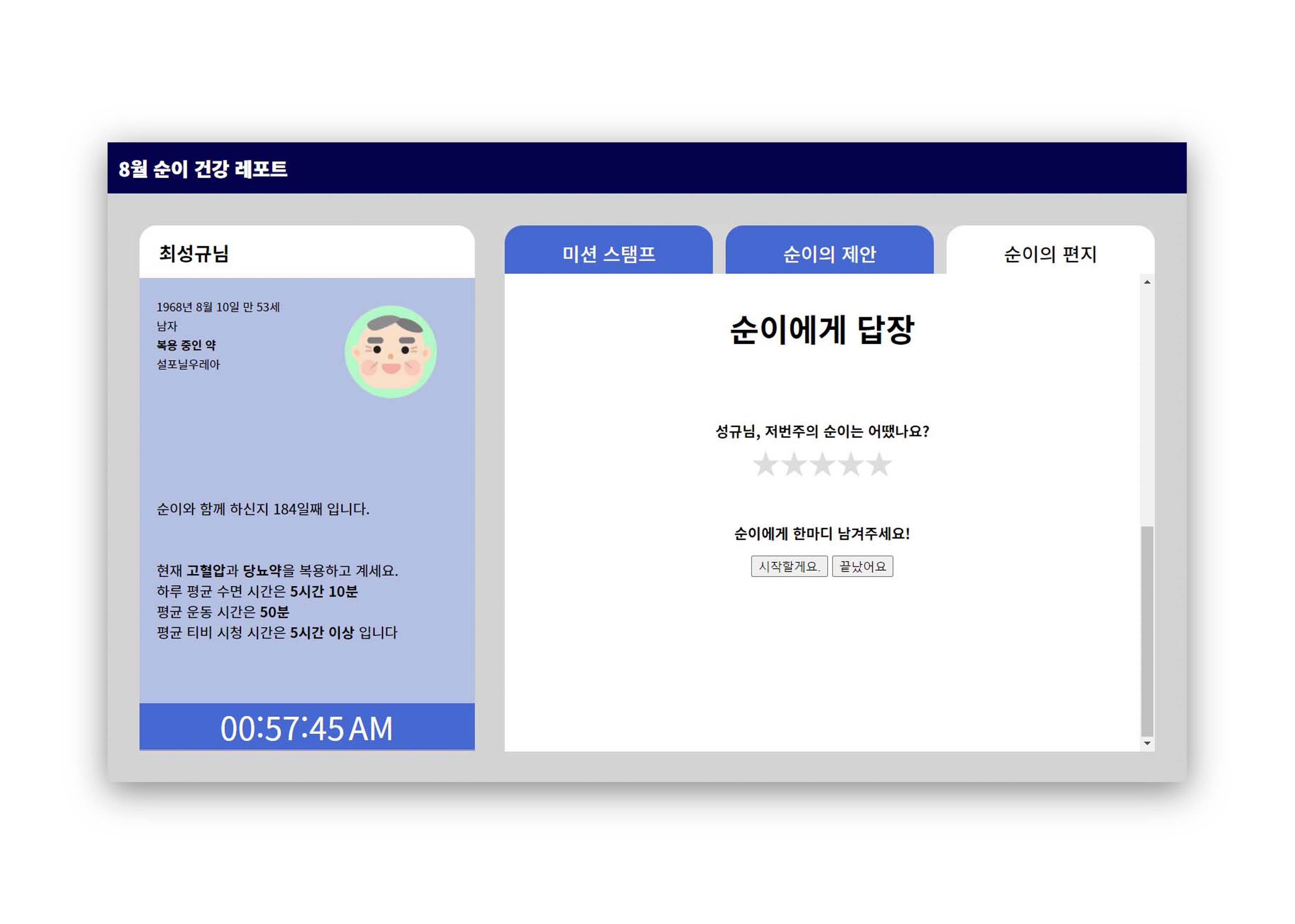 분석한 데이터를 바탕으로 어르신의 생활을 개선할 수 있는 '미션'을 제안하고, 지나간 미션은 '꽃'이 되어 모인다. 일주일동안 모인 순이와의 인터렉션 데이터를 기반으로 '순이의 편지'를 제공한다. '순이에게 답장'을 통해 인공지능 순이의 정확도를 개선을 위한 데이터와 서비스 만족도에 대한 정보를 얻을 수 있다. 타이핑에 익숙하지 않은 어르신들을 고려하여 'STT'를 통해 순이에게 말을 건네는 방식으로 구성하였다.