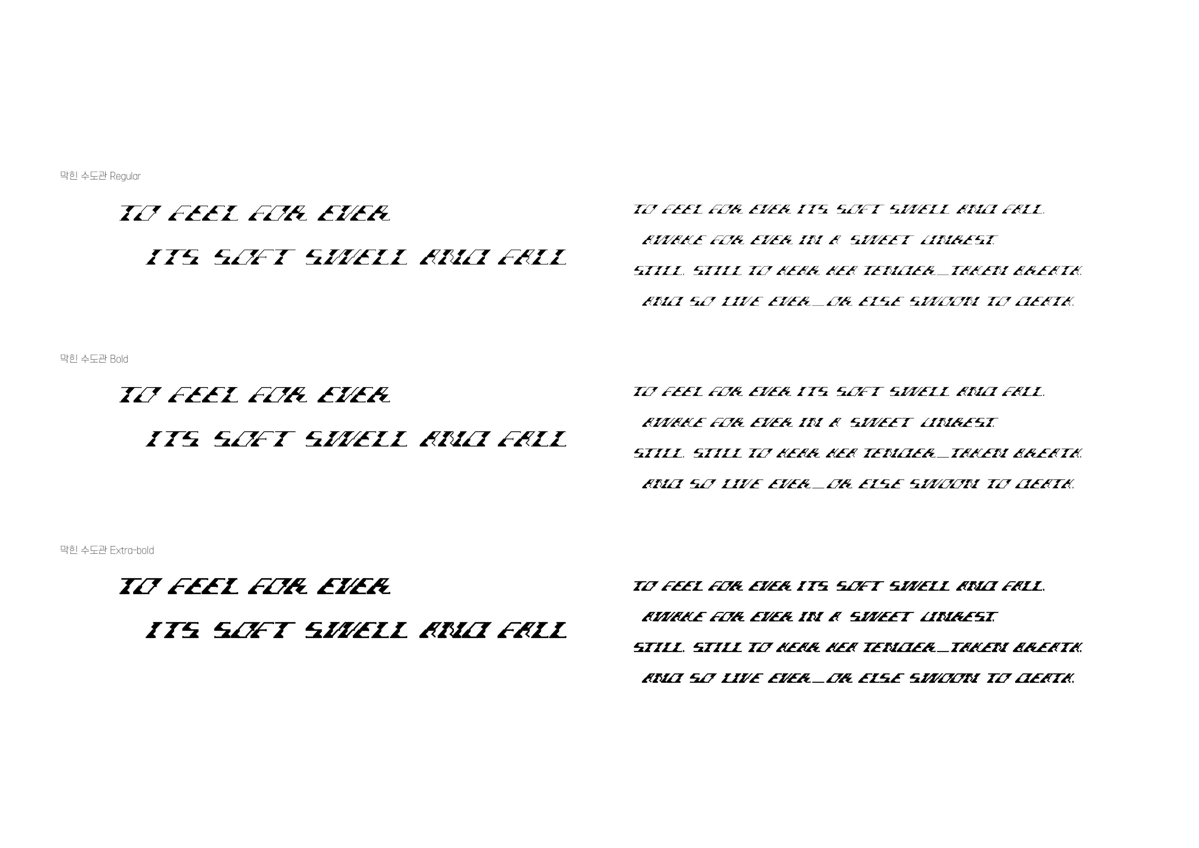 영문 활자체 는 의사를 강력하게 전달하는 활자체다. 굵은 획과 꽉 차는 검은 영역이 묵직하고 예민한 인상을 완성한다. 이름도 그에 맞게 '폭동'으로 지어주었다. 최희정 교수님이 추천해주신 활자체 이름이었다. 라틴 영문 글리프를 모두 지원하지만, 대소문자를 통일, 혼합하여 개발했다. 세세한 수정을 거친 후에 배포할 예정이다.