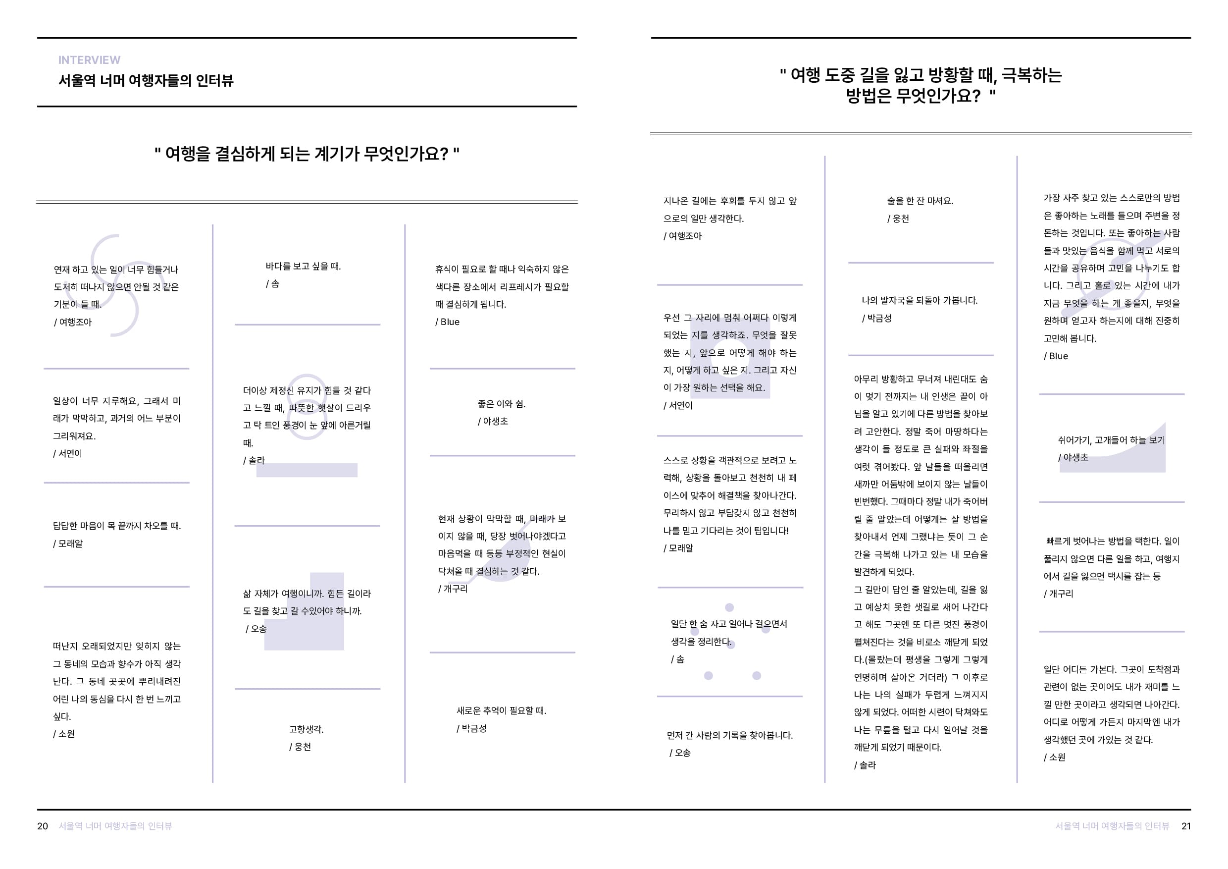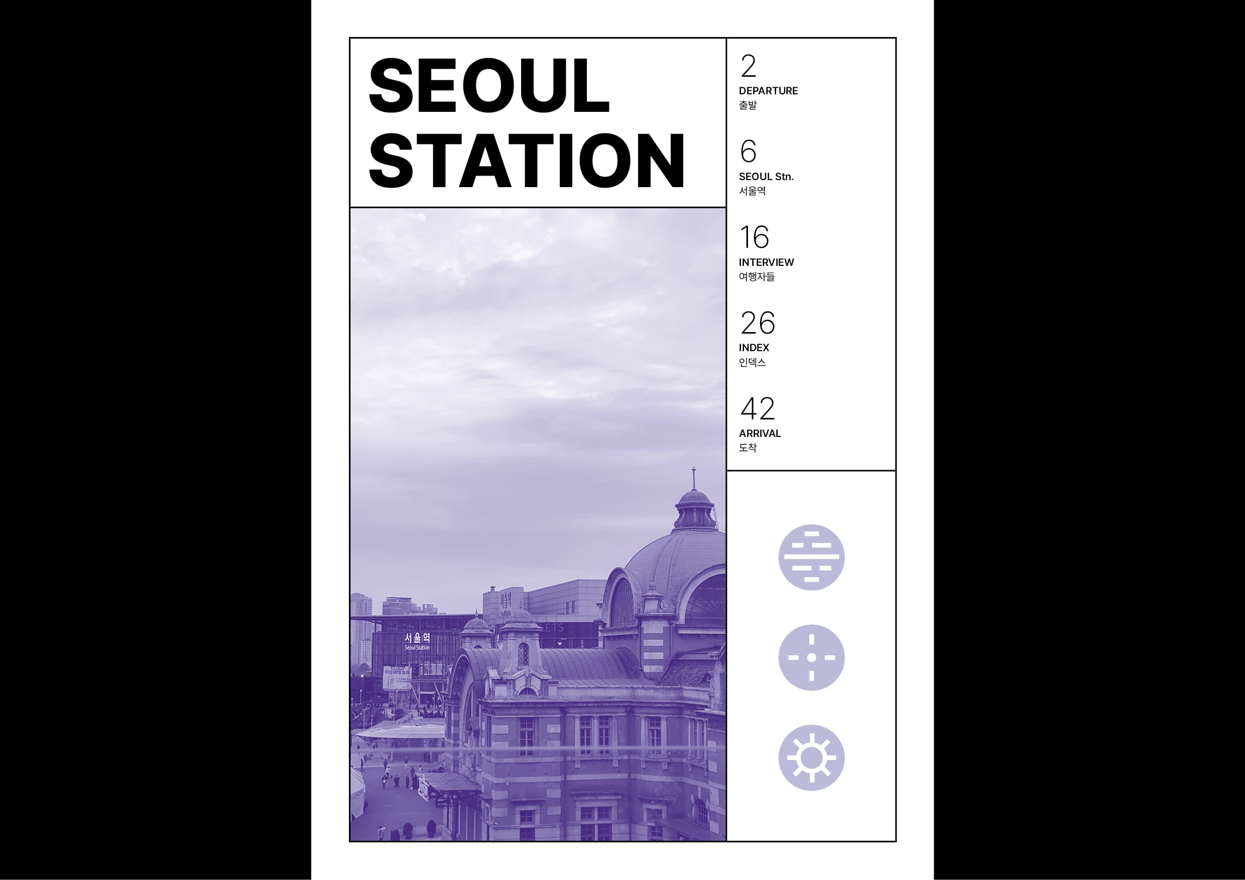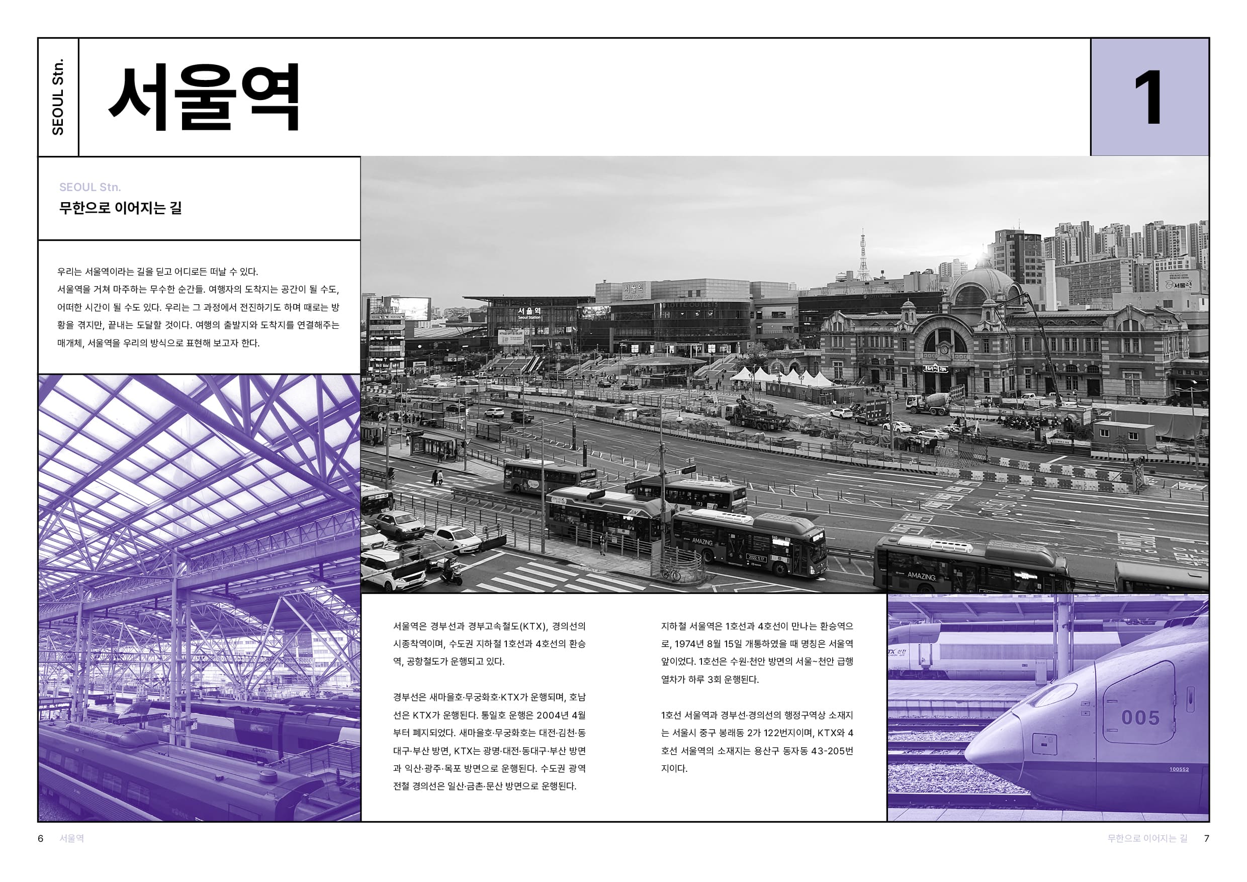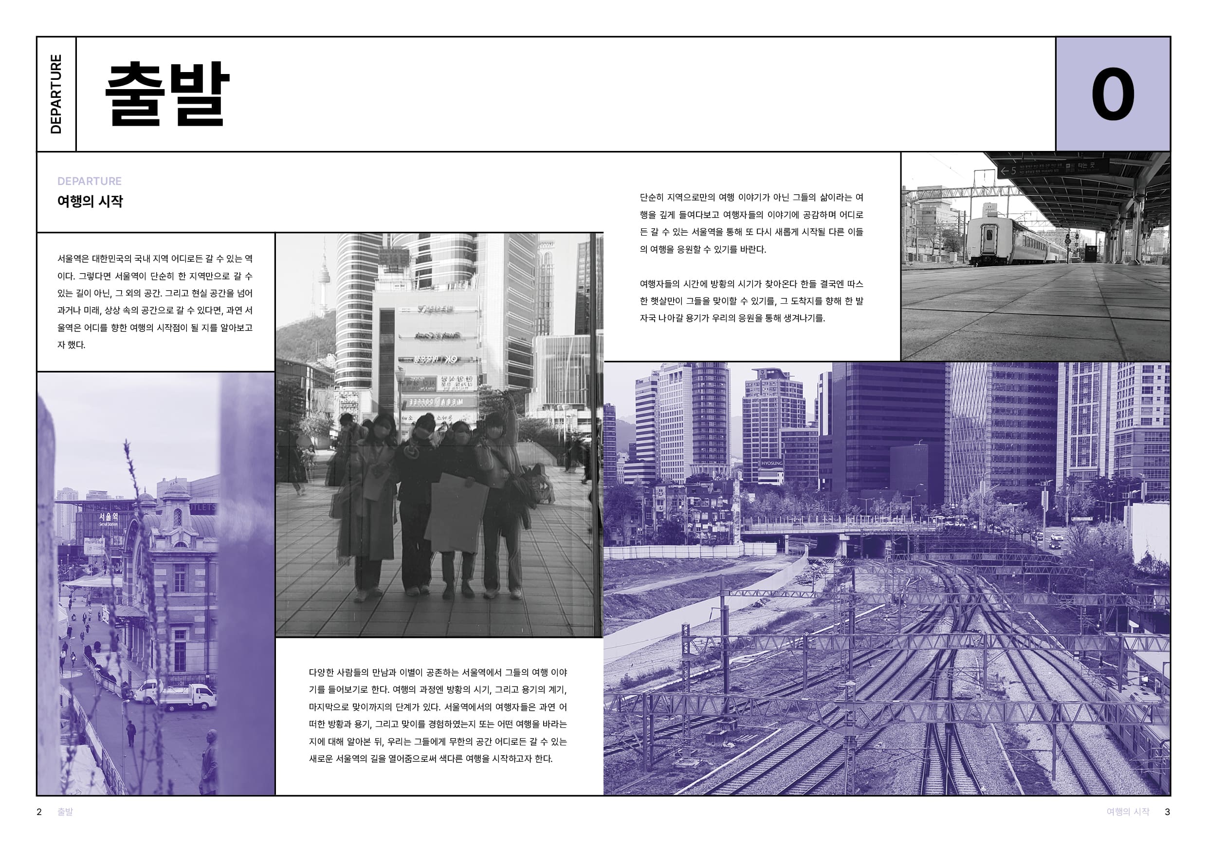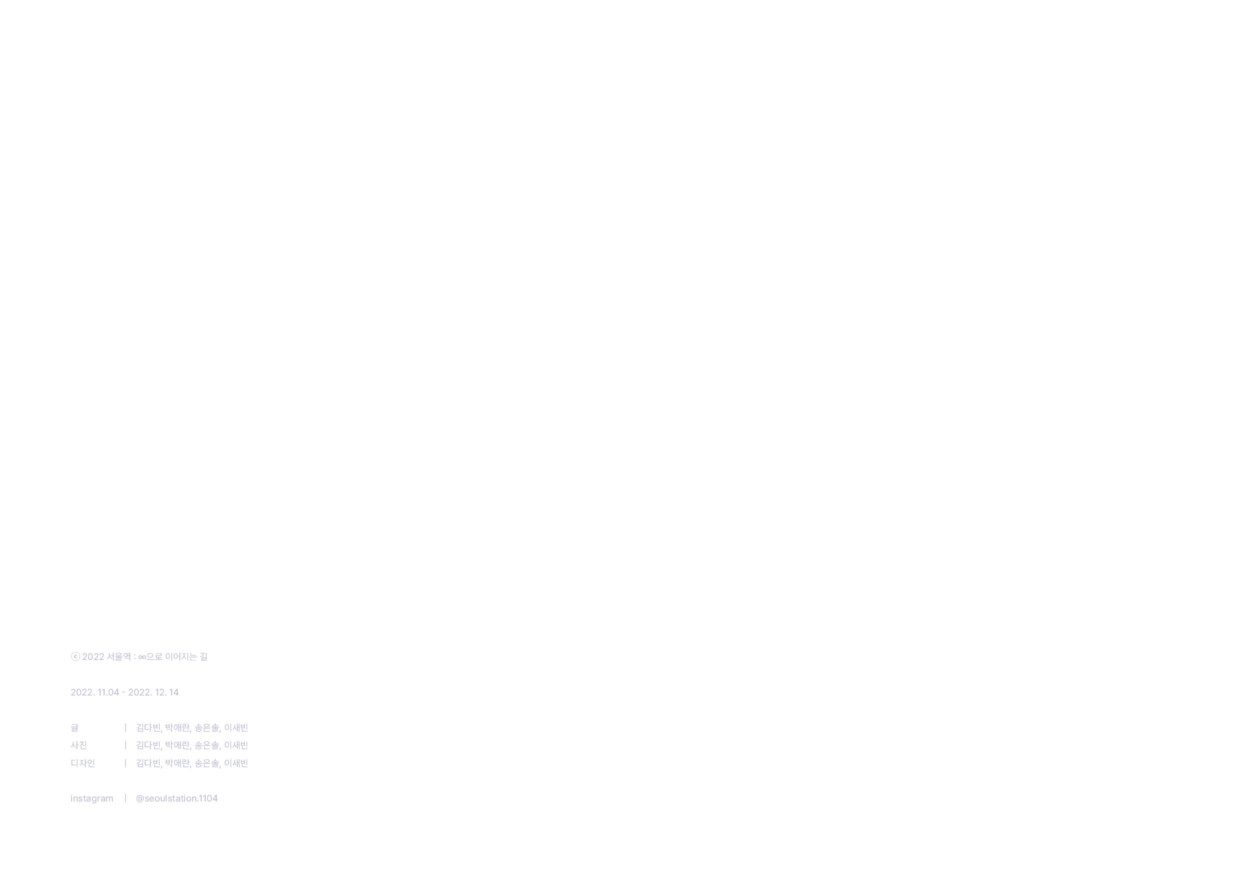 우리는 서울역이라는 길을 딛고 어디로든 떠날 수 있다. 서울역을 거쳐 마주하는 무수한 순간들. 여행자의 도착지는 공간이 될 수도, 어떠한 시간이 될 수도 있다. 그 과정에서 때로는 방황을 겪지만 전진하며, 끝내 도달할 것이다. 이 프로젝트를 통해 우리는 여행자들의 자유로운 여정을 위한 길을 열어주는 작업을 진행했다. @seoulstation.1104 김다빈 rla021203@gmail.com @kimmdavin 박애란 dofks1008@daum.net @victobery 송은솔 littleforest2014@naver.com @welchess 이새빈 saibin2@naver.com @p_leesaebin HTML 삽입 미리보기할 수 없는 소스