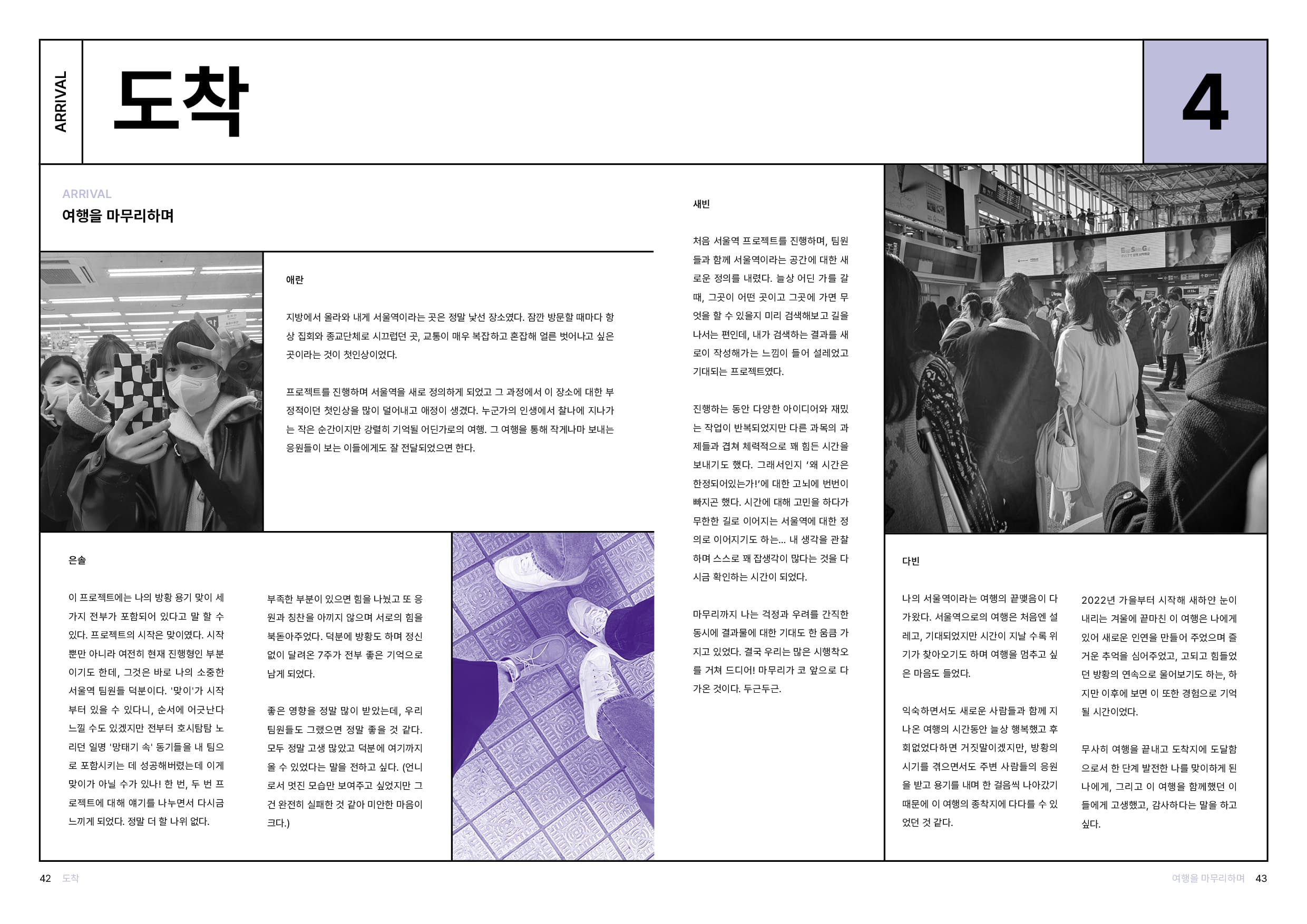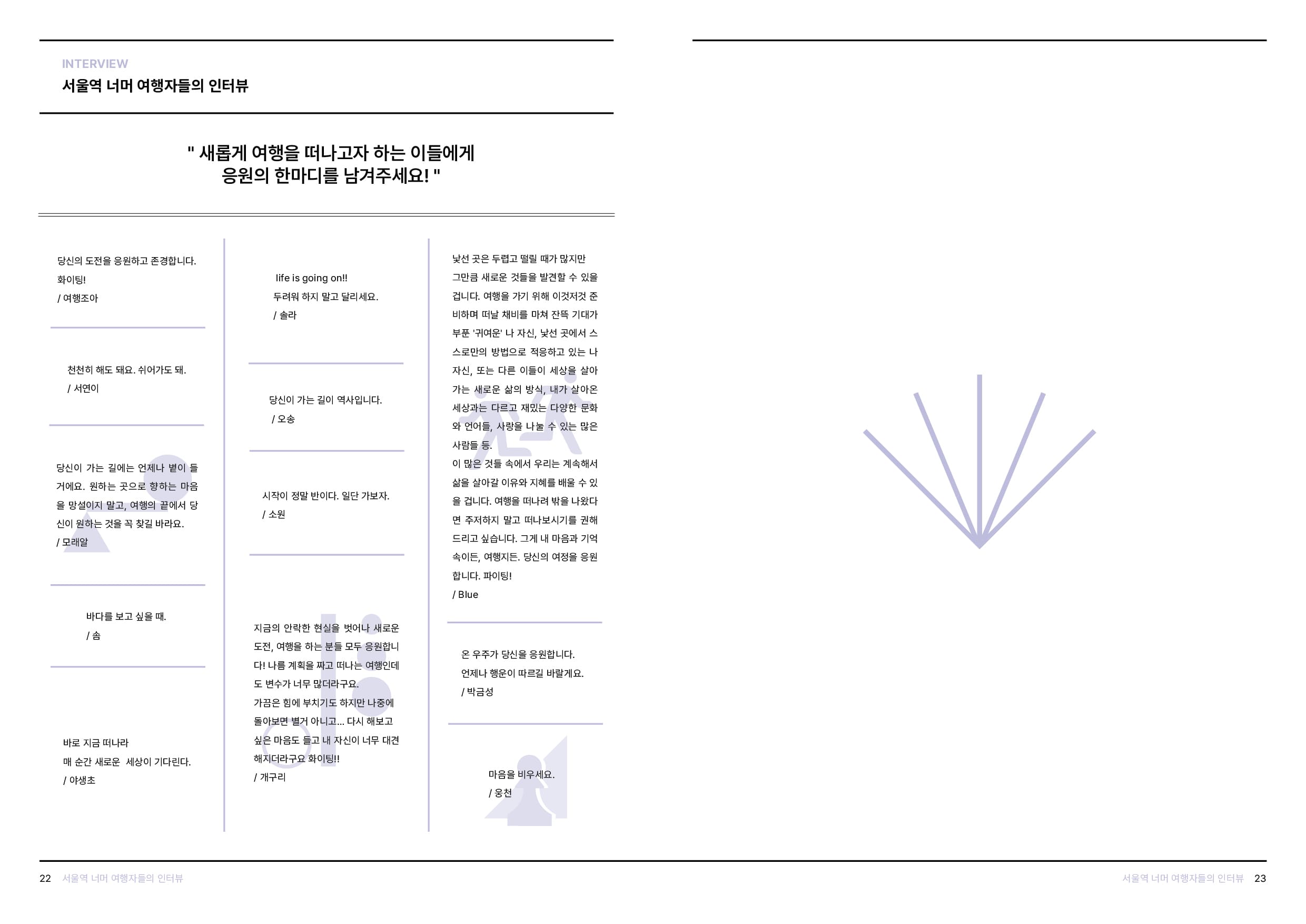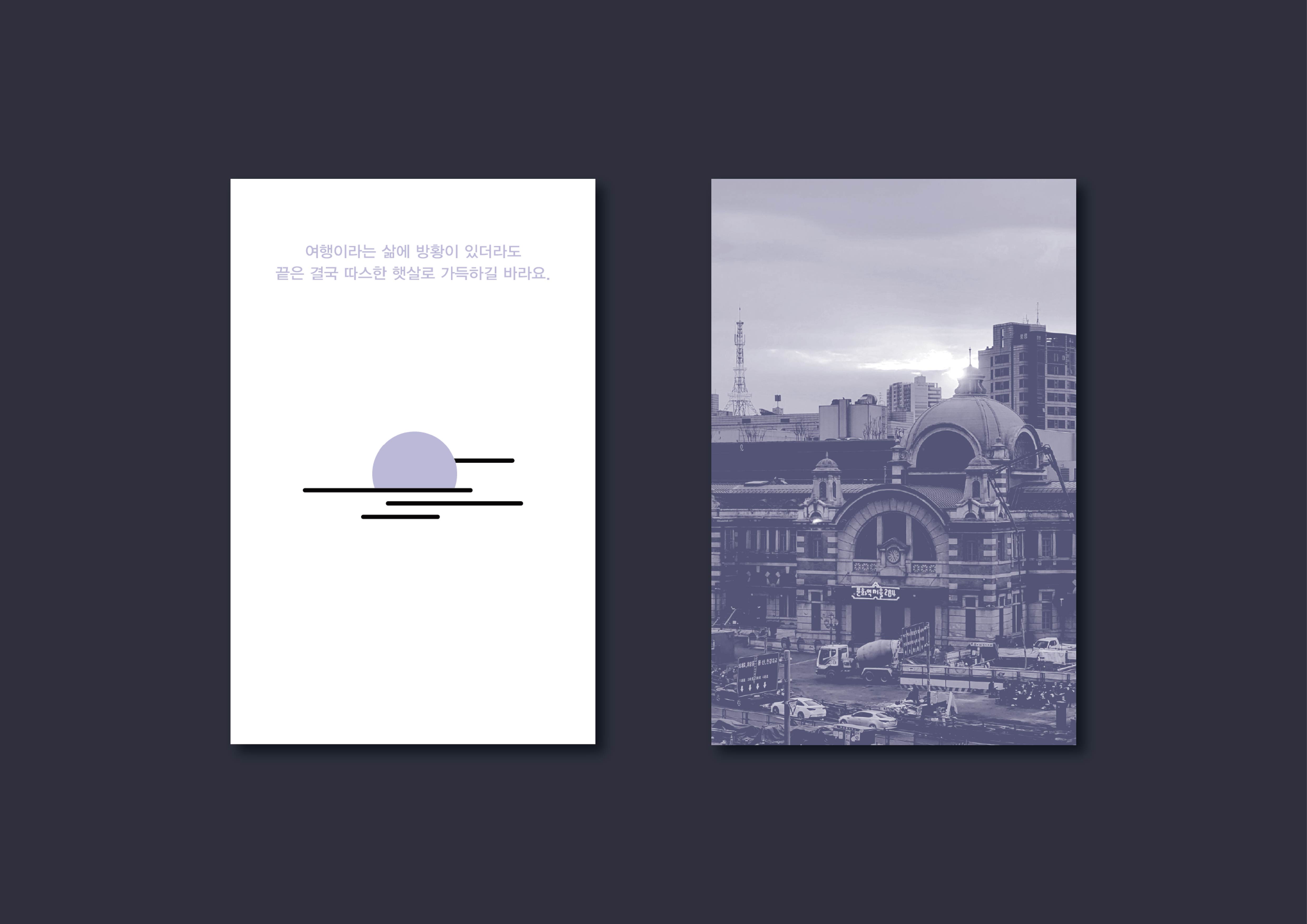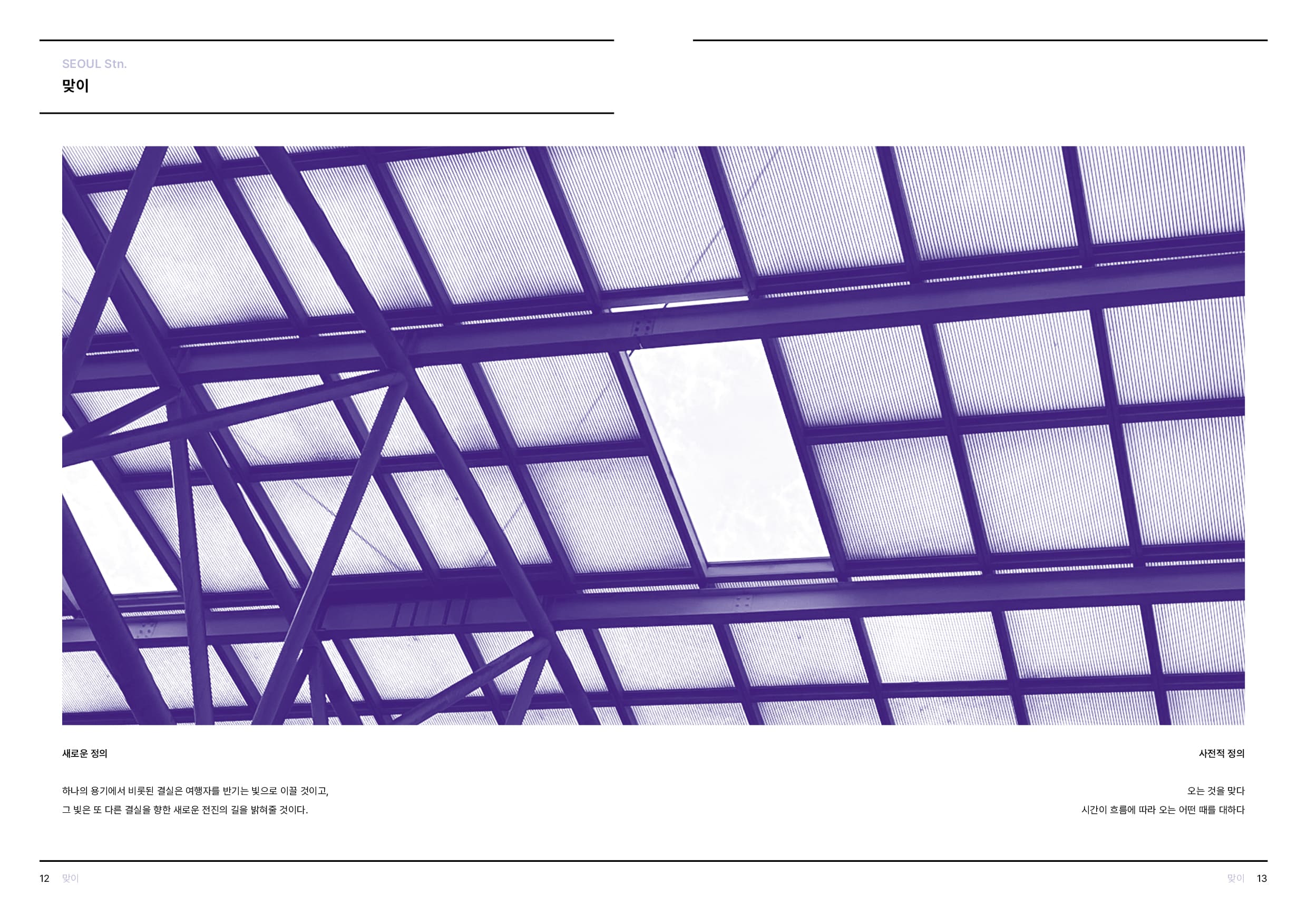 우리는 서울역이라는 길을 딛고 어디로든 떠날 수 있다. 서울역을 거쳐 마주하는 무수한 순간들. 여행자의 도착지는 공간이 될 수도, 어떠한 시간이 될 수도 있다. 그 과정에서 때로는 방황을 겪지만 전진하며, 끝내 도달할 것이다. 이 프로젝트를 통해 우리는 여행자들의 자유로운 여정을 위한 길을 열어주는 작업을 진행했다. @seoulstation.1104 김다빈 rla021203@gmail.com @kimmdavin 박애란 dofks1008@daum.net @victobery 송은솔 littleforest2014@naver.com @welchess 이새빈 saibin2@naver.com @p_leesaebin HTML 삽입 미리보기할 수 없는 소스