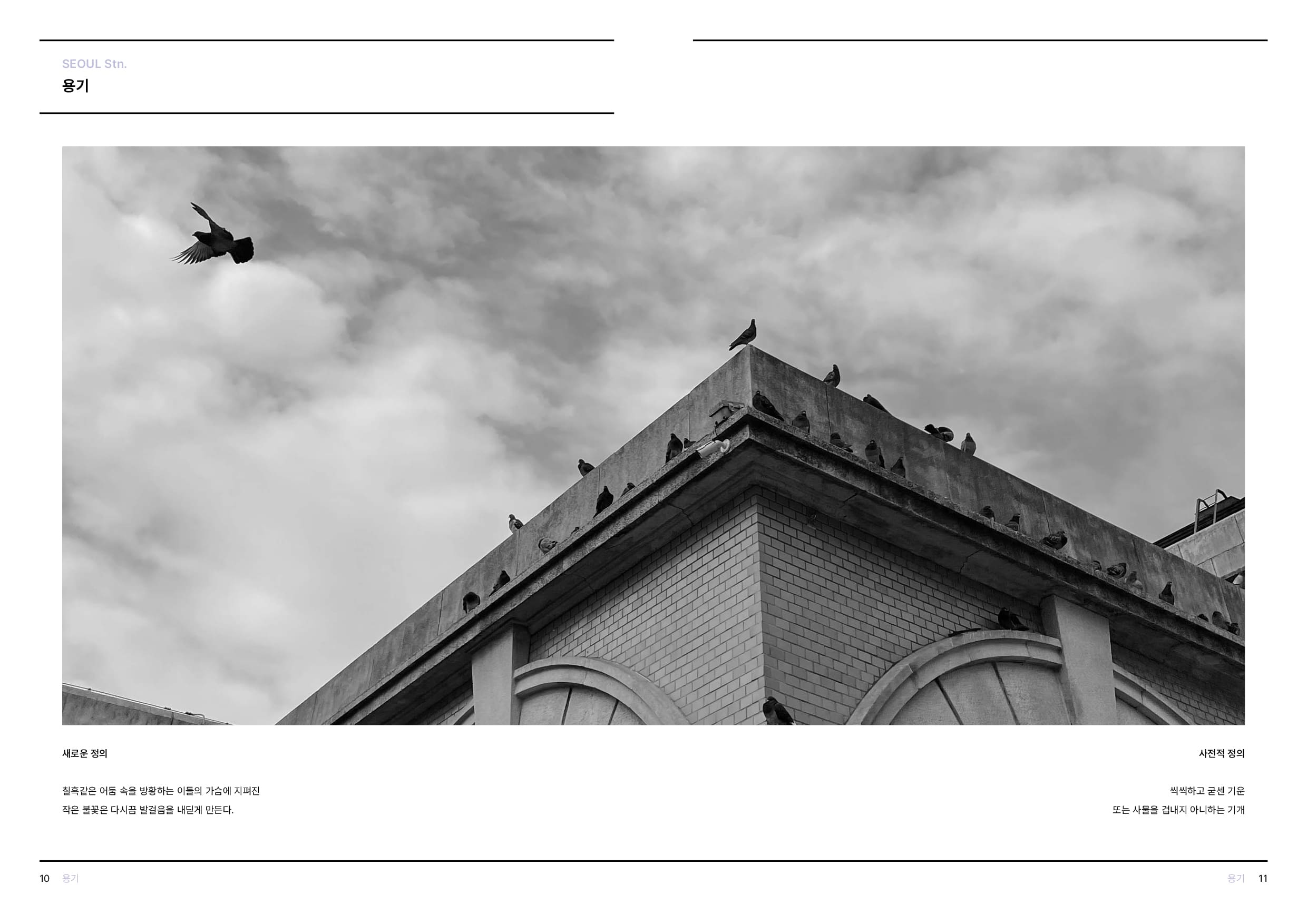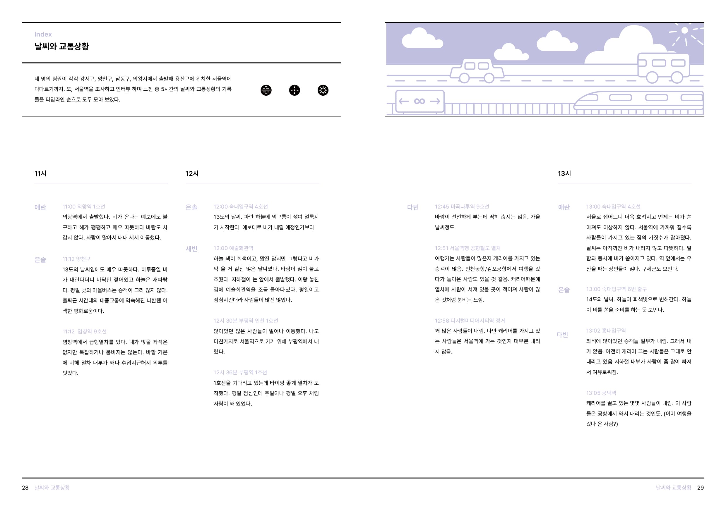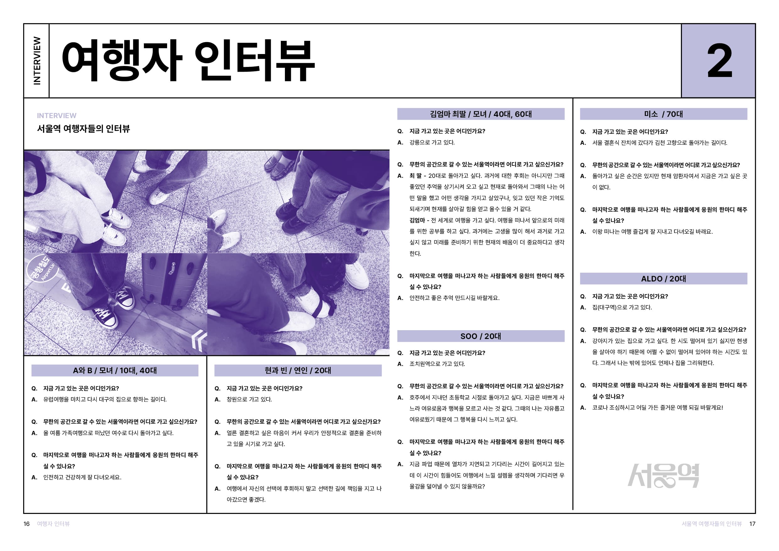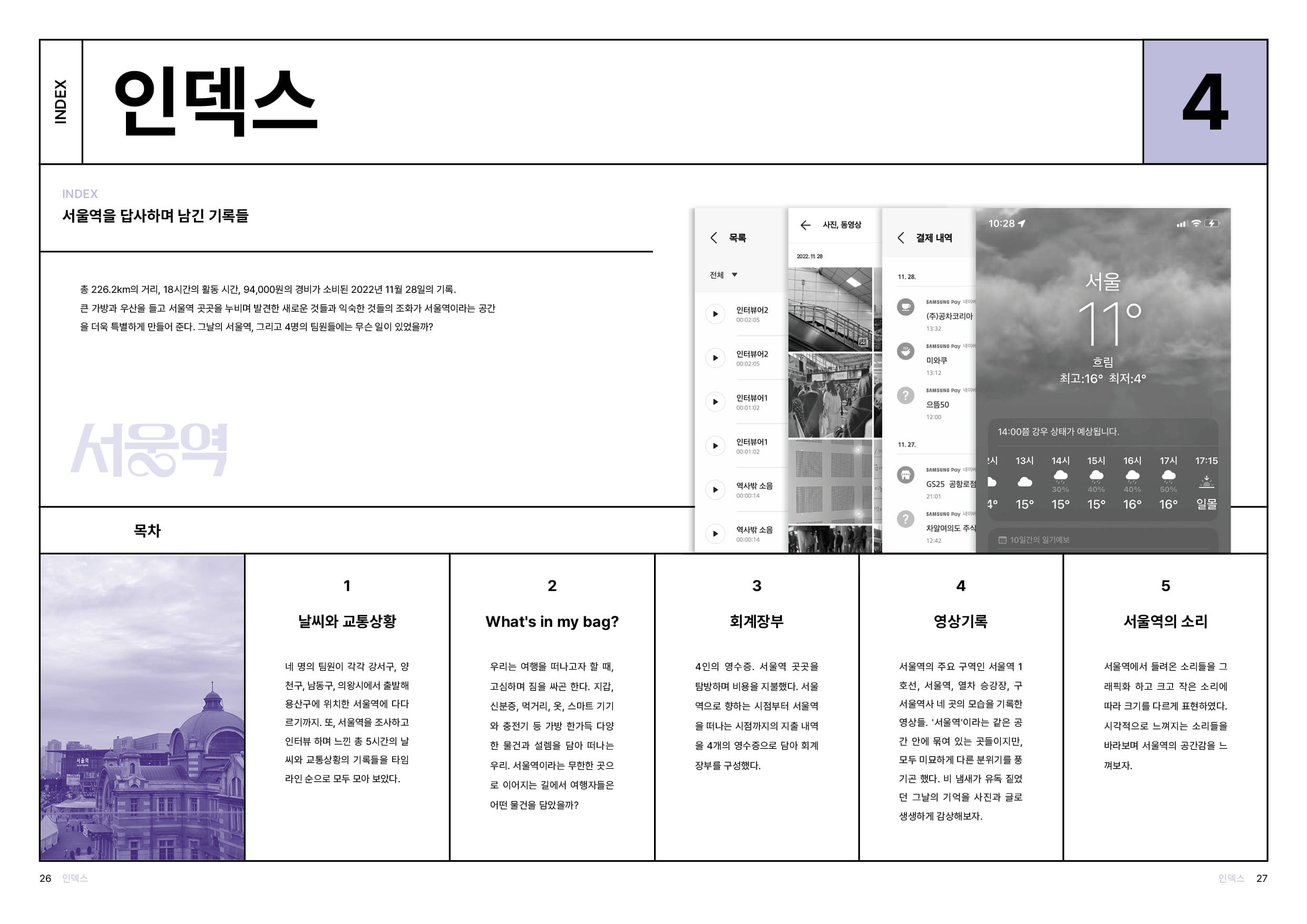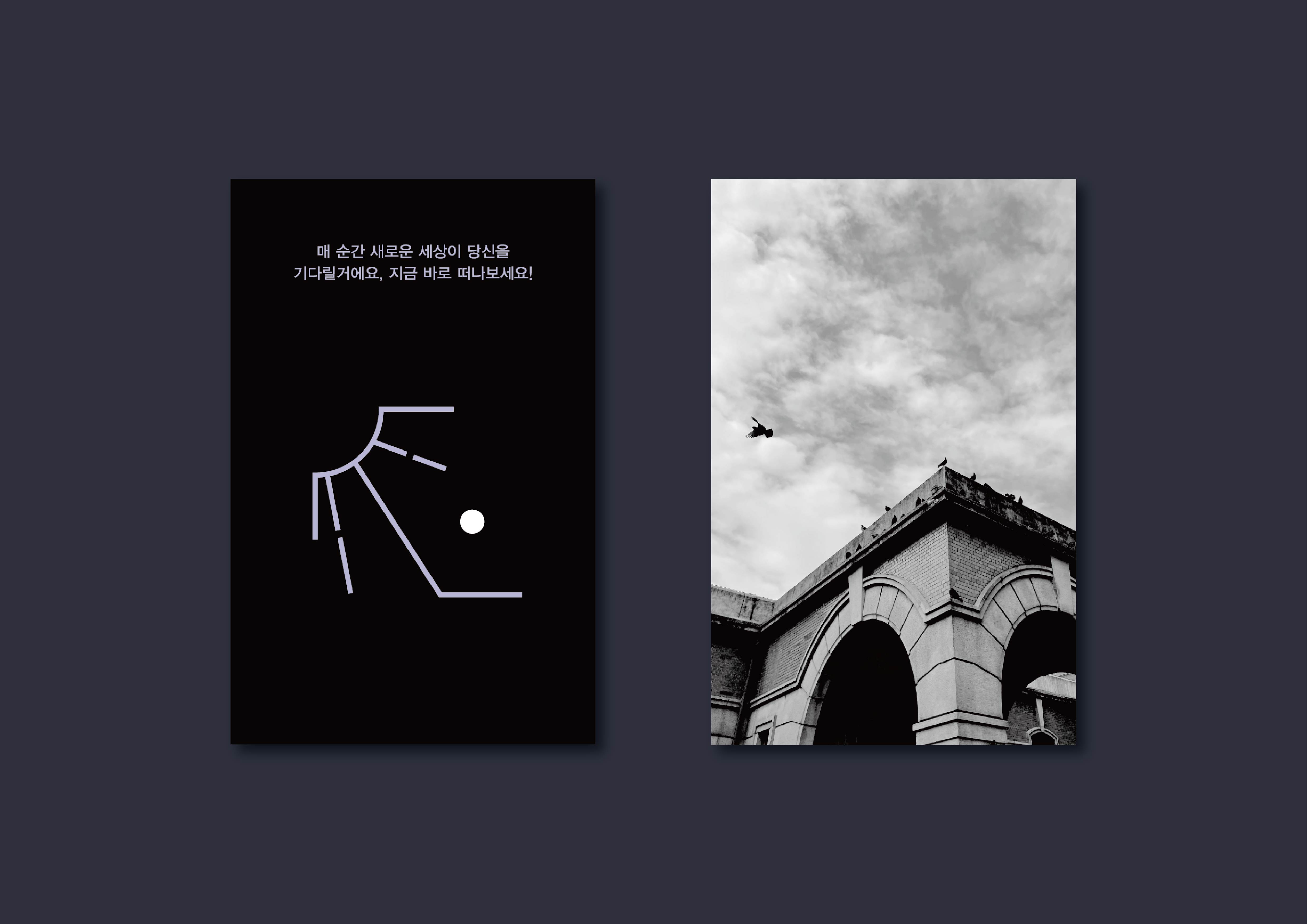 우리는 서울역이라는 길을 딛고 어디로든 떠날 수 있다. 서울역을 거쳐 마주하는 무수한 순간들. 여행자의 도착지는 공간이 될 수도, 어떠한 시간이 될 수도 있다. 그 과정에서 때로는 방황을 겪지만 전진하며, 끝내 도달할 것이다. 이 프로젝트를 통해 우리는 여행자들의 자유로운 여정을 위한 길을 열어주는 작업을 진행했다. @seoulstation.1104 김다빈 rla021203@gmail.com @kimmdavin 박애란 dofks1008@daum.net @victobery 송은솔 littleforest2014@naver.com @welchess 이새빈 saibin2@naver.com @p_leesaebin HTML 삽입 미리보기할 수 없는 소스