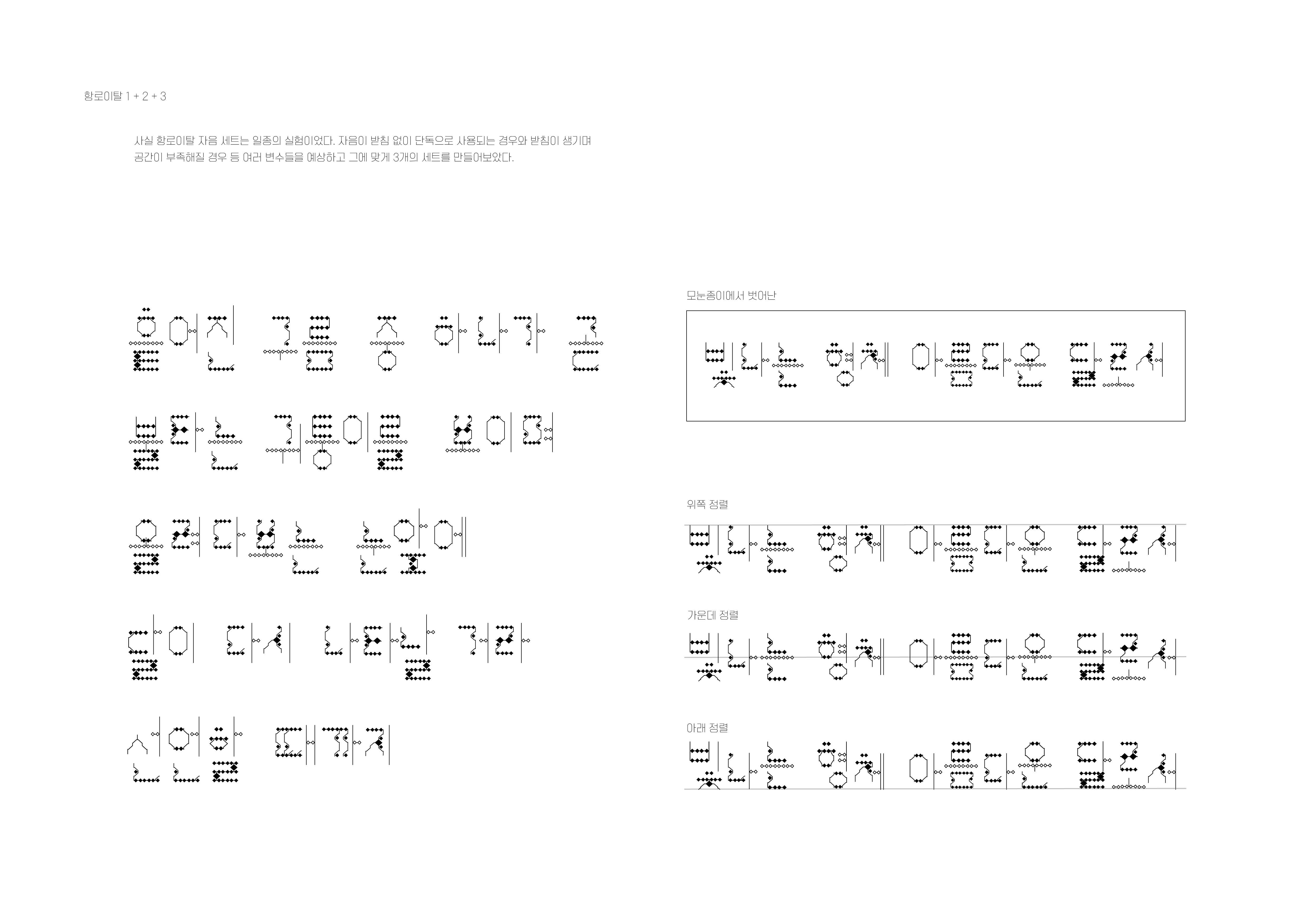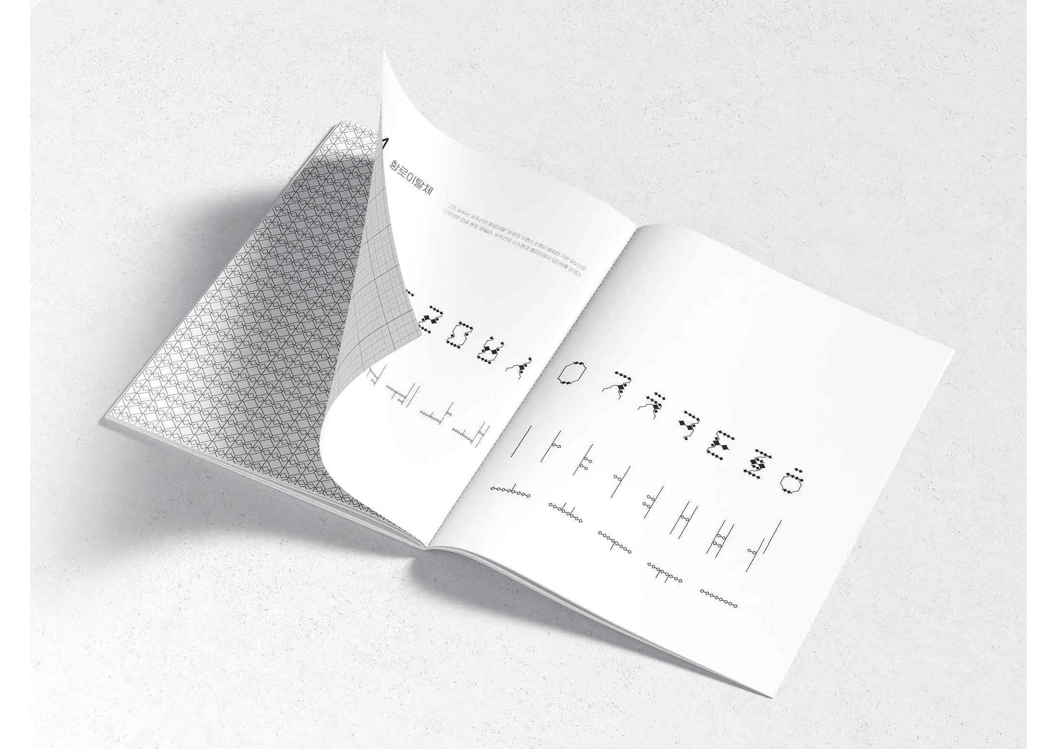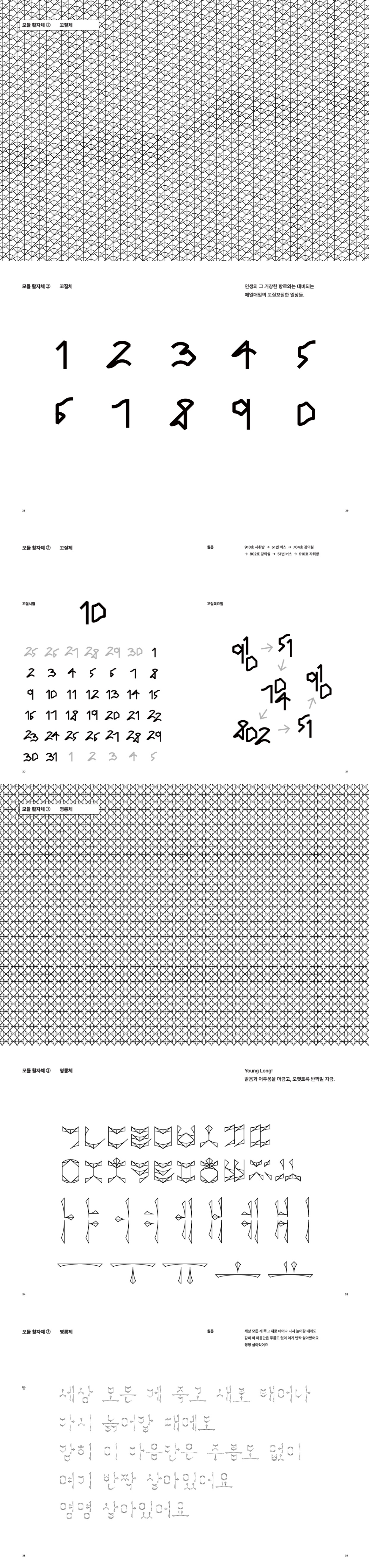 30여 개의 모듈 디자인 테스트를 진행한 후 선정한 '바람개비 '모듈로 십여 개의 패턴화를 진행했다. 만든 패턴은 펜을 사용해 곧바로 글자를 그릴 수 있는 환경을 위해 모눈종이의 형태로 옮겼다. 그중 두 가지 패턴이 선별되어 국문 1종, 영문 1종, 숫자 1종, 총 3개의 각기 다른 활자체를 제작했다.