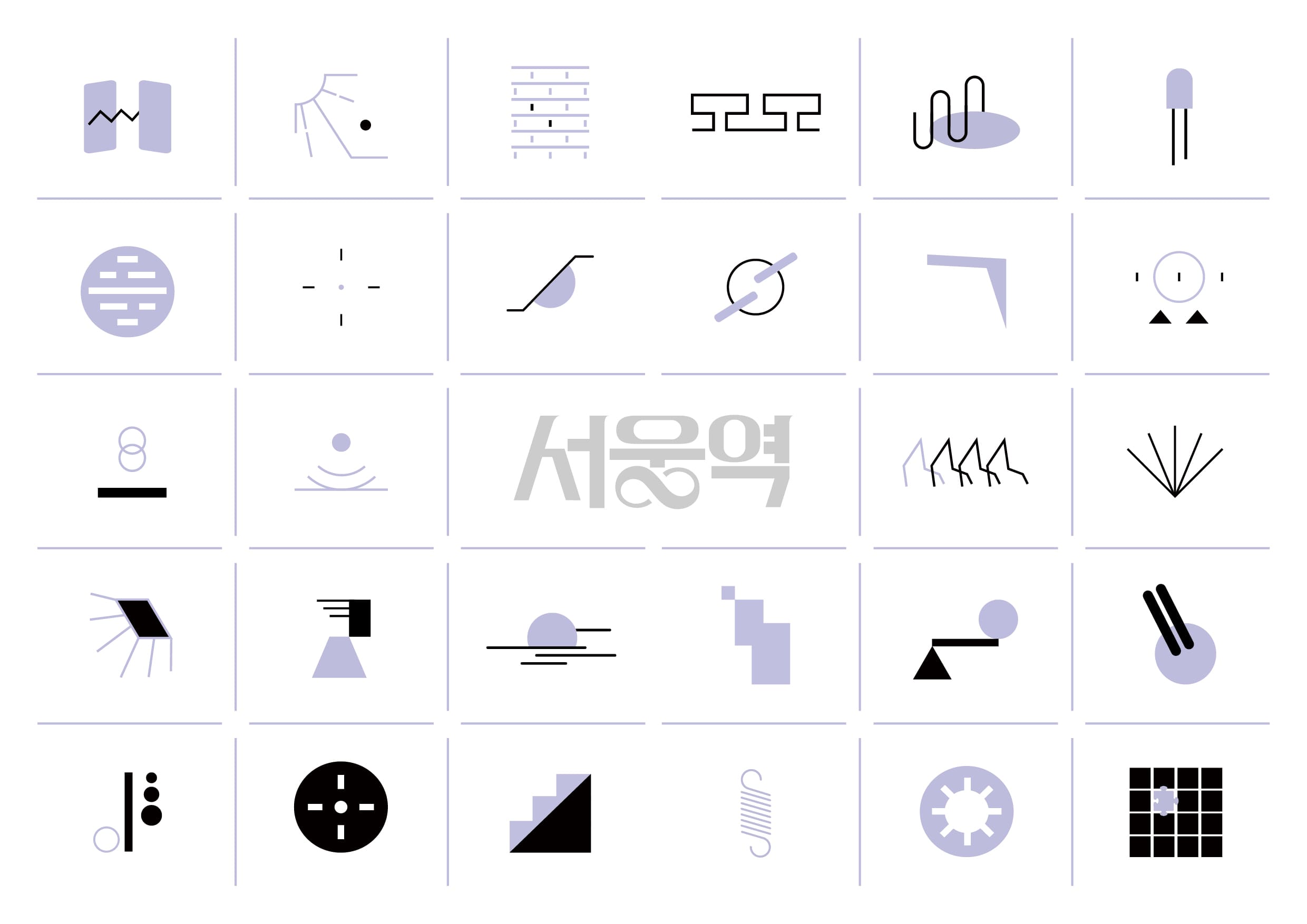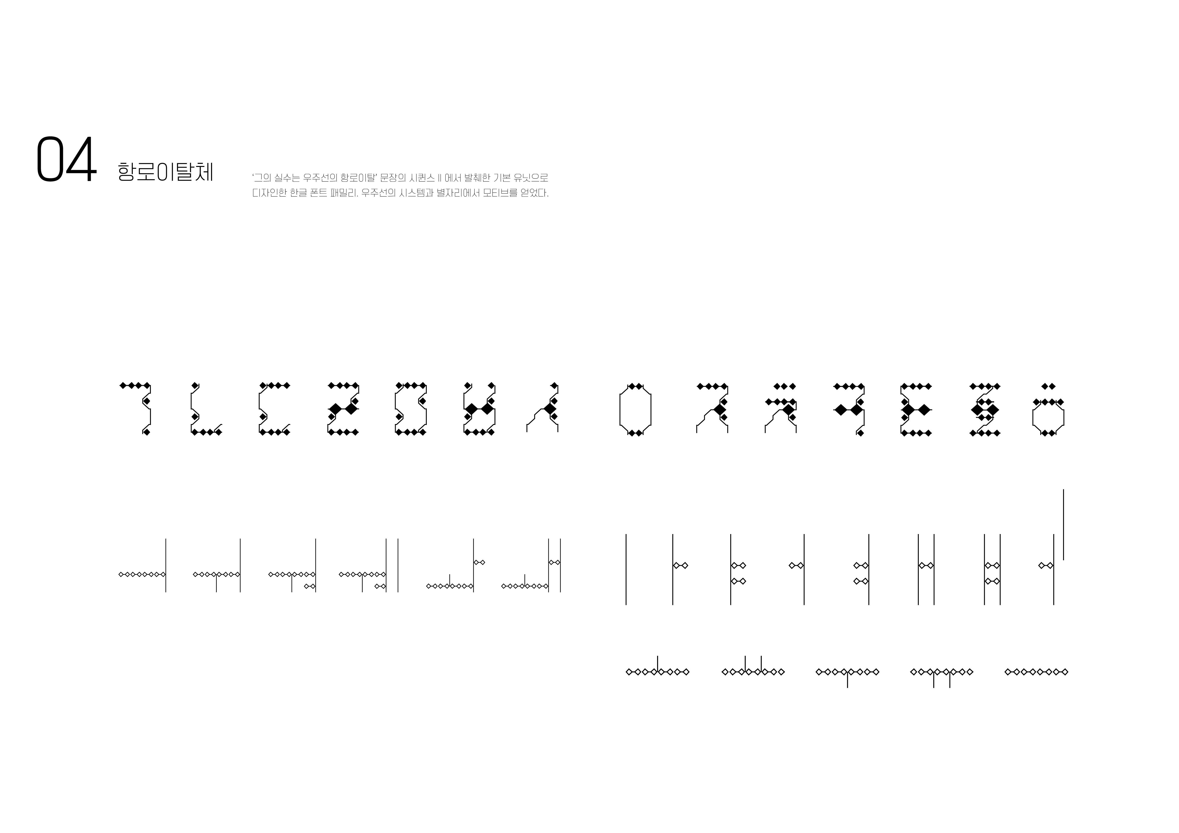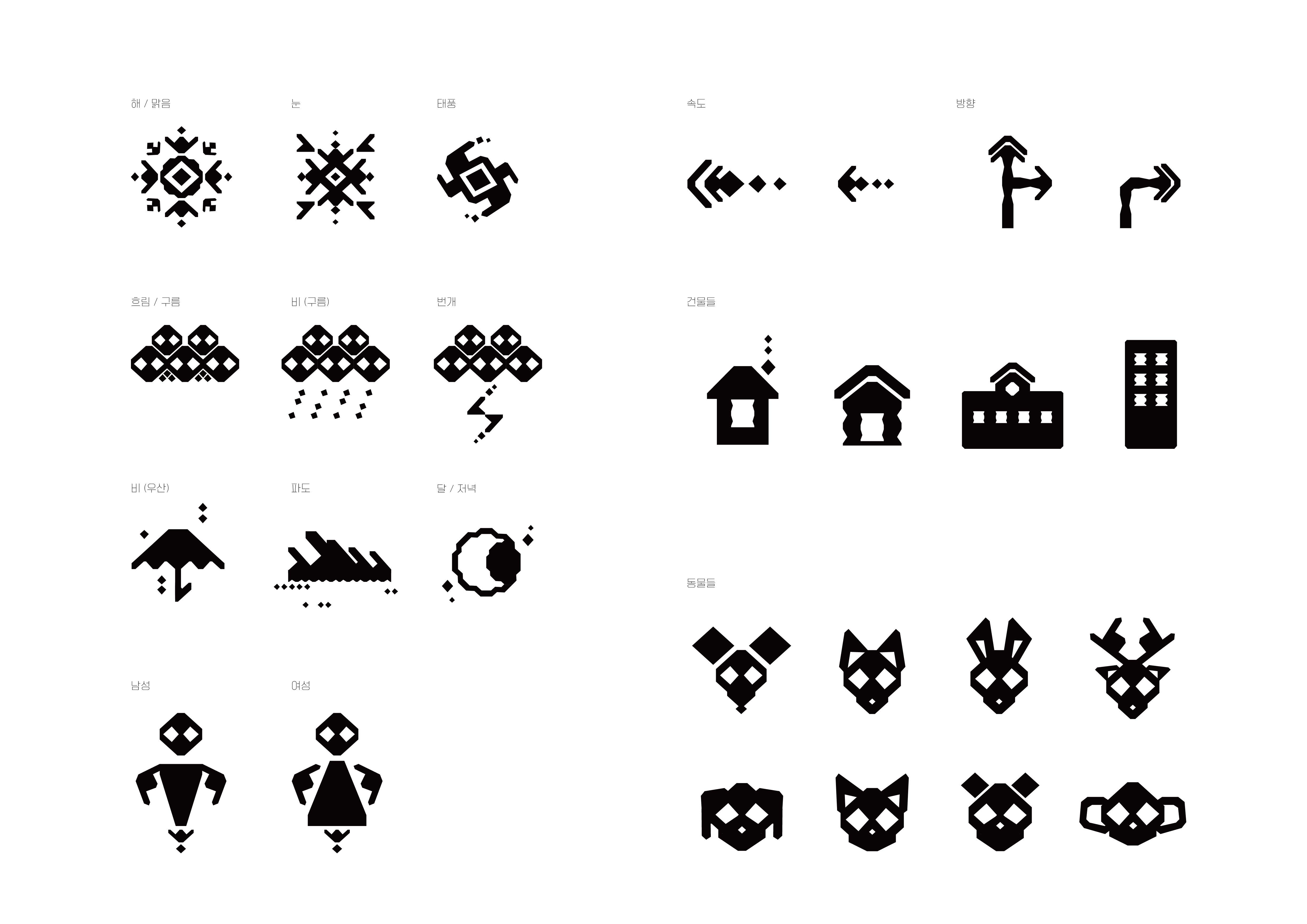 나를 표현한 30개의 문장에서 ‘유순’, ‘광대’, ‘인공위성’을 선택해 하나의 모듈을 만들어 이미지로 번역하는 작업을 진행하였다. 모듈을 패턴화하여 패턴 속에서 찾을 수 있는 유닛들을 조합하여 라틴 서체 ‘열쇠체’와 한글 서체 ‘산수화체’, 숫자 ‘발굽체’를 만들었다. 유닛과 모듈에서 활용한 규칙을 가져와 공원에서 만날 수 있는 친구들과 날씨를 표현하는 픽토그램을 만들었다.