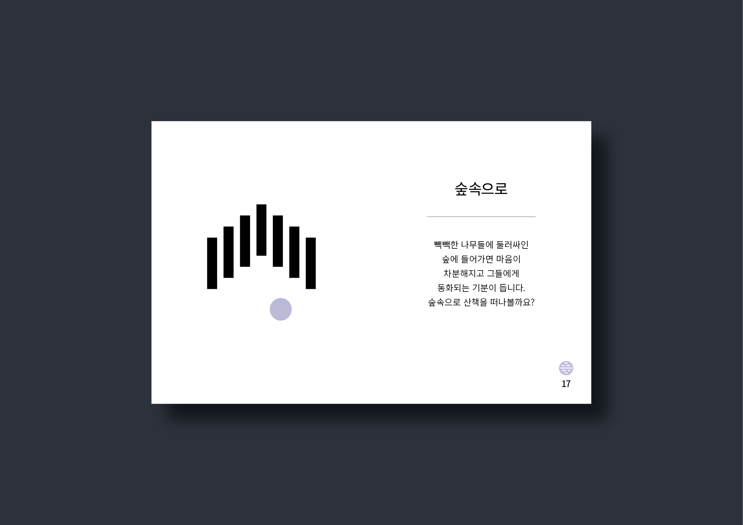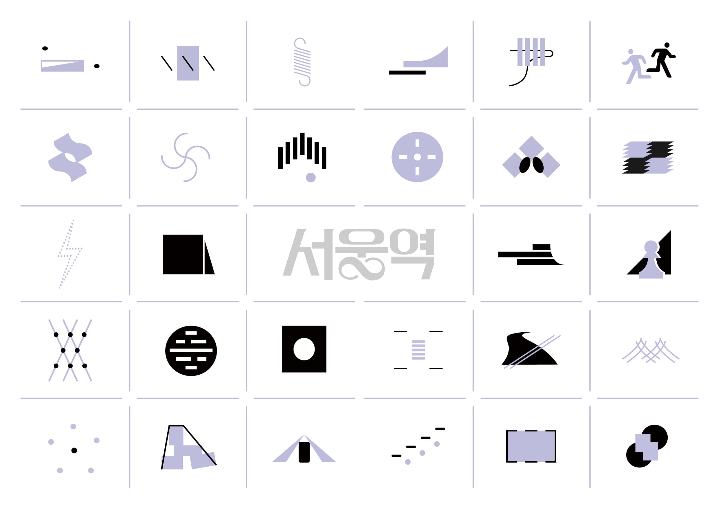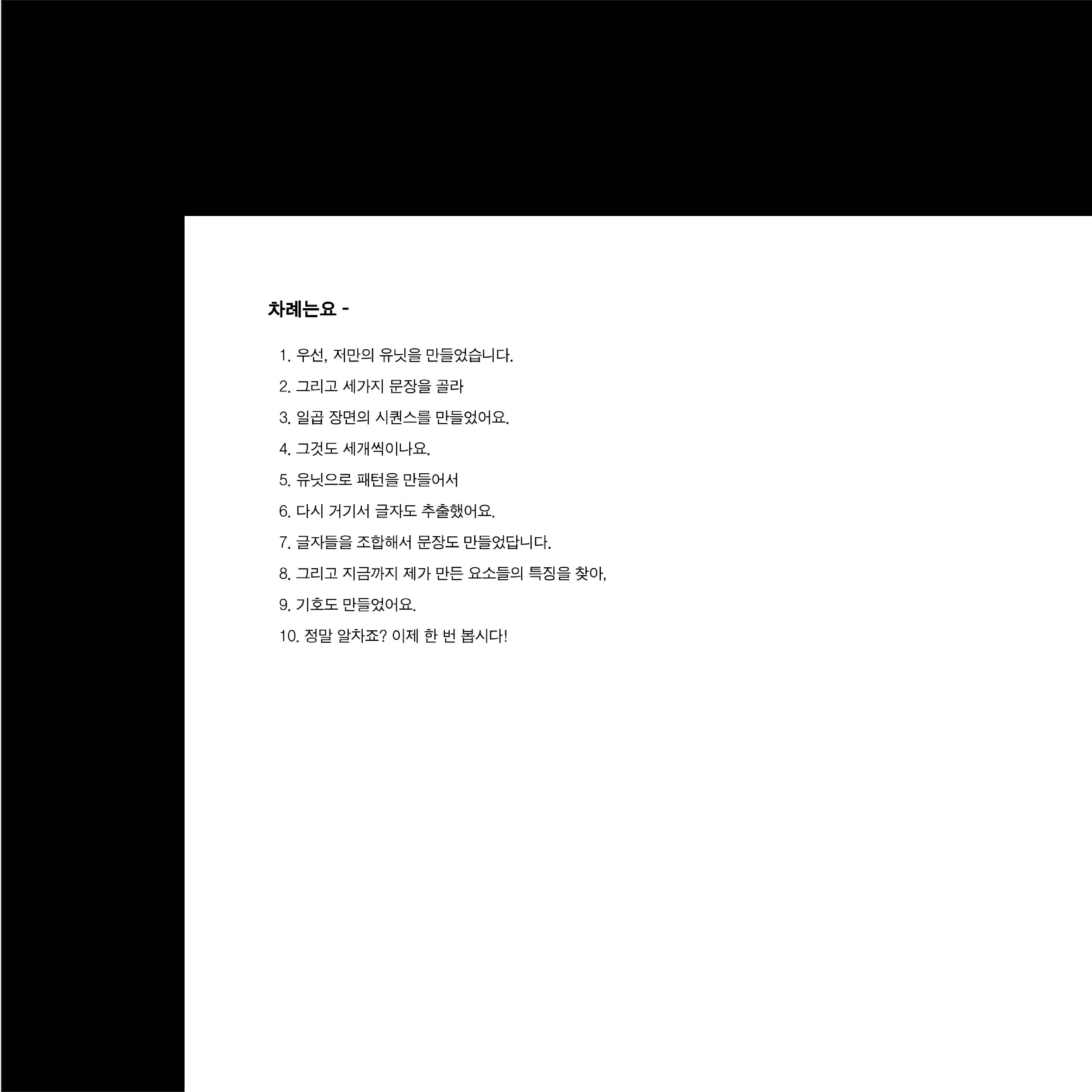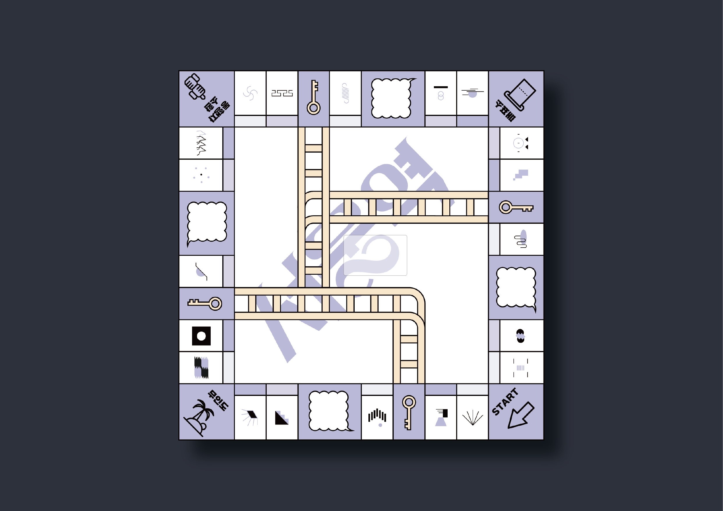 나를 표현한 30개의 문장에서 ‘유순’, ‘광대’, ‘인공위성’을 선택해 하나의 모듈을 만들어 이미지로 번역하는 작업을 진행하였다. 모듈을 패턴화하여 패턴 속에서 찾을 수 있는 유닛들을 조합하여 라틴 서체 ‘열쇠체’와 한글 서체 ‘산수화체’, 숫자 ‘발굽체’를 만들었다. 유닛과 모듈에서 활용한 규칙을 가져와 공원에서 만날 수 있는 친구들과 날씨를 표현하는 픽토그램을 만들었다.