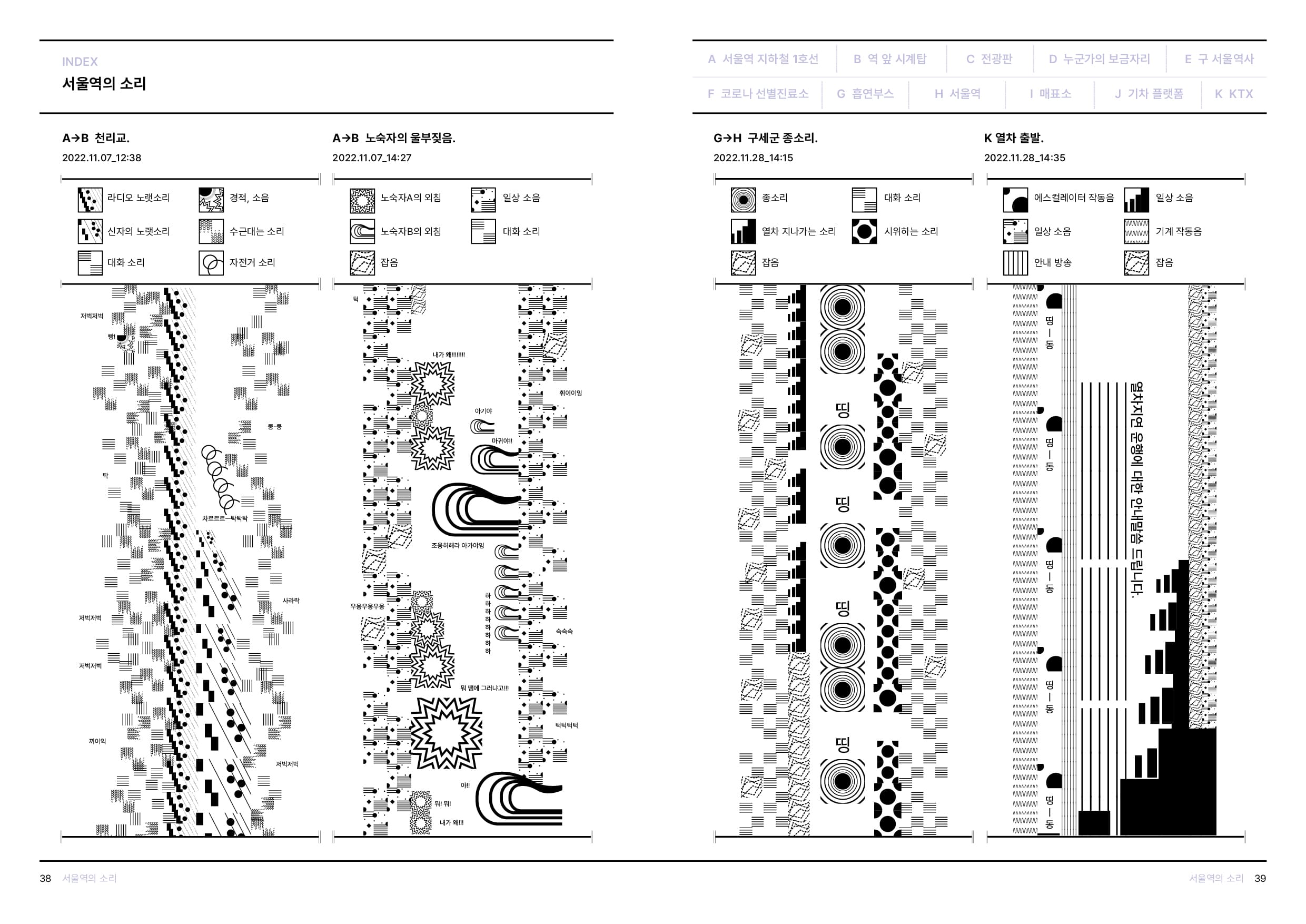 우리는 답사 공간에서의 경험을 시각적으로 담아내기 위해 녹음에 착수했다. 각 공간에서 최소 30초에서 최대 8분 동안 녹음을 진행해 가장 고요하거나 시끄러웠던 주파수를 기록했다. 이를 바탕으로 50개의 그래픽을 제작하였다.