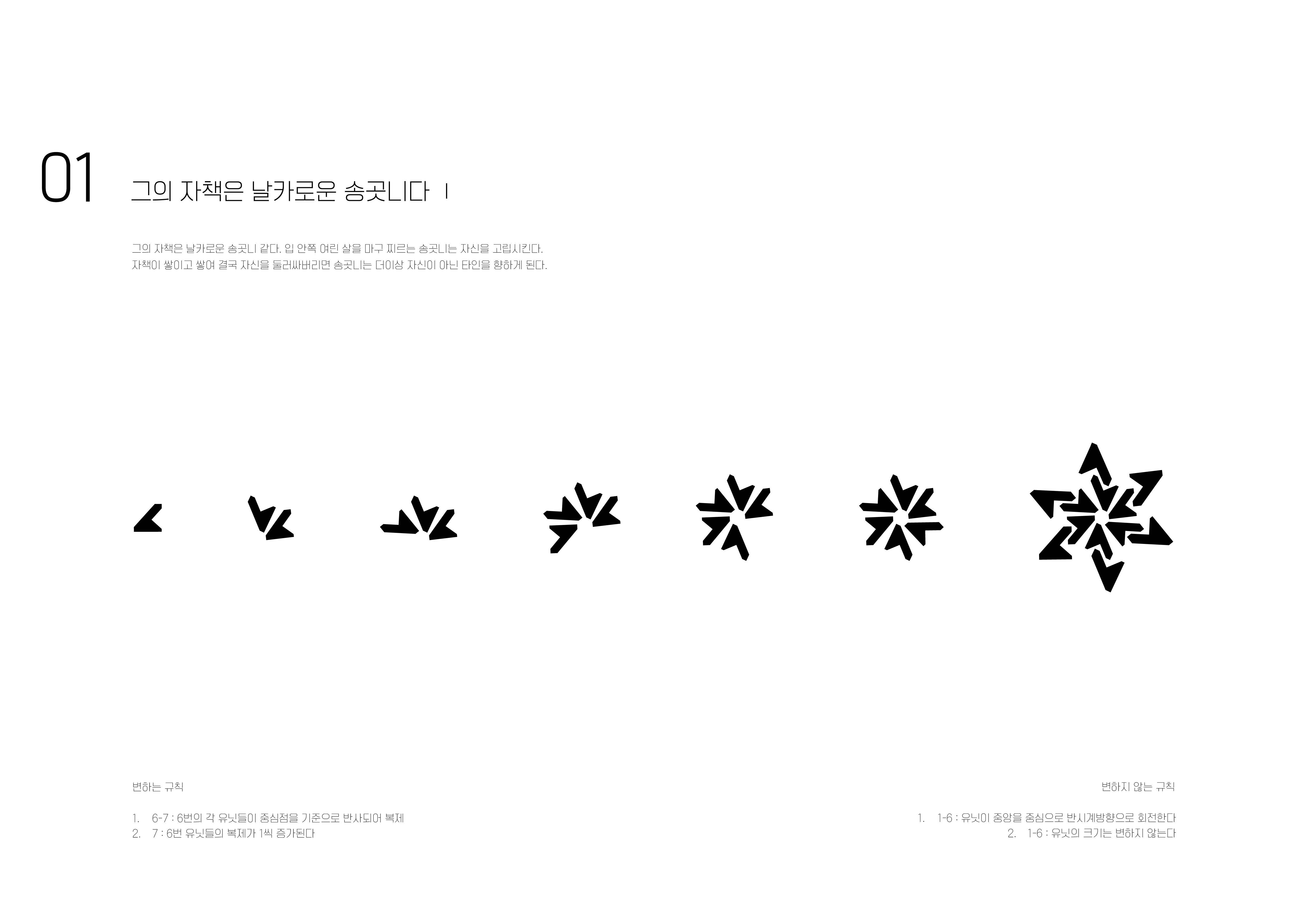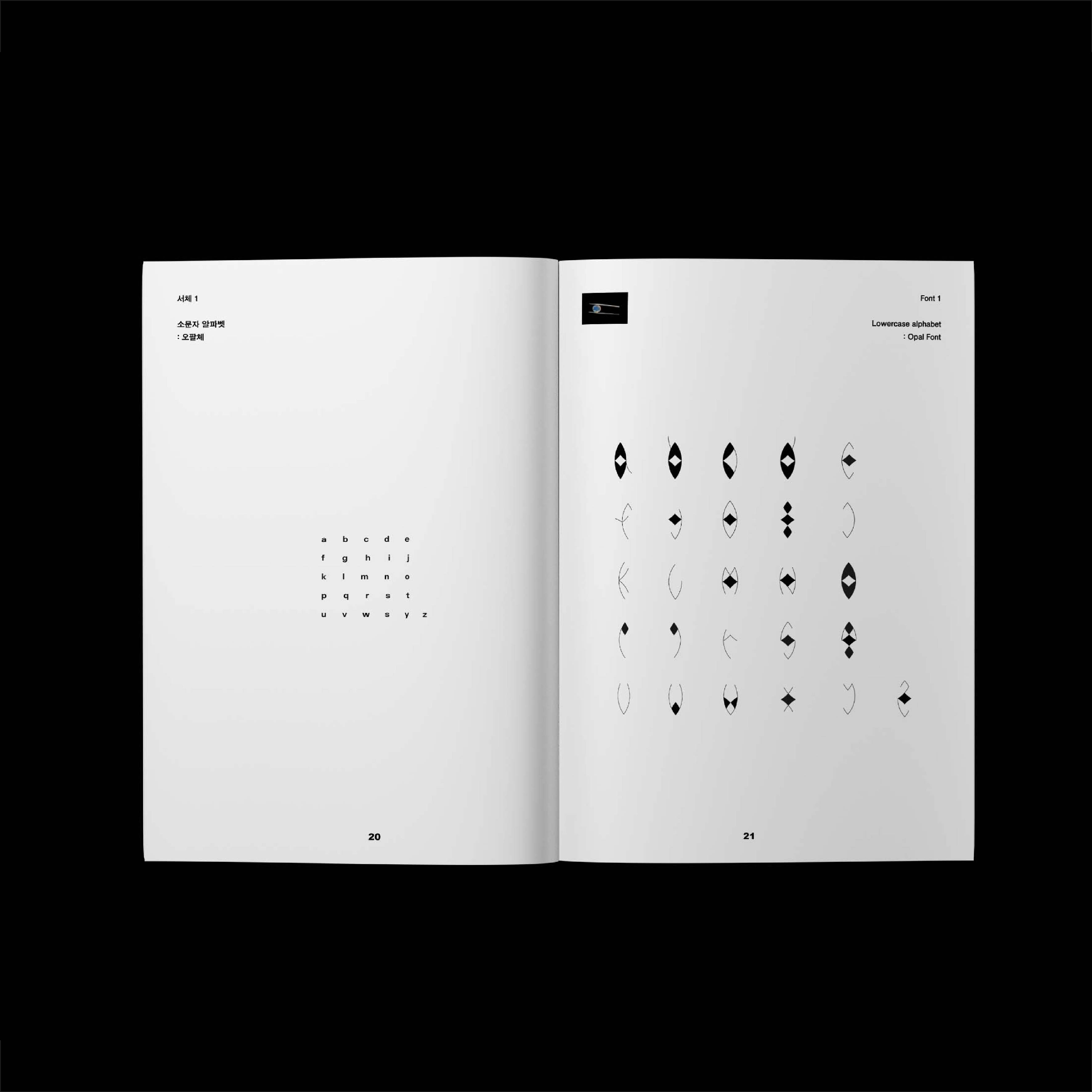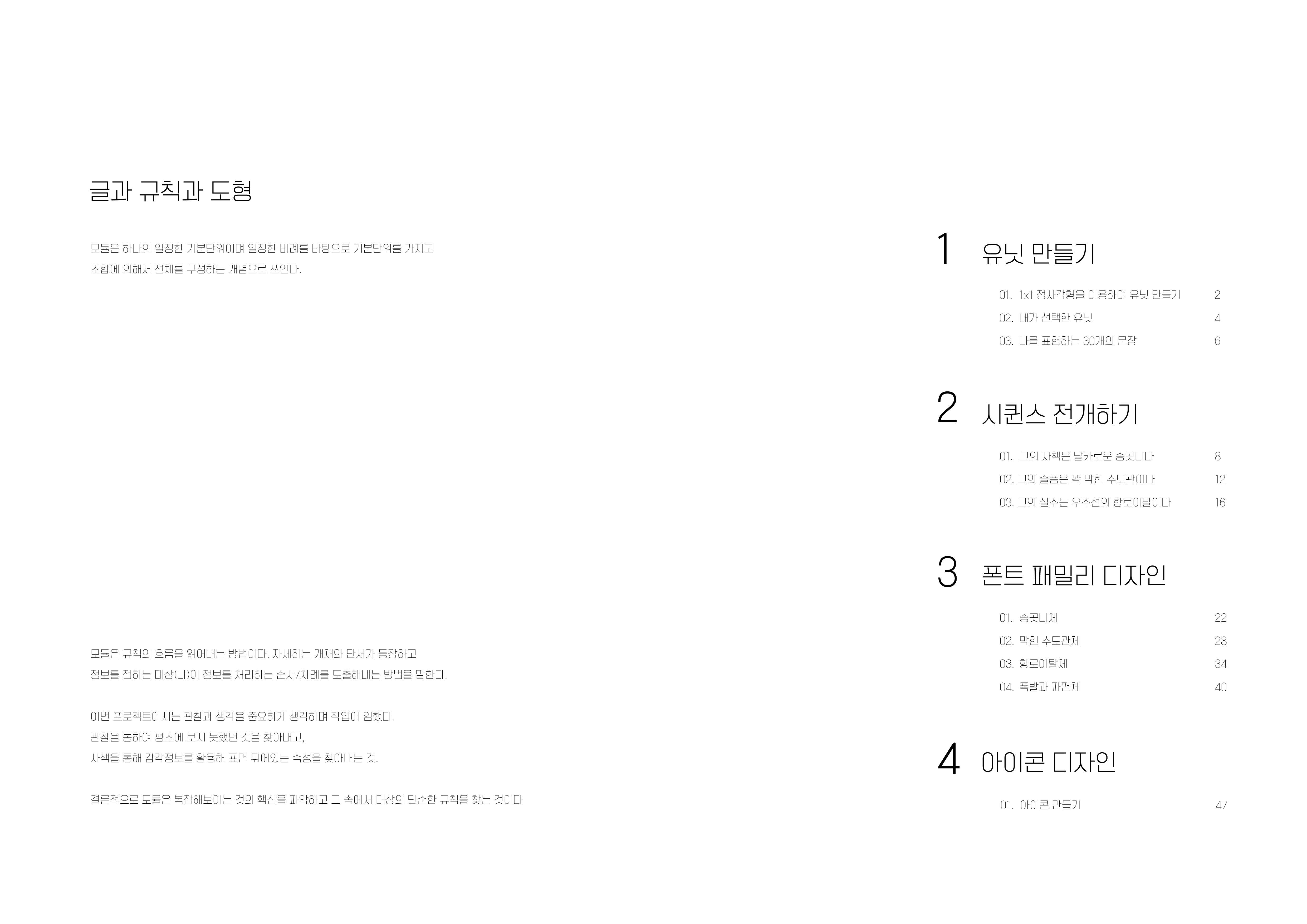 우연 속에서 도형을 만들어내고, 그 도형을 활용해 시퀸스와 패턴을 만들고, 그 복잡한 패턴 속에서 핵심을 파악하고 그 속에서 이어지는 규칙을 찾아 폰트를 만들었습니다. 모듈은 규칙의 흐름을 읽어내는 방법입니다. 이번 프로젝트에서는 관찰과 관찰을 통한 발상을 중요하게 생각하며 연구하는 자세로 임했습니다. 관찰을 통하여 평소에 보지 못하던 것을 찾아내고 사유하며 감각 정보를 활용해 표면 뒤에 있는 속성을 발견했습니다. 총 6개의 시퀸스, 4개의 패턴, 4개의 폰트와 27개의 아이콘을 작업했습니다. 김수연 @ohmy_starlight