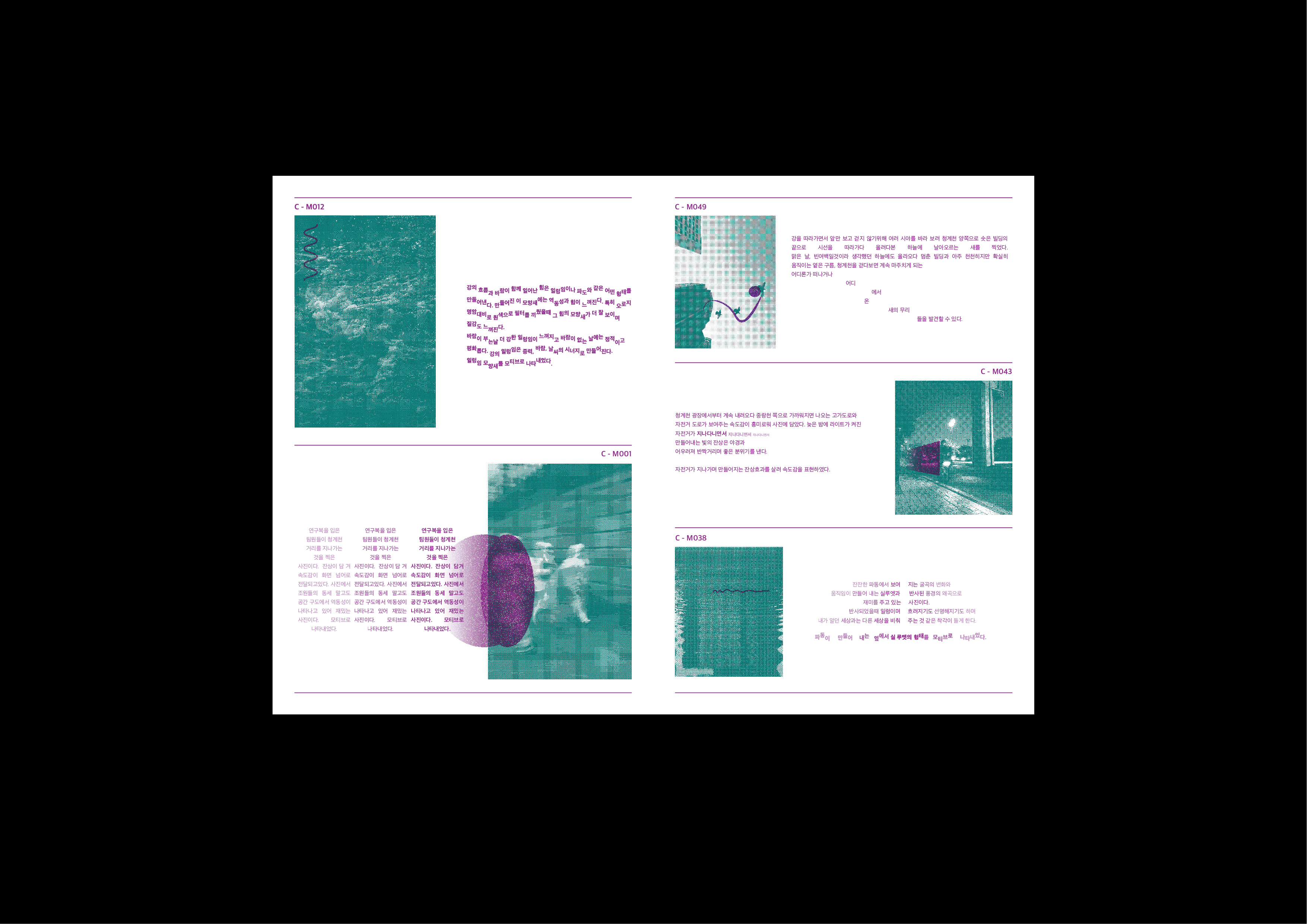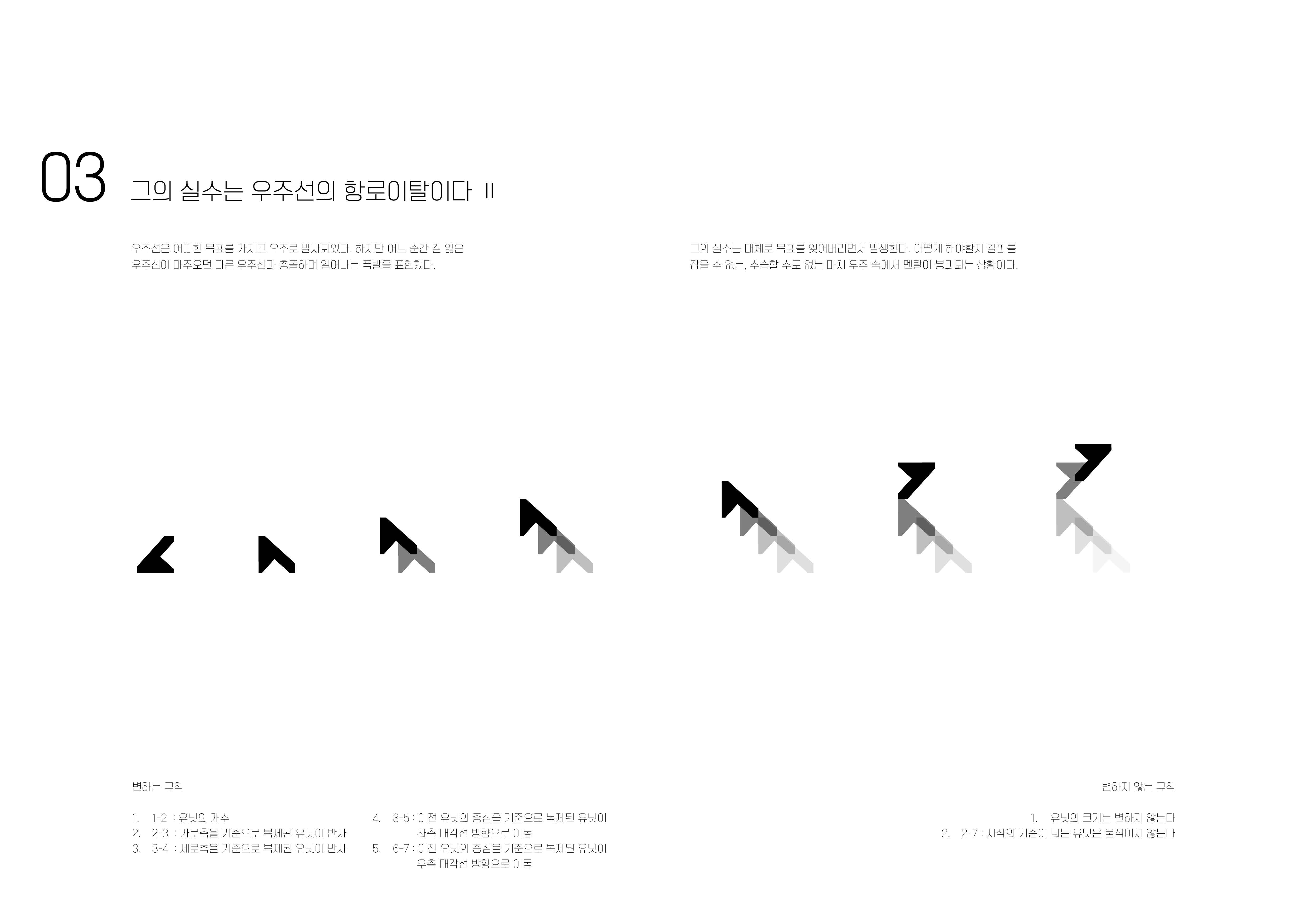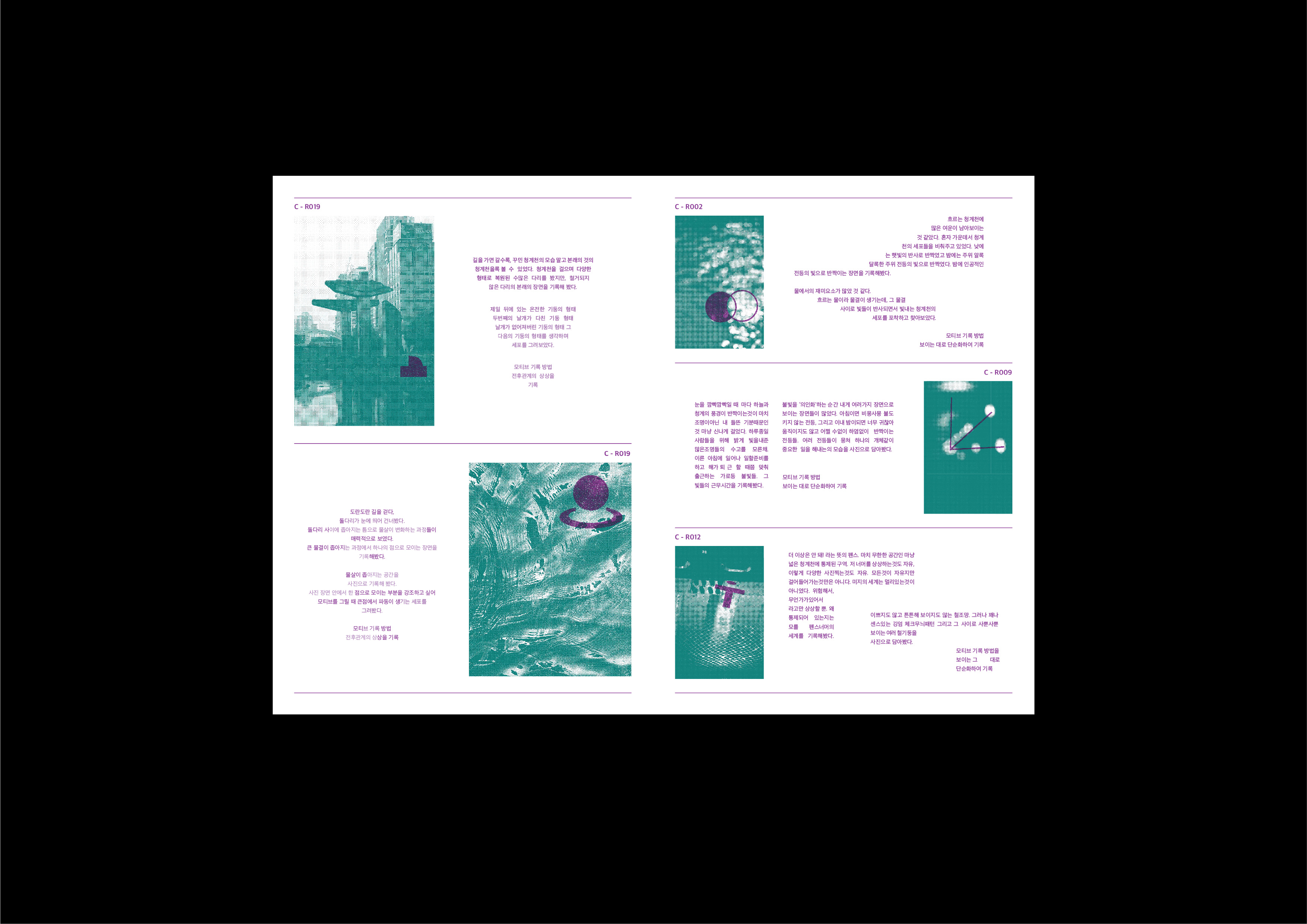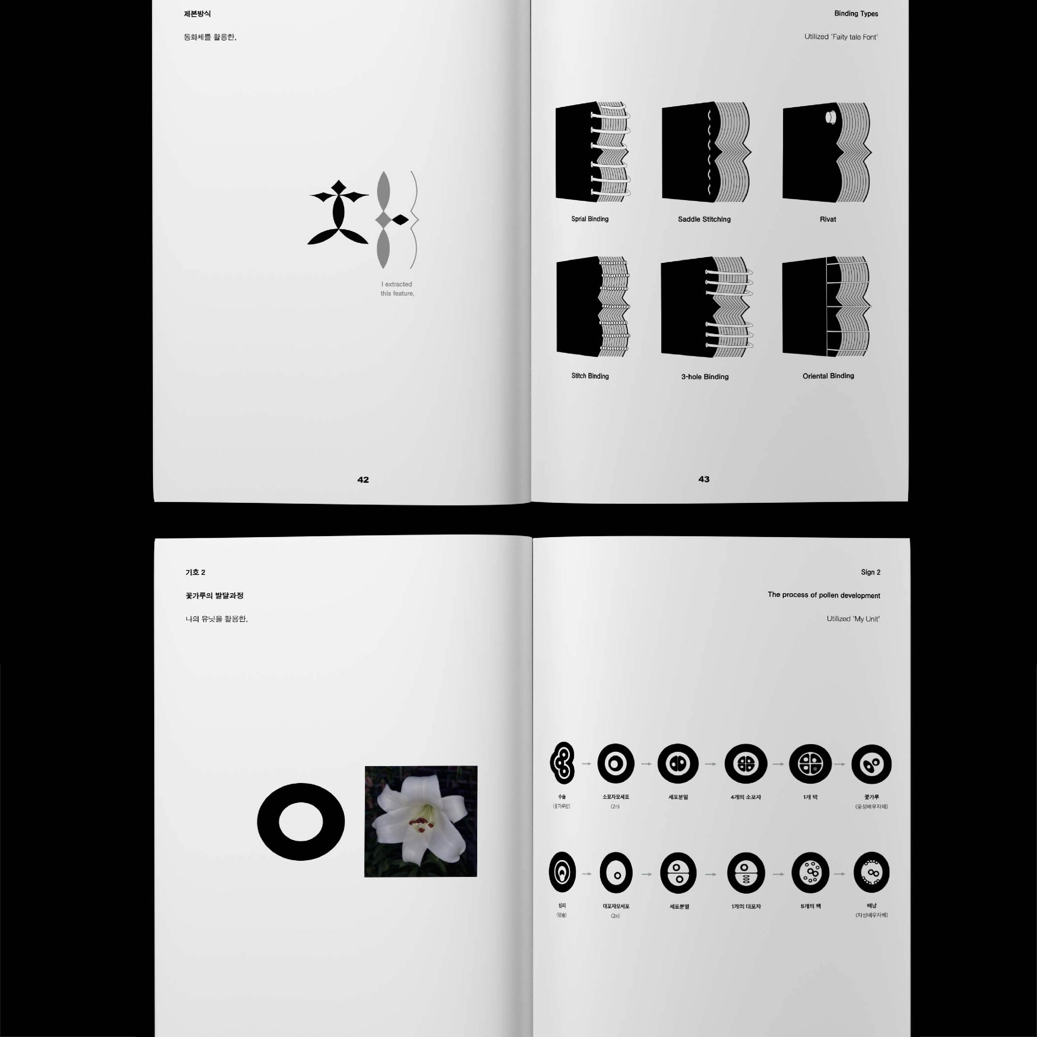 우연 속에서 도형을 만들어내고, 그 도형을 활용해 시퀸스와 패턴을 만들고, 그 복잡한 패턴 속에서 핵심을 파악하고 그 속에서 이어지는 규칙을 찾아 폰트를 만들었습니다. 모듈은 규칙의 흐름을 읽어내는 방법입니다. 이번 프로젝트에서는 관찰과 관찰을 통한 발상을 중요하게 생각하며 연구하는 자세로 임했습니다. 관찰을 통하여 평소에 보지 못하던 것을 찾아내고 사유하며 감각 정보를 활용해 표면 뒤에 있는 속성을 발견했습니다. 총 6개의 시퀸스, 4개의 패턴, 4개의 폰트와 27개의 아이콘을 작업했습니다. 김수연 @ohmy_starlight