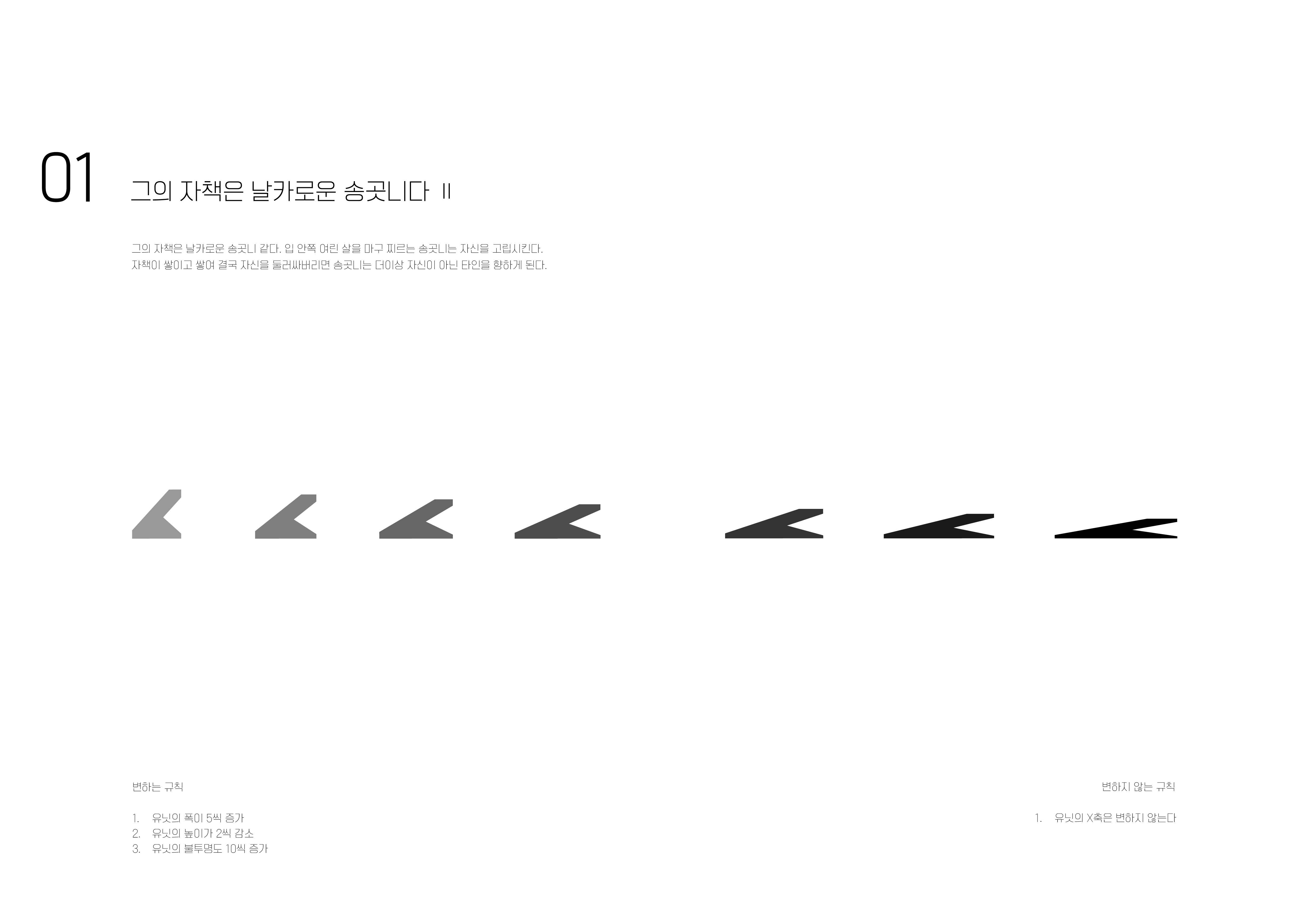 unit은 나를 표현할 때도, unit의 성질이 보이는 활자체를 만들 때도, unit을 활용한 기호를 그릴 때도 사용되었다. 하나의 unit을 겹치고, 변형하며 까슬한 형태와 까슬한 형태에 국한되지 않는 다양한 표현을 만들어갔다.