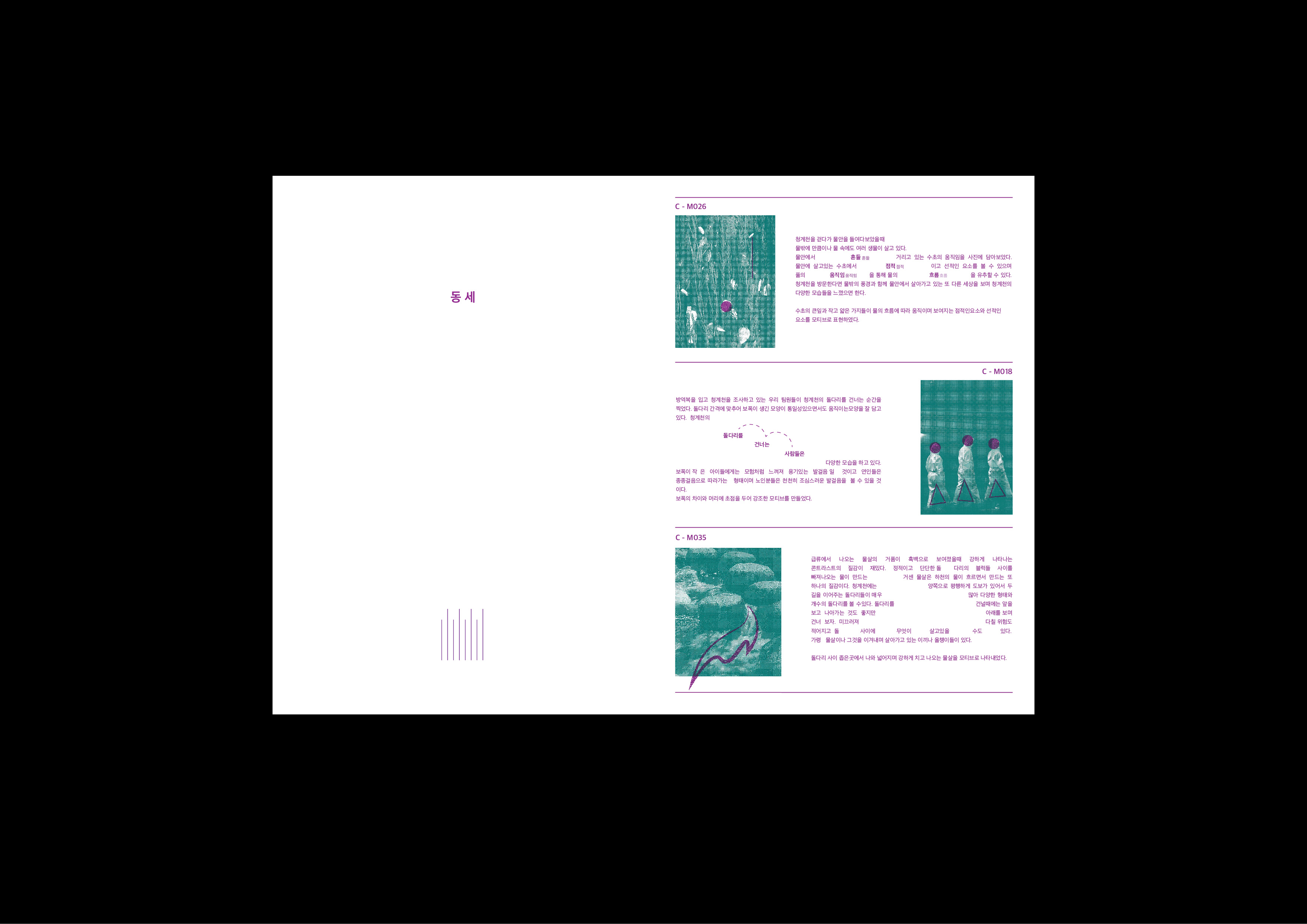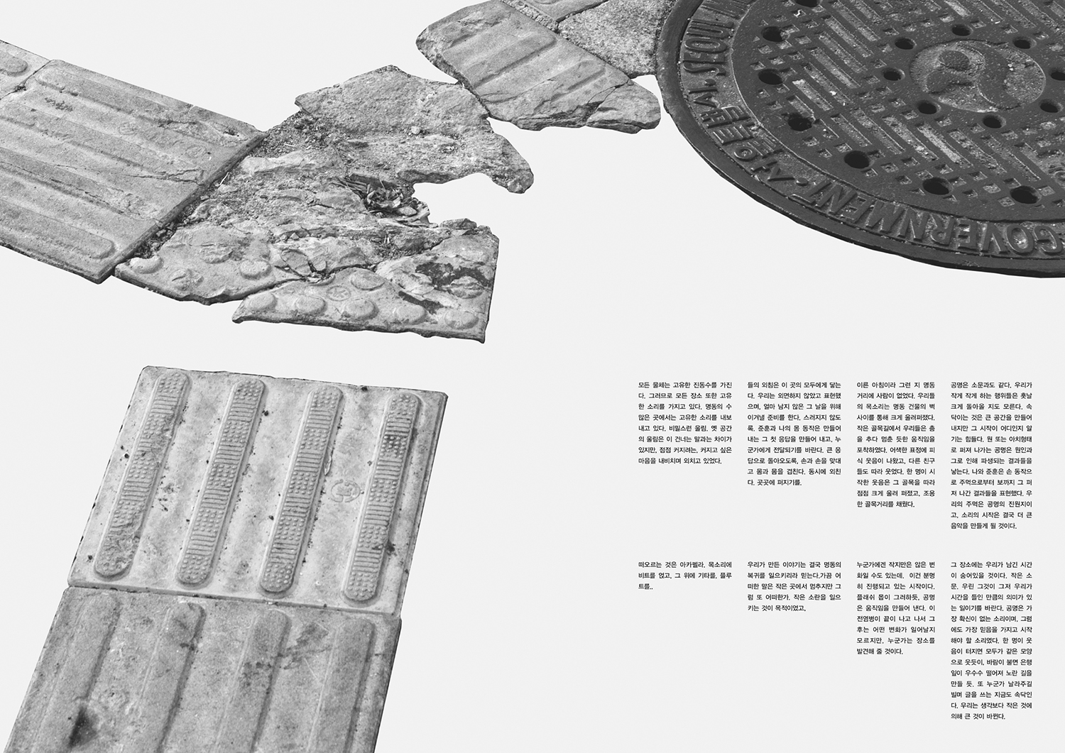 둉묘는 사물과 사람이 만나는 만남의 광장이다. 사물과 사람이 만나고 사람과 사물이 만난다. 사물은 과거이고 사람은 현재이다. 과거와 현재가 공존한다. 수많은 것들이 뒤섞인다. 독자는 타블로이드를 읽으며 먼지, 순환, 동세 3가지 개념을 경험한다. 타블로이드는 동묘의 사물과 사람들을 조명하며 서로 마주하도록 구성되었다. 박하늘 ps.gksmf.mo@gmail.com 권연주 yeonjoo35k@gmail.com 안지민 zmnann@naver.com 구하민 esther30403@naver.com HTML 삽입 미리보기할 수 없는 소스