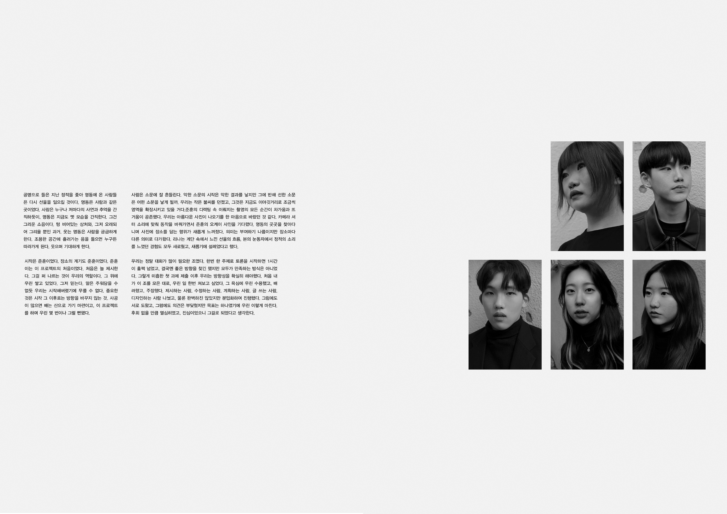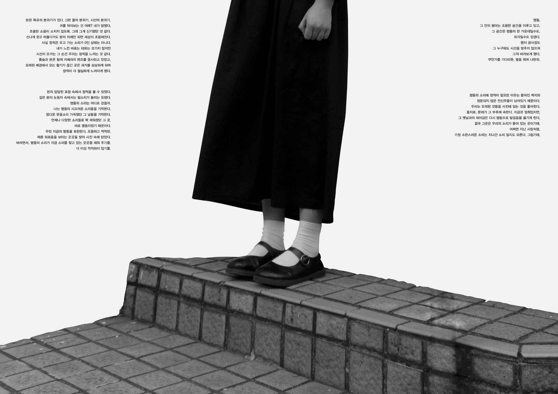 명동의 구조물들을 기반으로 브랜딩했다. “포스트 코로나 시대로 인해 사라진 번화가 명동의 소리들을 추억하며”라는 메세지를 “정적, 공명, 선율”이라는 3개의 키워드로 팀원들이 직접 모델이 되어 촬영하는 형식으로 에세이 매거진 및 소리라는 컨셉을 살리기 위한 앨범 cd, 포토카드 등이 엠비테이션 아이템으로 첨부되어있다. 방준훈 qkdwnsgns123@naver.com @bangbang_jun 이본 dldldlgka@naver.com @disneybon_ 구민찬 sola1221@naver.com @kookie_ring 서화진 alsrmsghkwls@naver.com @anz_work 최리나 chlflsk1004@naver.com @linachoirina