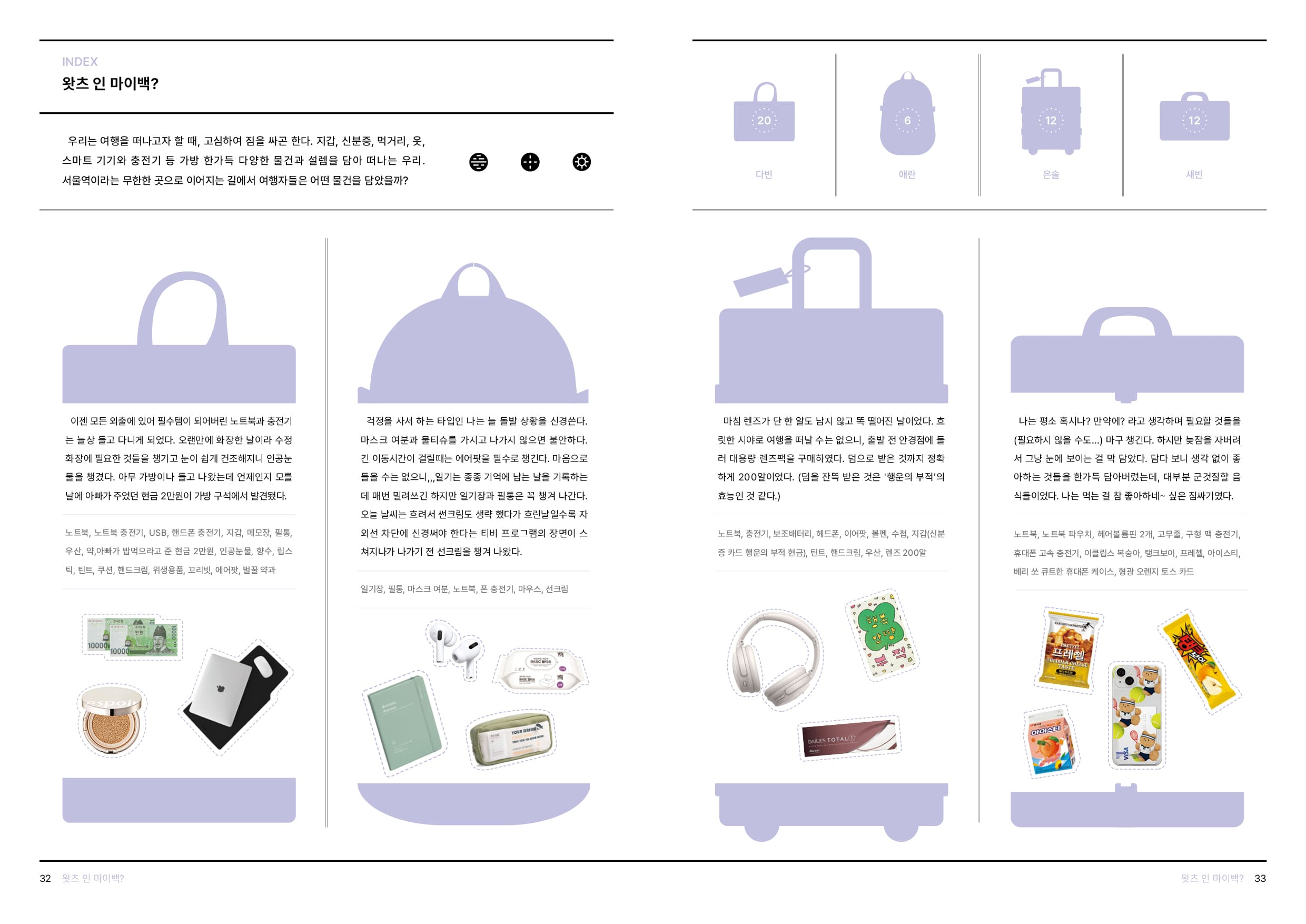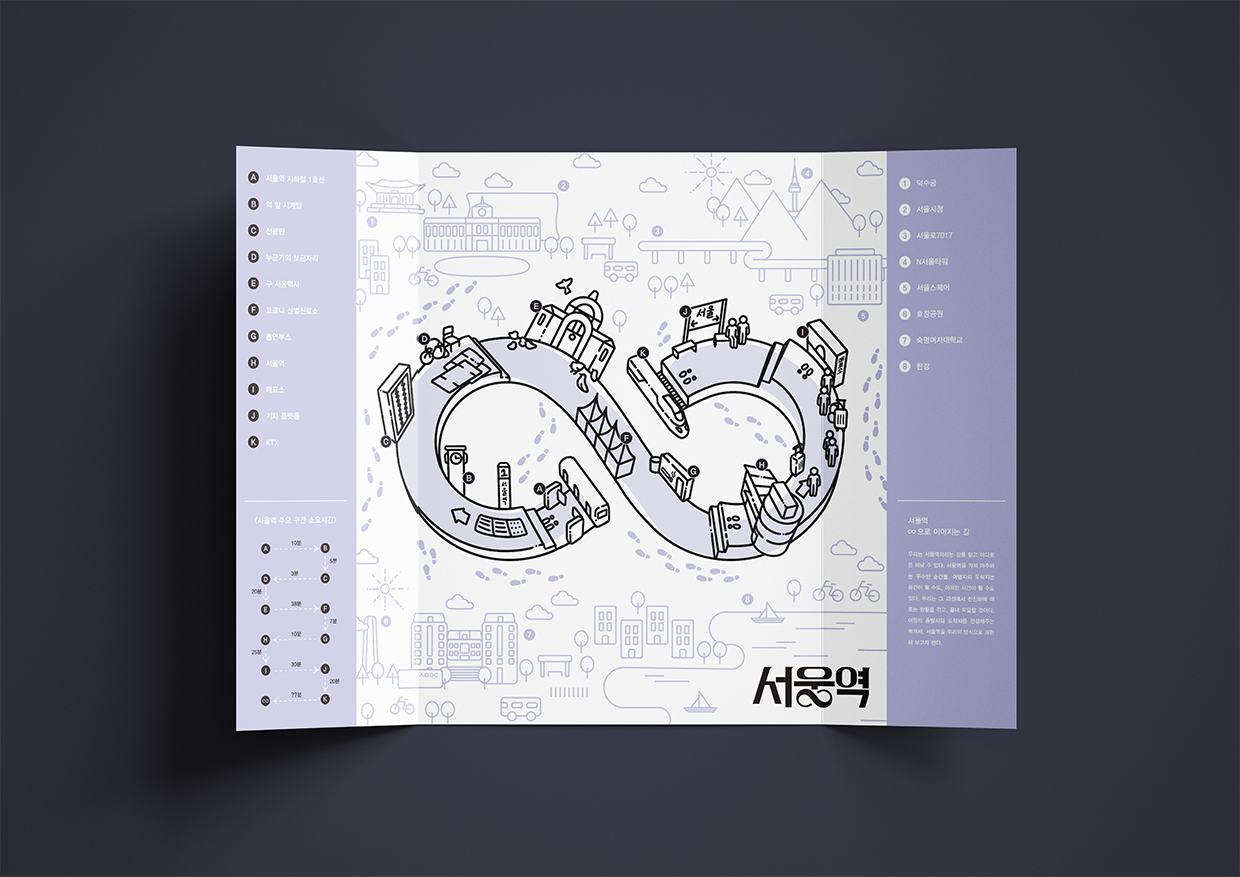 서울역을 주제로 진행한 공간 프로젝트(팀프로젝트)를 위한 노숙대응 매뉴얼 디자인. 노숙은 길거리에서 자는 것으로 이동 수단이 빈약하고 숙박시설이 적었던 과거에 여행객들이 자주 행한 방식이다. 현대에는 주로 여러 사정으로 집에 들어갈 수 없거나 아니면 집이 없어서 밖에서 자는 것을 통칭한다. 길바닥에서 자는(路宿)게 아니라 야외에서 자는(露宿)것이다. 이러한 의미의 노숙으로는 우리 모두가 얼마든지 노숙의 상황에 처해질 수 있다. 여행지에서 숙박 업소를 못 구하거나, 버스편, 기차편, 배편, 비행기편을 기다리기 위해 미리 와서 밖에서 기다리는 경우, 한정 판매 제품을 구입하기 위해서 길에 앉아 해가 뜨고 가게가 열리길 기다리는 등 생각보다 노숙을 하게 되는 경우가 적지 않게 발생하기 때문이다. 이 책자에는 언제 어디서 노숙에 처해질 지 모르는 상황들을 대비하기 위한 정보들이 담겨있다. 살아가면서 언제 나에게 찾아올지 모를 노숙의 상황에 대비해보자.