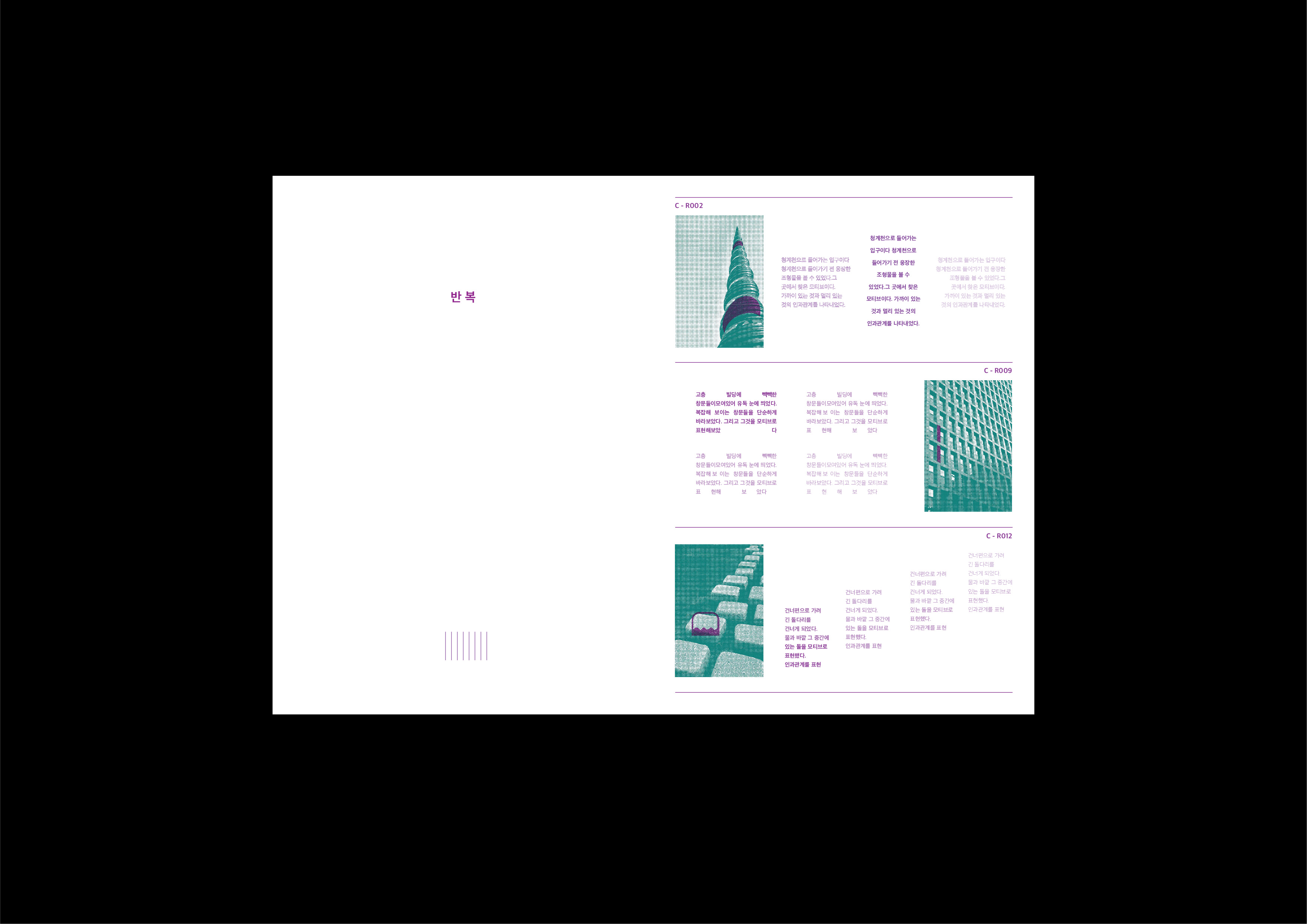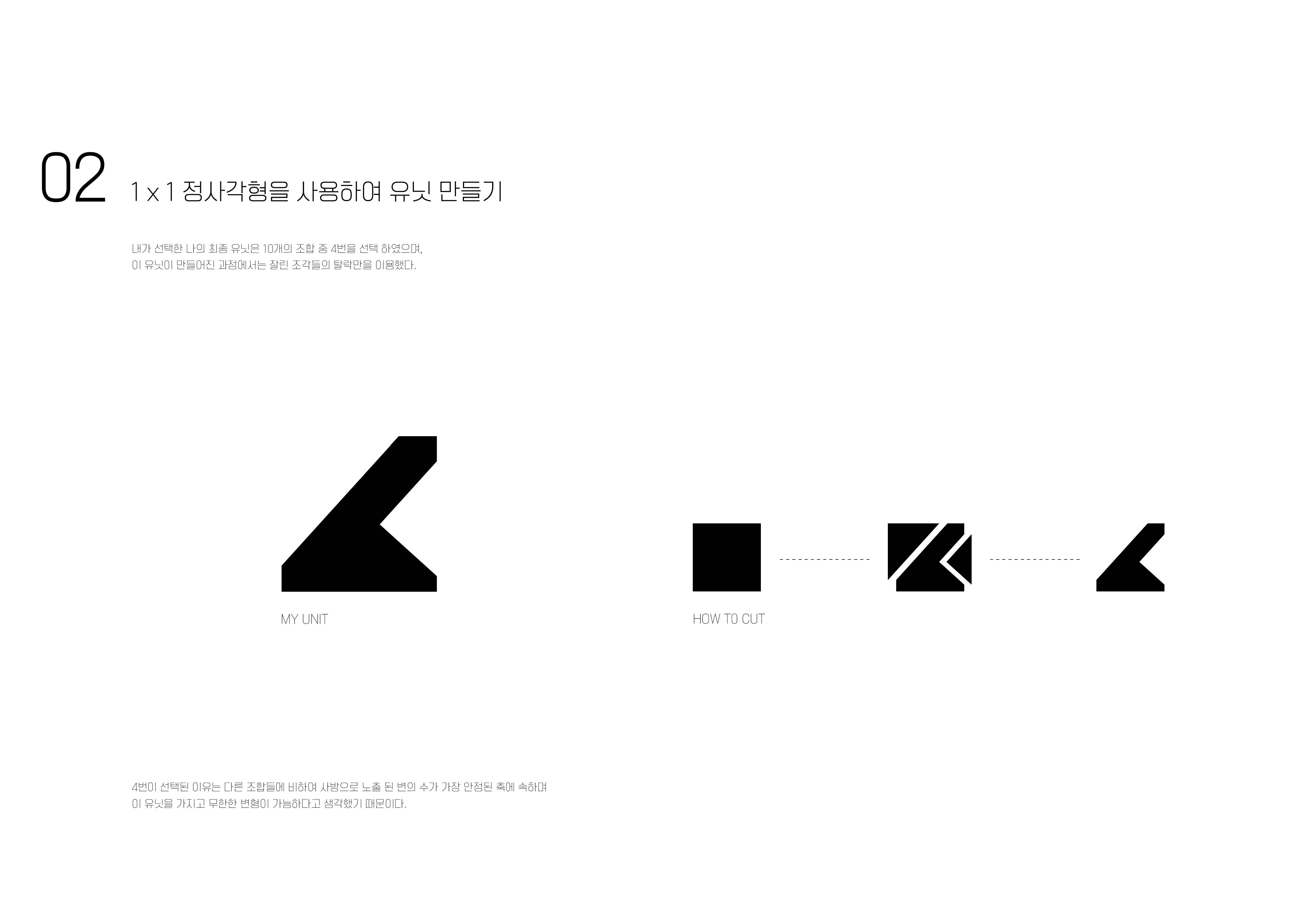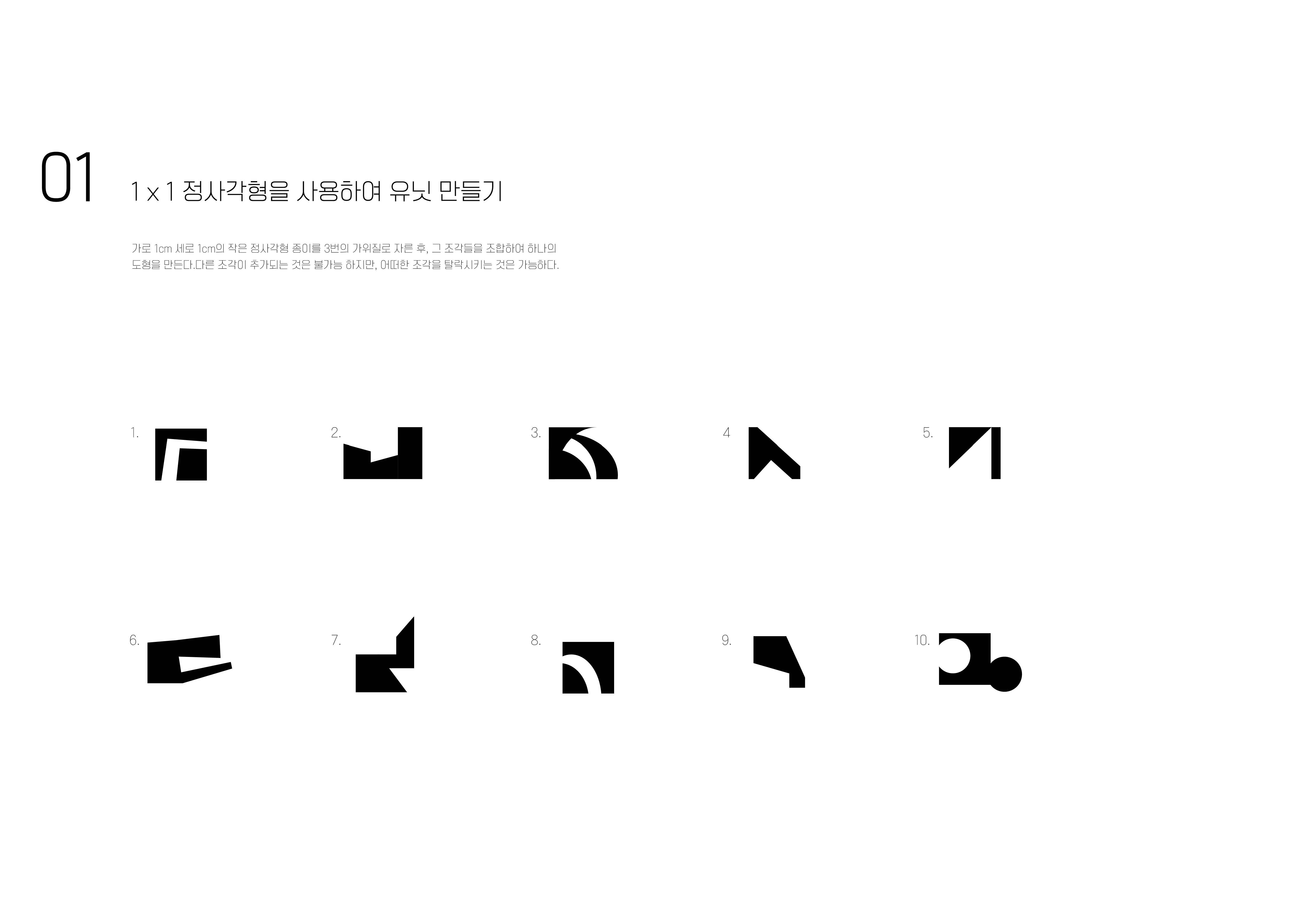 정사각형에서 비롯된 하나의 작은 그래픽은 헤겔의 변증법을 설명하는 시퀀스 과정의 일부가 될 수 있고, 조합과 반복을 통해 여러 가지의 패턴과 활자체, 픽토그램의 재료가 될 수도 있다. 이러한 방식은 '모듈'이라는 개념이 가지는 유기성과 확장성에서 비롯된다. 모듈 탐구보고서에서 표현하는 유기성과 확장성의 '모듈'은 미세하지만 분명하고, 간단하지만 방대하다. 윤영창 dudckd033@naver.com @yun.jun.yong