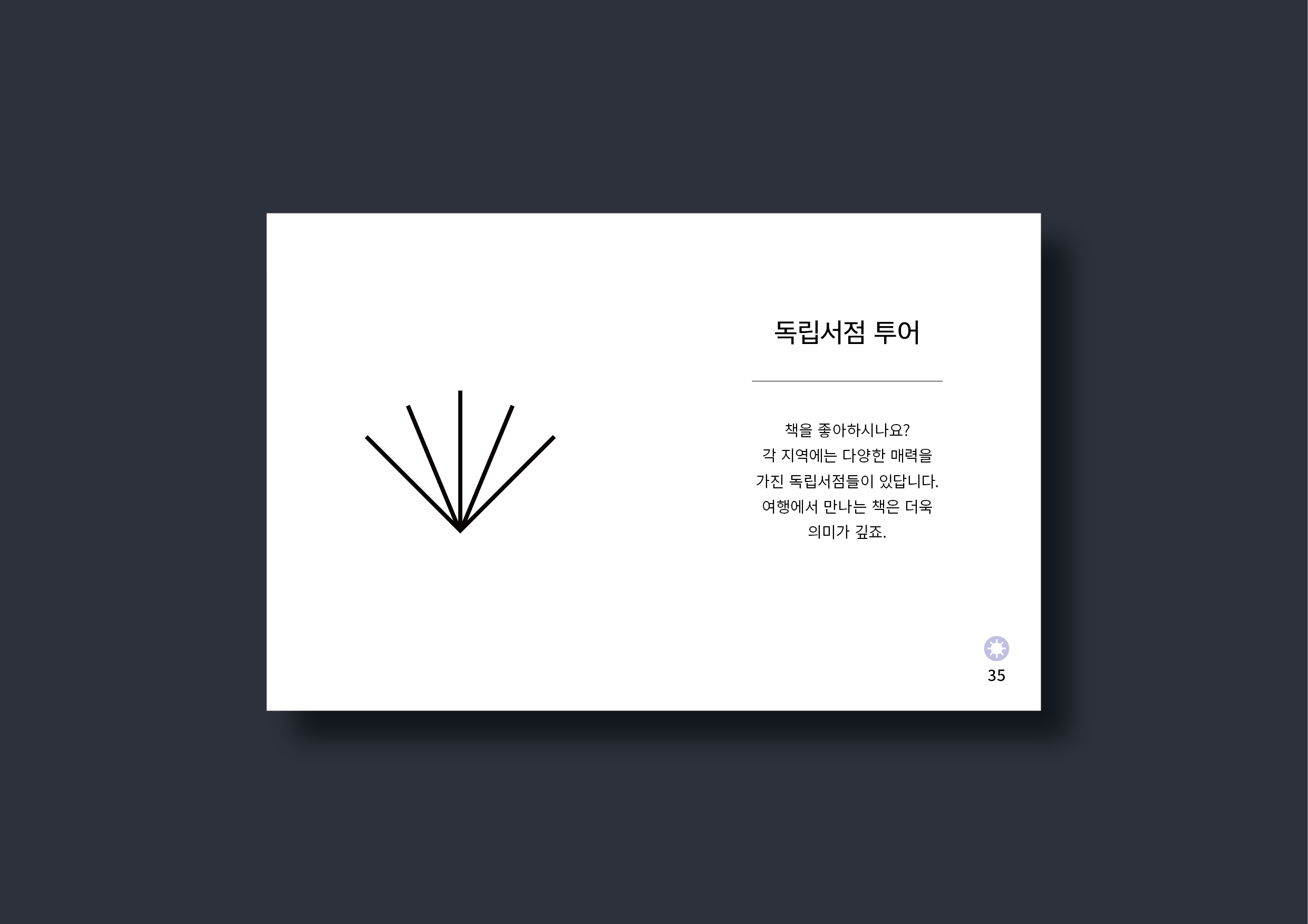 이 프로젝트의 선정 공간은 이다. 우리는 경의선 책거리를 “책의 가치를 공유하며 자연과 시민이 함께 어우러지는 공간”으로 재해석하였고, 이 공간을 하나의 전시회로 바라보았다. 하나의 길로 이어진 산책로에서 자연과 인공, 우리와 문학과 같은 다양한 이어짐을 발견하여 이라는 제목을 짓게 되었으며, 전시회라는 컨셉에 맞추어 도록, 티켓 등을 제작하였다. 김소은 soeunnnn@naver.com @so.eunnn 서단비 sdb6729@naver.com @sweetrain_studio 석지원 kristy0428@naver.com @_seokdoldol HTML 삽입 미리보기할 수 없는 소스