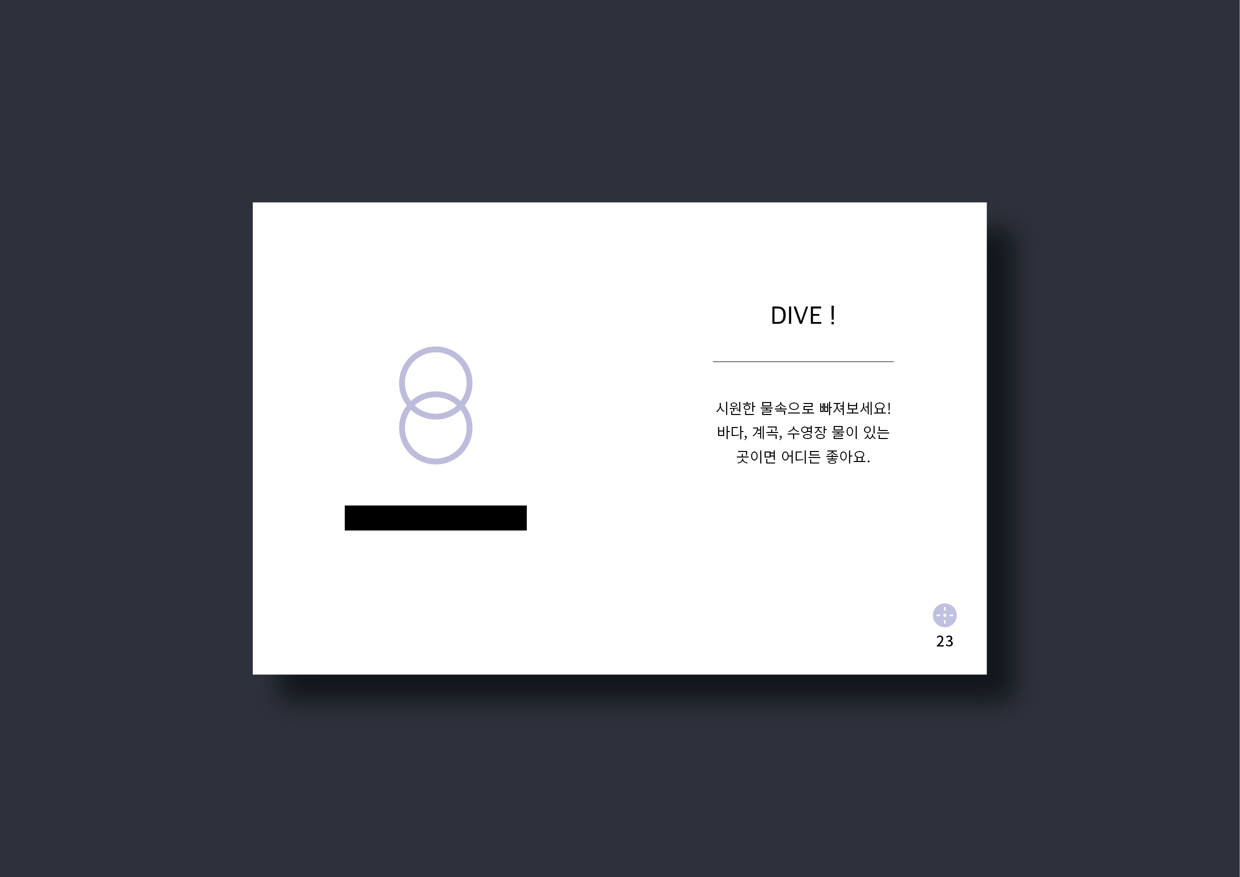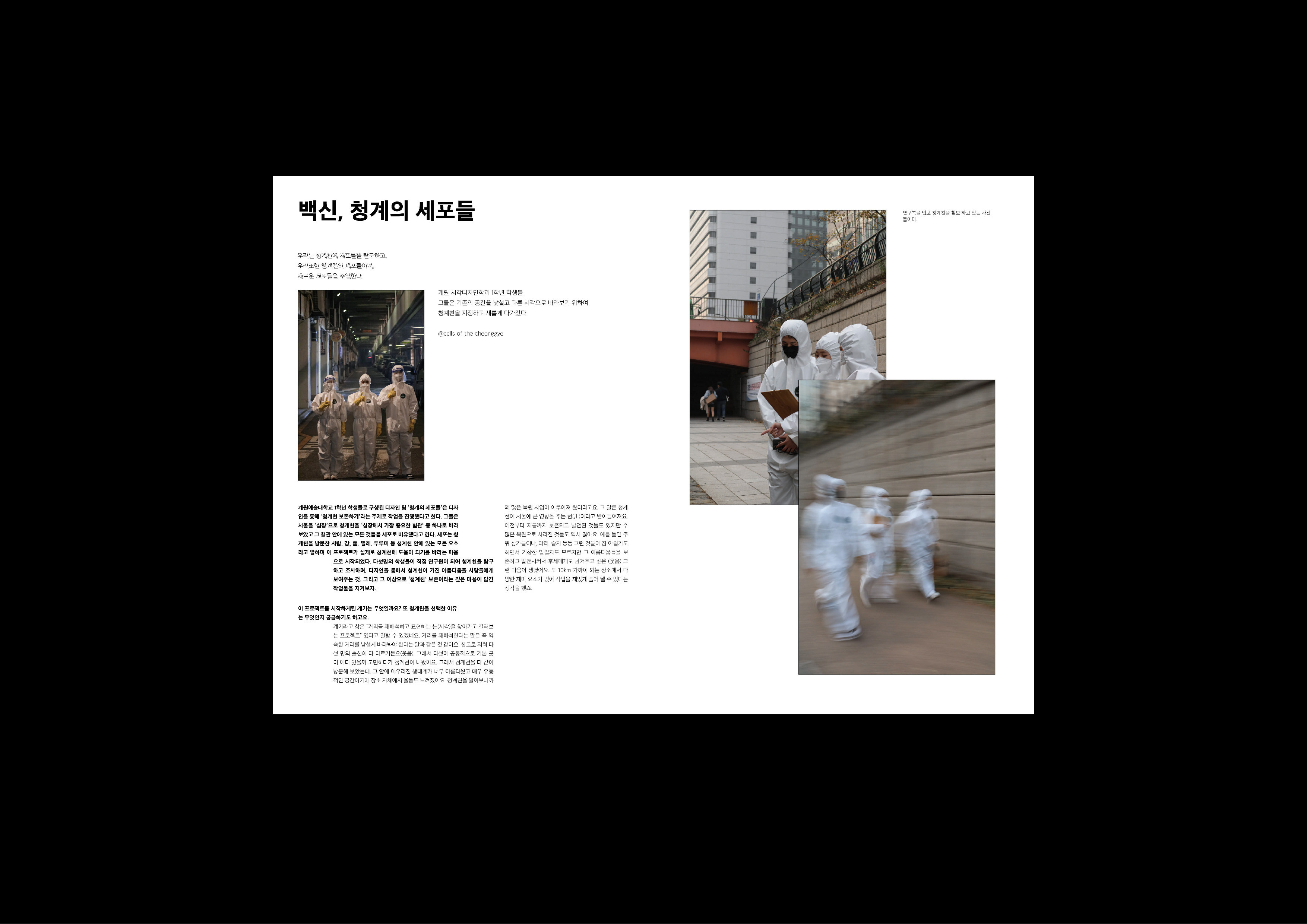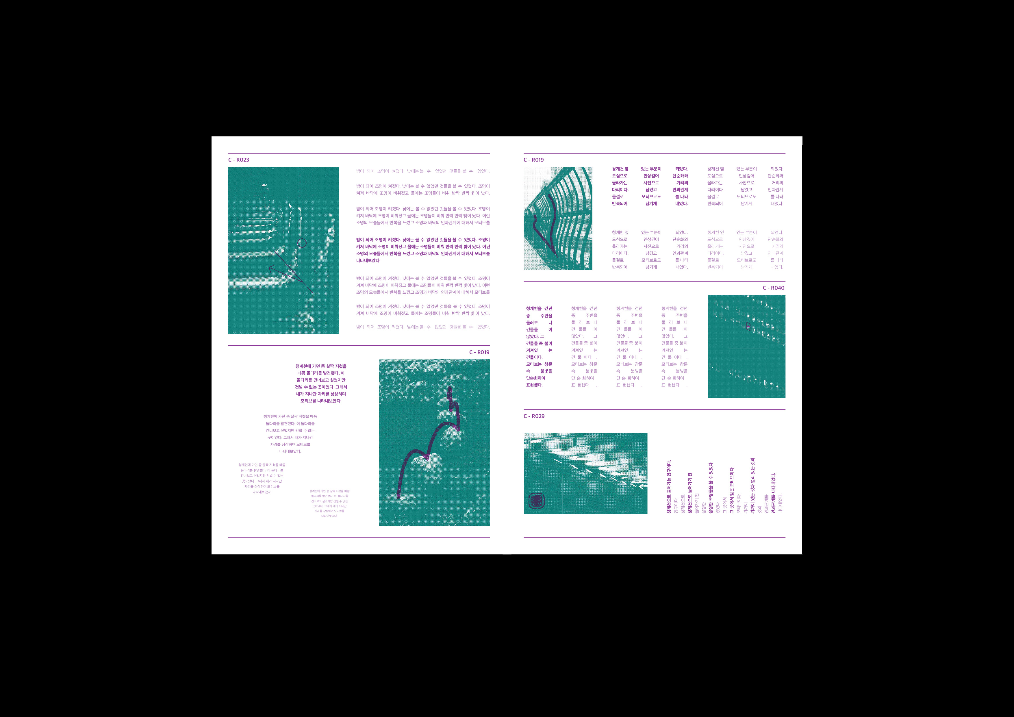 서울을 ‘심장’으로, 청계천을 ‘심장으로부터 흐르는 혈관(혈액)’으로 바라보았고 그 혈관 안에 있는 모든 것들을 세포로 비유했다. 세포는 청계천을 방문한 사람, 강, 풀, 벌레, 두루미 등 청계천 안에 있는 모든 요소라고 말하며 이 프로젝트가 실제로 청계천에 도움이 되기를 바라는 마음으로 시작되었다. 다섯 명의 학생들이 직접 연구원이 되어 청계천을 탐구하고 조사하며, 디자인이라는 도구를 통해서 청계천이 가진 아름다움을 사람들에게 보여주는 것. 그리고 그 이상으로 ‘청계천’ 보존이라는 깊은 마음이 담긴 작업물이다. 김길홍 augustme415@gmail.com @yeoho_k 김민성 rlaalstjd0824@naver.com @_.m_.s__ 김예주 kimjung201@naver.com @ye_juice1..