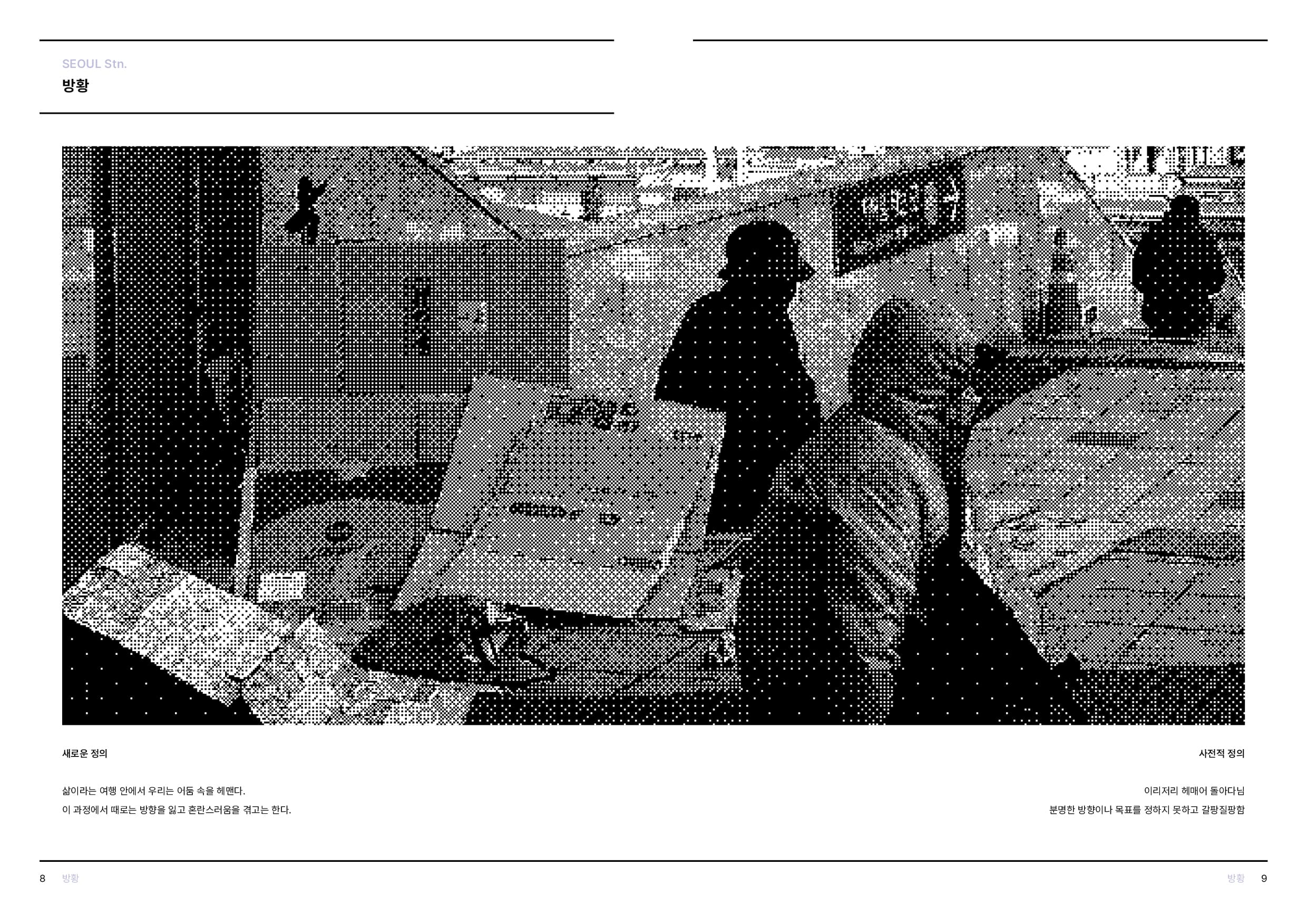 ‘서울역, 버스환승센터, 문화역284, 서울로’ 을 재해석하여 새로운 정의를 내렸다. 무심코 지나쳤던 주변 사람들의 말소리와 사물 그리고 바닥들에 집중했고 사람과 공간 그리고 사물들 안에서 보여지는 재미있는 관계를 발견했다. 사전적 정의의 서울역과, 재해석된 서울역의 이면들을 볼 수 있다.