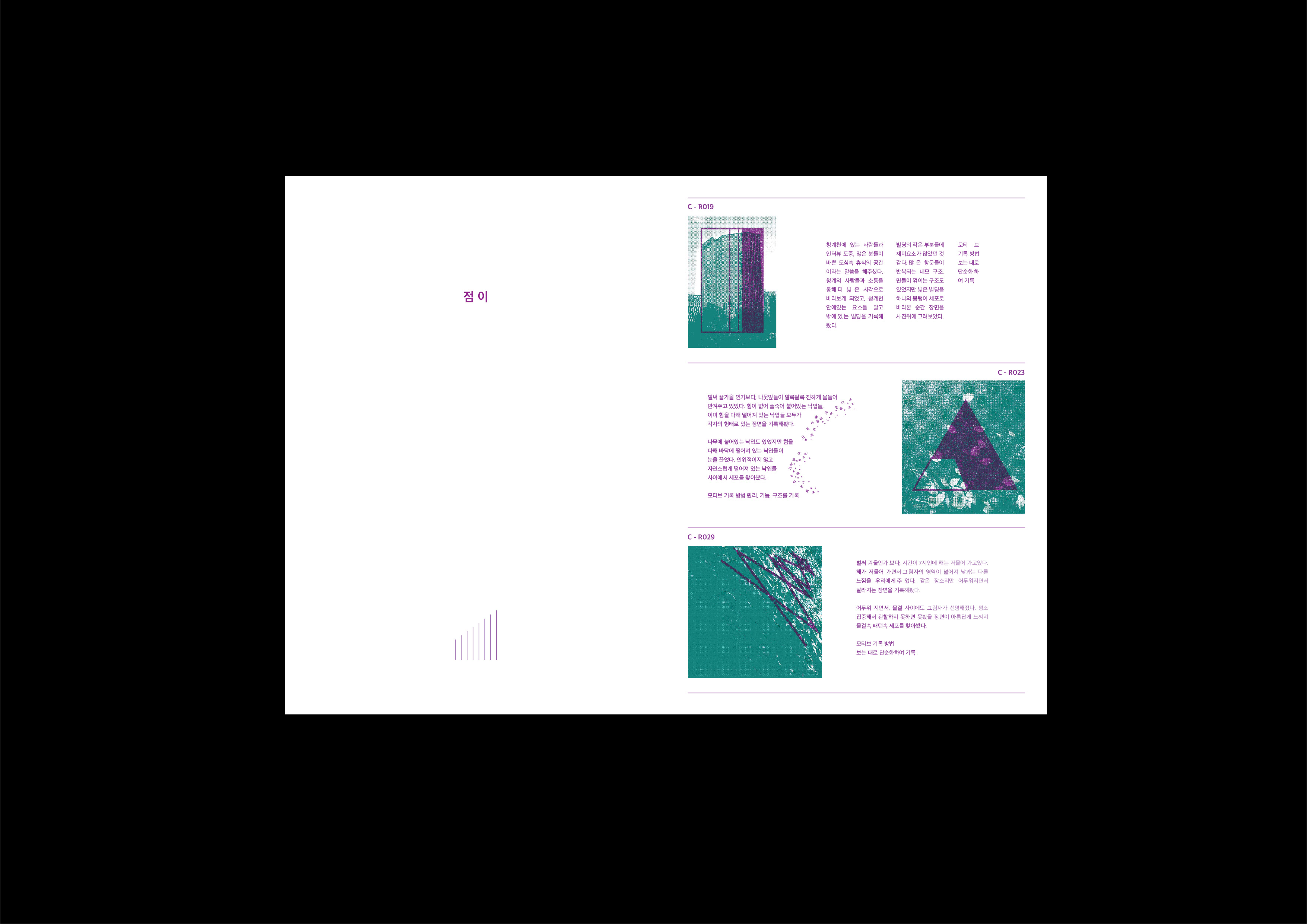 기억의 기록이라는 주제로, 변화의 색상인 파랑에서 따온 남색을 활용해 기록을 구성했습니다. 이 챕터는 한강 현장을 답사하며 경험한 기억과 감정을 탐구하는 과정을 담고 있습니다. 한강의 모티브를 분해하고 재조립하며, 새로운 해석을 통해 변화하는 한강의 모습을 기억과 감정을 각각 나누어 정리했습니다.
