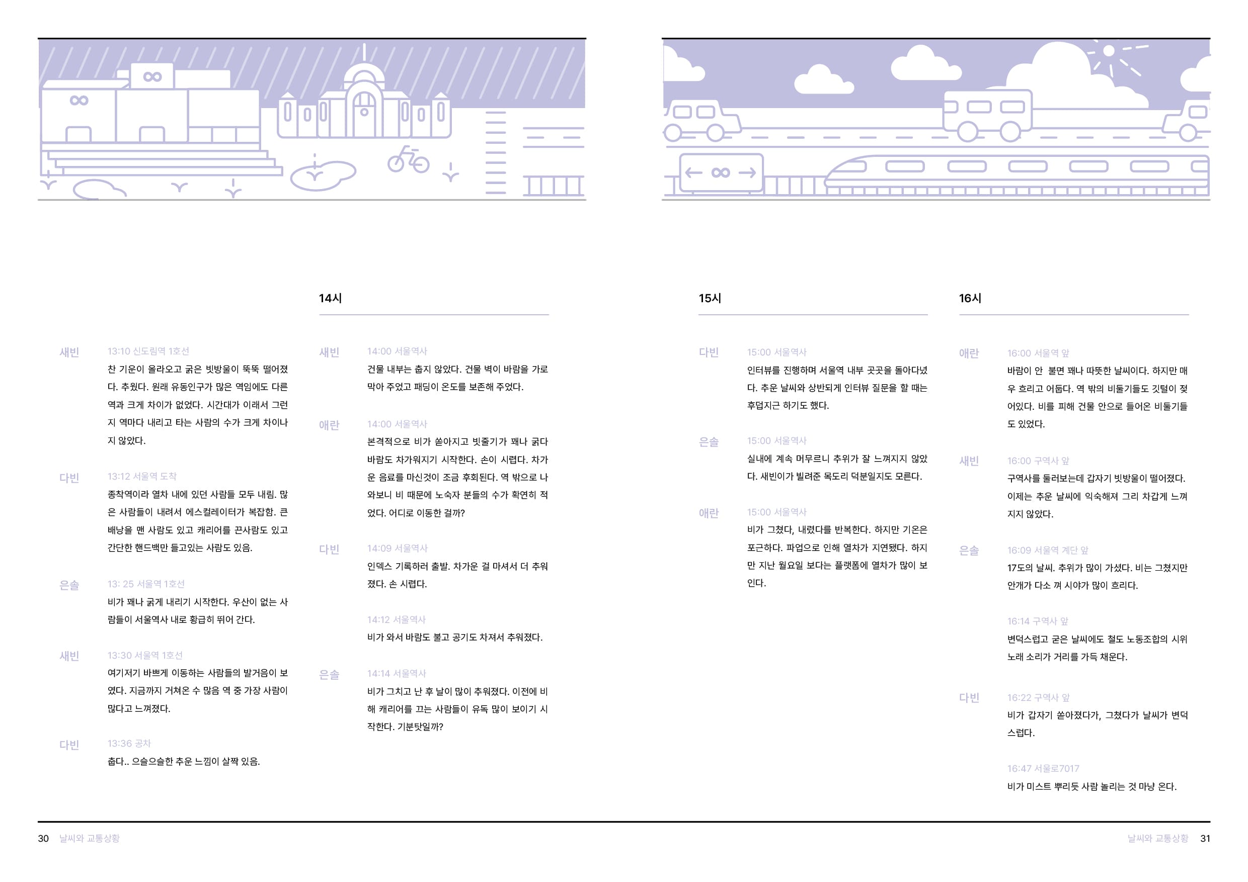 ‘서울역, 버스환승센터, 문화역284, 서울로’ 을 재해석하여 새로운 정의를 내렸다. 무심코 지나쳤던 주변 사람들의 말소리와 사물 그리고 바닥들에 집중했고 사람과 공간 그리고 사물들 안에서 보여지는 재미있는 관계를 발견했다. 사전적 정의의 서울역과, 재해석된 서울역의 이면들을 볼 수 있다. 공은지 dmswlbb@gmail.com @gong_ha 김유진 yourjin.k@gmail.com @yourjin.k 신세임 samescene@gmail.com @same.scene 유이수 yoolee4@naver.com