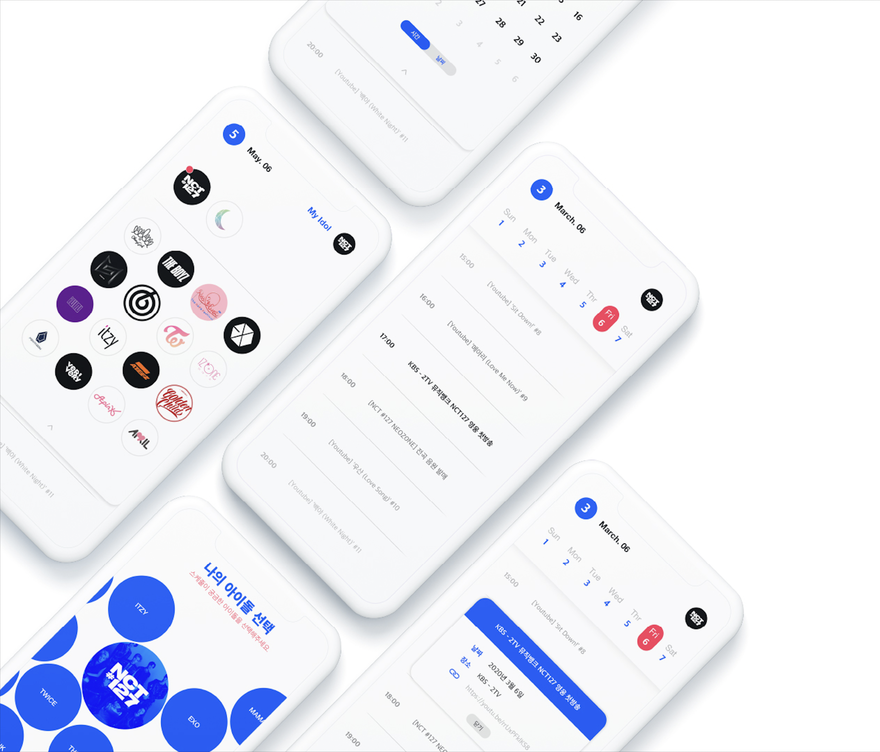 내가 좋아하는 아이돌의 스케줄을 좀 더 쉽게 확인할 수 없을까? 라는 생각에서 시작된 앱, 기존의 불편했던 앱과 달리 최소한의 기능으로 사용에 간편하게 되어있다.