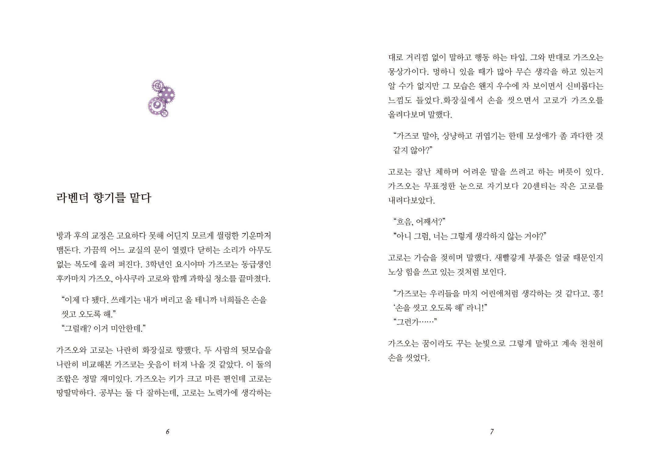 1. 첫 발매 후 변함없는 표지 디자인을 만화의 이미지에서 벗어난 새로운 표지 디자인으로 변경. (이미지, 색, 도형, 콜라주 등 활용) 2. 짧은 문단 형식과 들여쓰기가 많은 본문을 읽기에 무리 없는 문장배열로 재구성. 3. 대사와 글줄의 구분이 어려운 본문을 정리하여 대사와 글줄을 명확하게 구분. 4. 미세한 차이로 규격을 벗어나는 판형을 기존 판형과 비슷한 4x6판(B6)으로 변경. 소설 내에서 중요한 요소로 작용하는 라벤더, 시계, 소녀 등을 주된 소재로 잡아 판타지 성장소설의 신비로운 느낌을 주는 폰트와 함께 전체적으로 리디자인 하였습니다. 김가영 gayoung5154@naver.com 김나현 florauno@naver.com