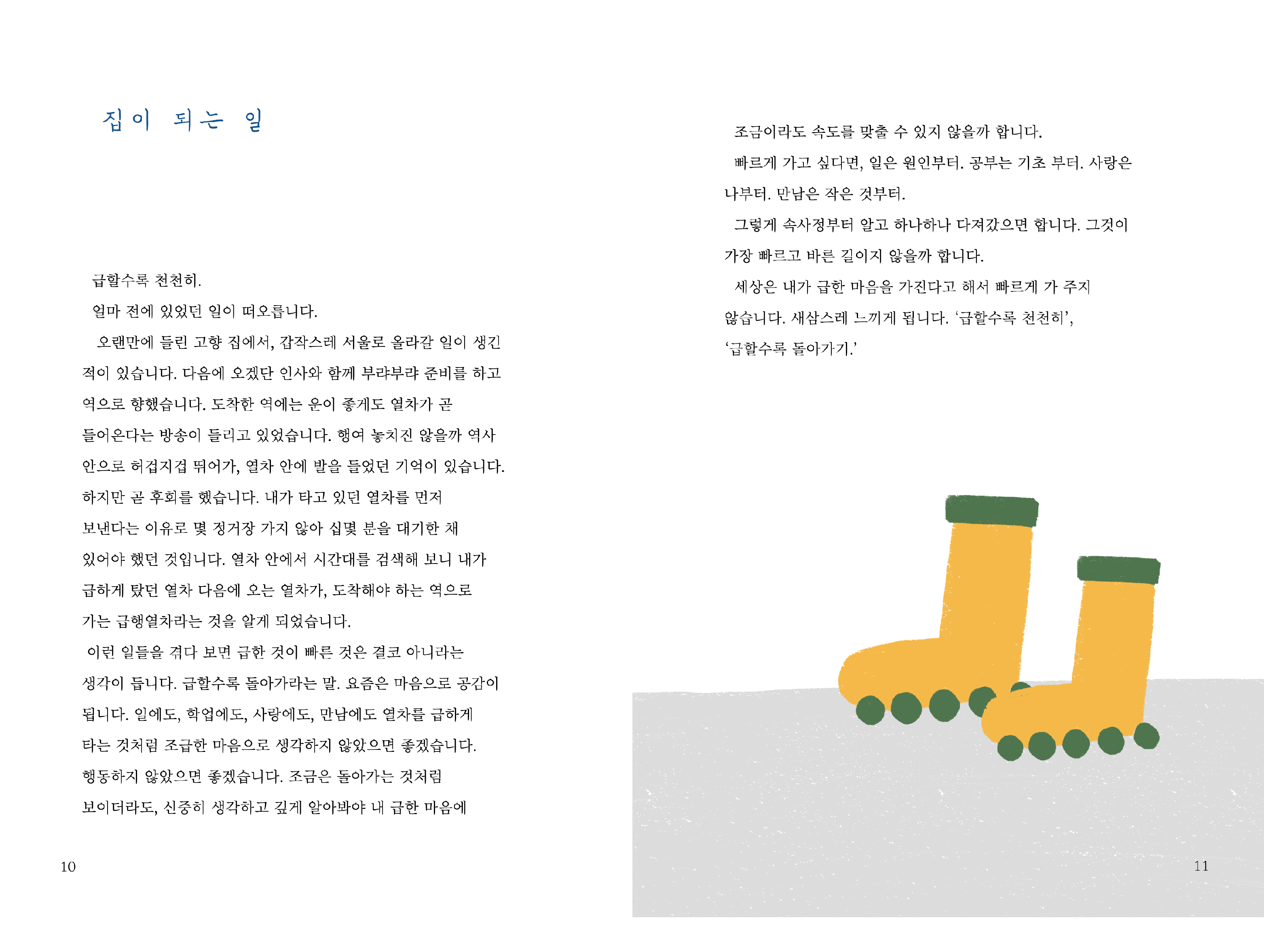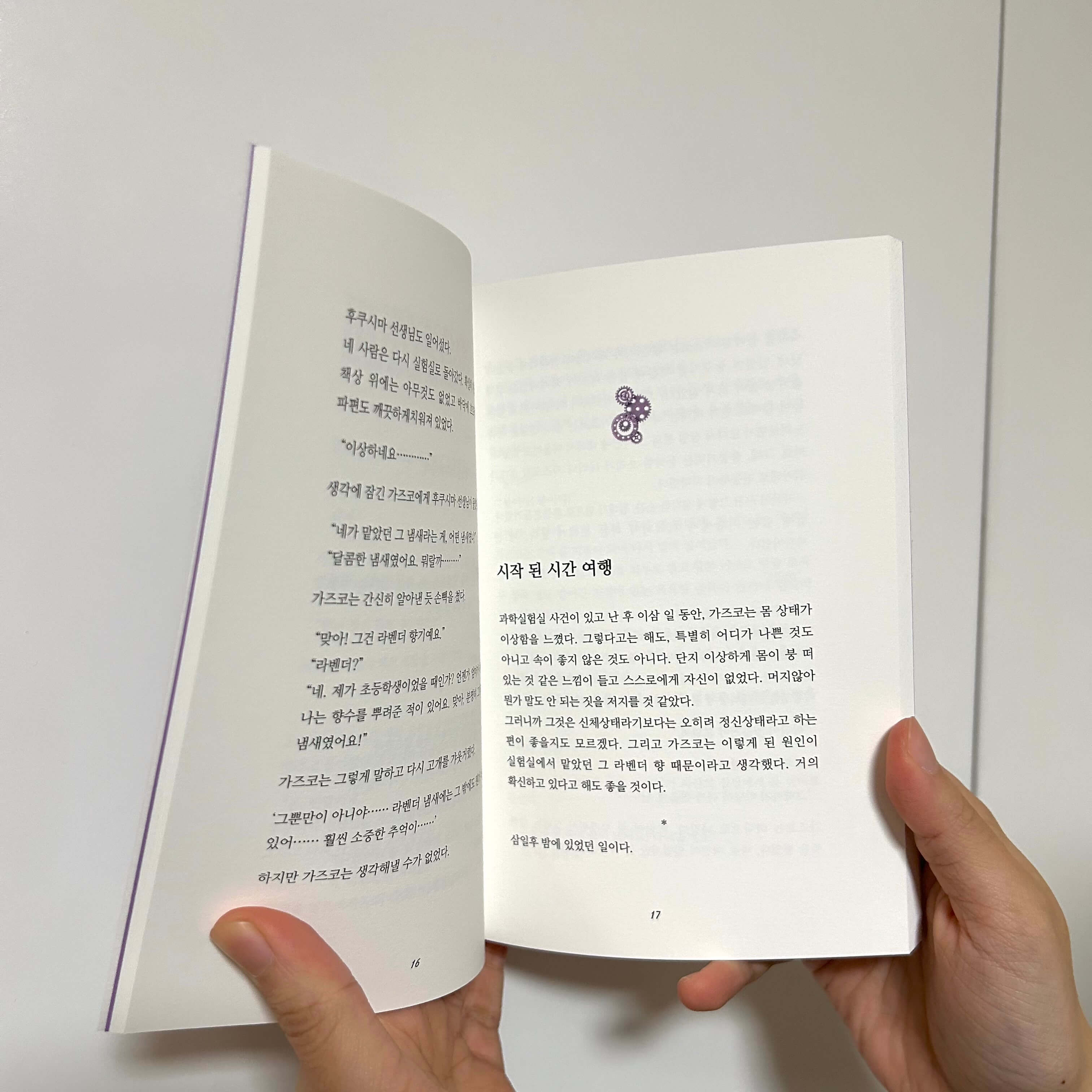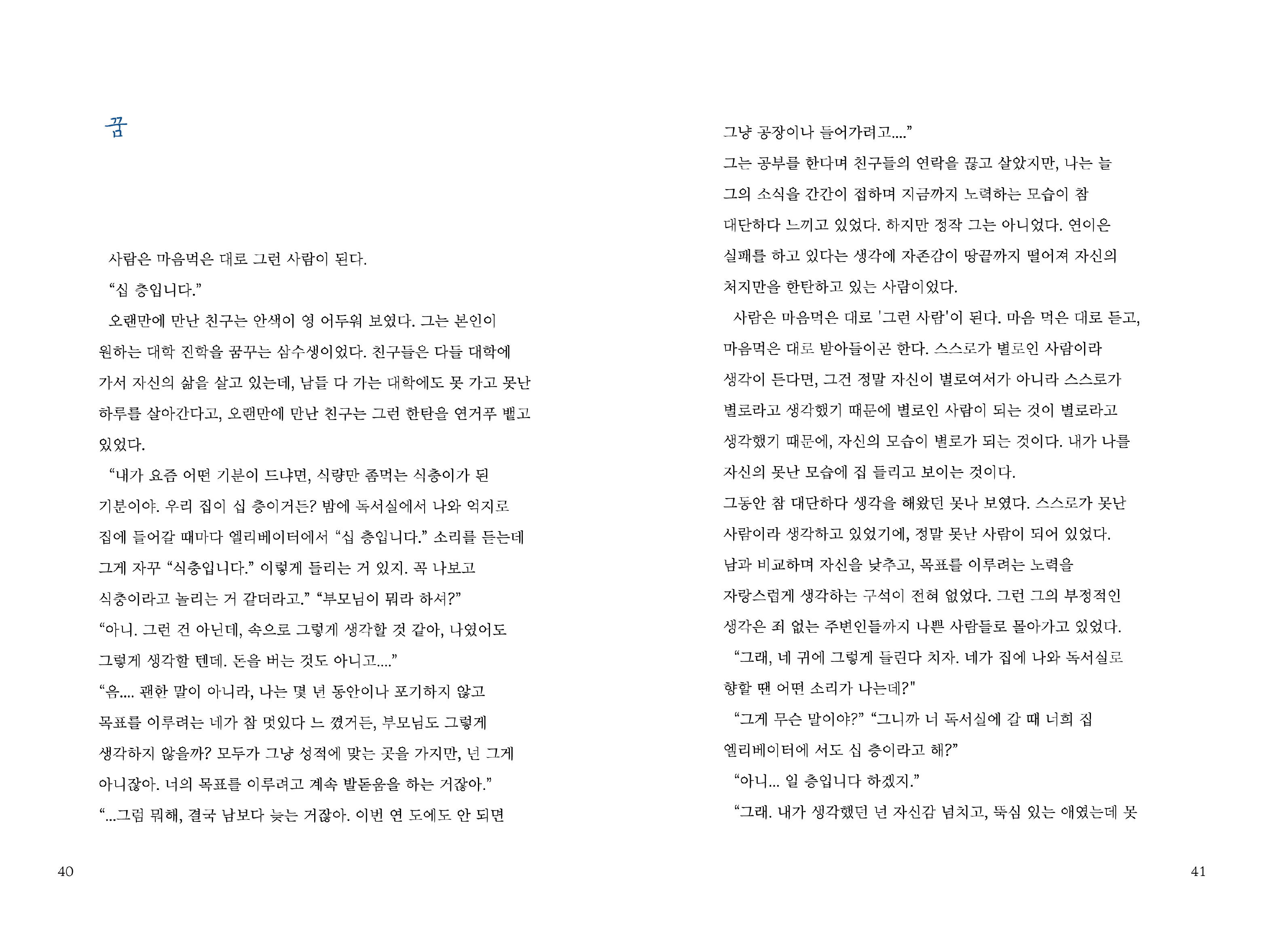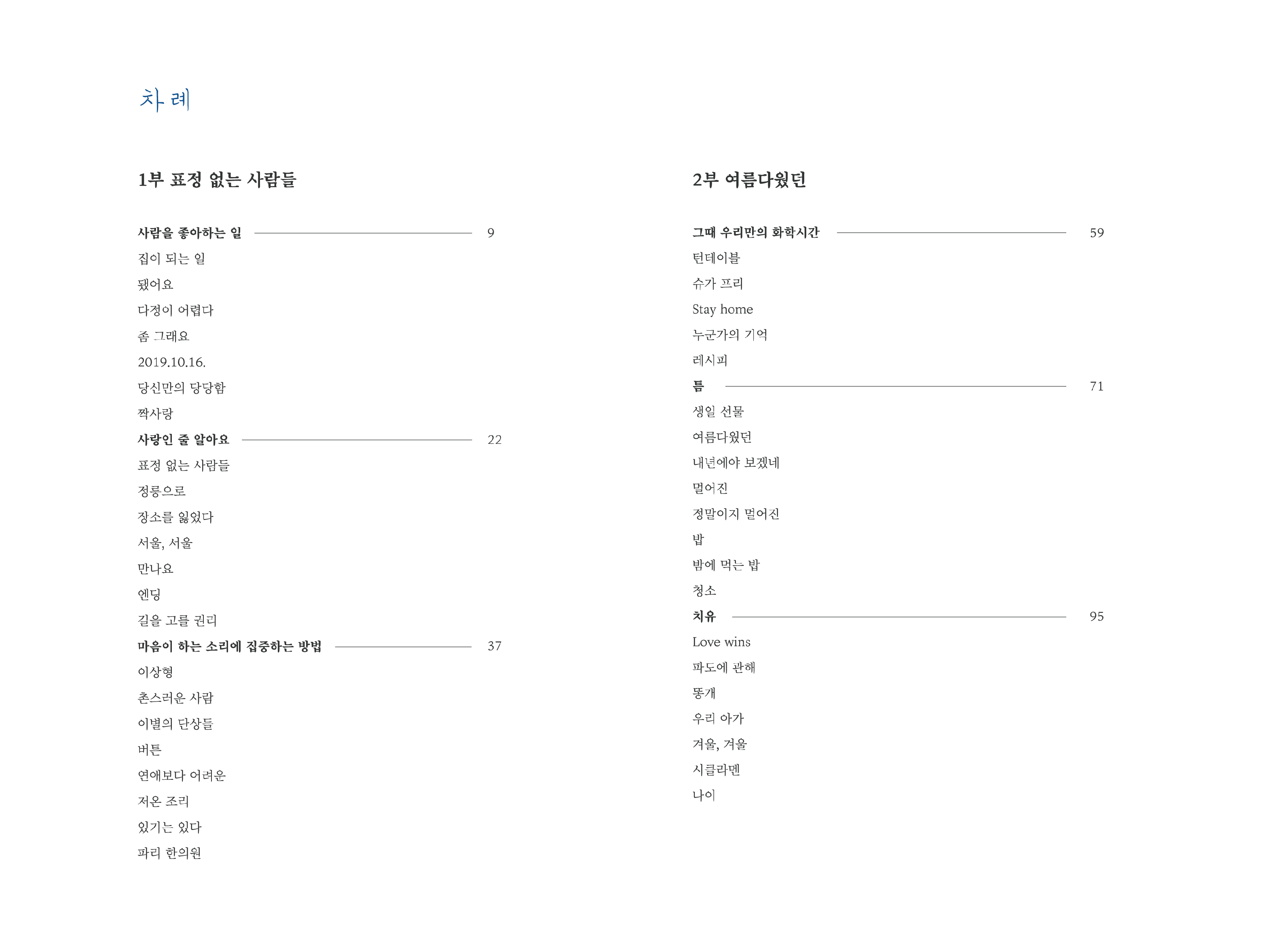 서정적인 드로잉, 가벼운, 등을 디자인 키워드로 도출해 수록된 소설 속 오브젝트를 콜라주 형식으로 배치했다. 또한 제목과 색지, 장 챕터를 푸른색으로 사용하고, 표지에서 그려진 상징물들을 장 챕터에 배치하여 전개하여 독자가 한 권의 책을 끝까지 넘겼을 때 전체적인 시각적 연결성을 느낄 수 있어 독자의 흥미를 지속해서 끌 수 있는 것 또한 목표로 하여 디자인했다.