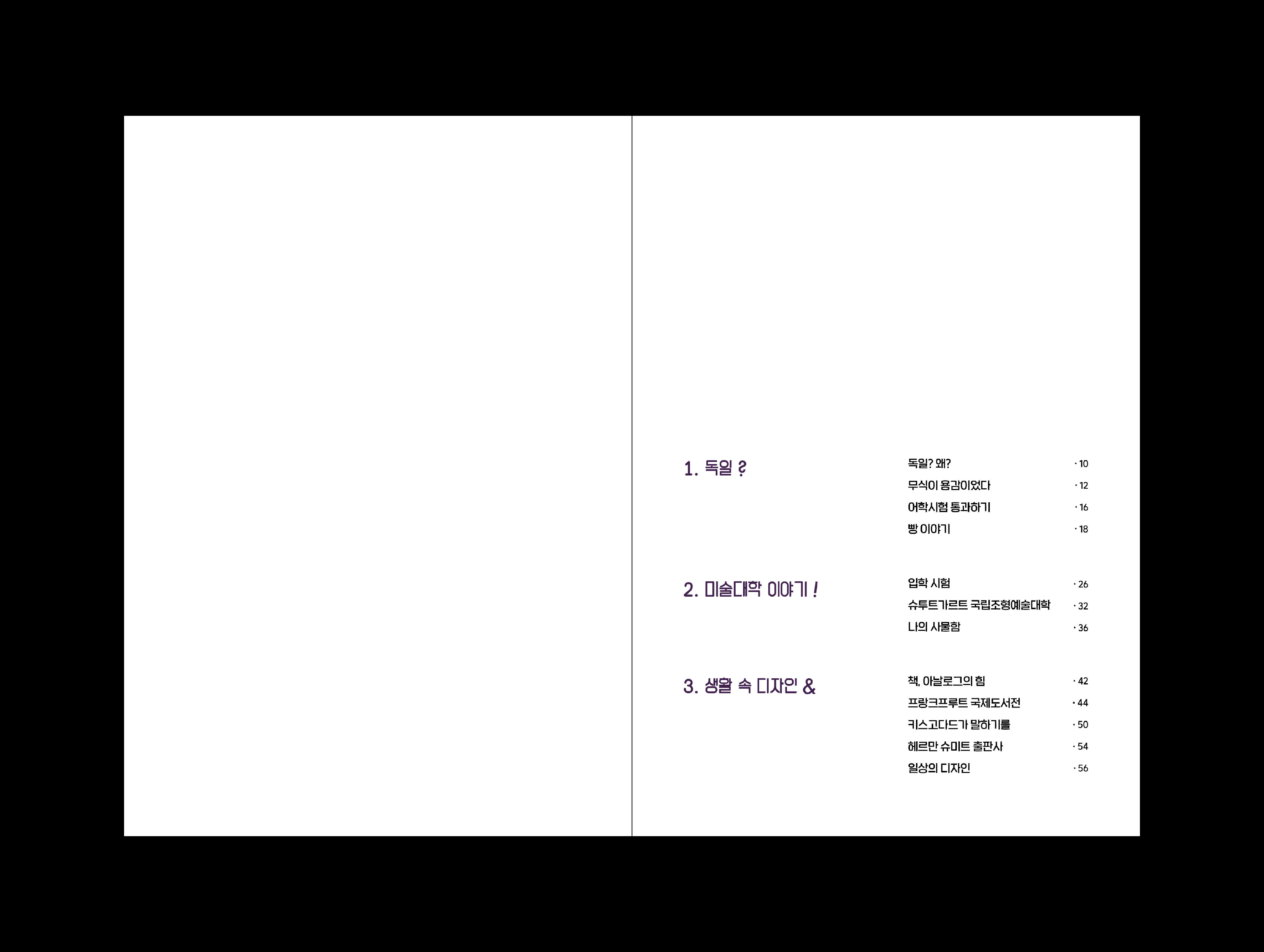 2008년 안그라픽스에서 출간된 원작 ‘독일 디자인여행’ 은 디자이너이자 이 책의 저자인 장인영이 보고 듣고 느낀 독일의 일상 이야기를 담은 책이다. 우리는 독자의 다양한 견해를 바탕으로 네이밍을 책 내용과 부합한 ‘#독일#디자인#유학’ 으로 해시태그를 사용하여 수정했다. 표지에는 저자가 독일에서 유학 생활을 하며 느낀 점, 독일의 분위기가 담긴 책을 어쩌면 일상적인 모습으로 간결하게 담아 저자의 평범한 일상이지만 그 걸음에는 수많은 이야기가 담겨 독자로 하여금 소중한 간접 경험으로 해석되도록 디자인했다. 도비라장에는 별색을 포인트로 목차를 구별했다. 박지원 923roomm@gmail.com @soir.soir 유하늘 usky200021@naver.com @usky.desk 장민경 rudalswkd08@..