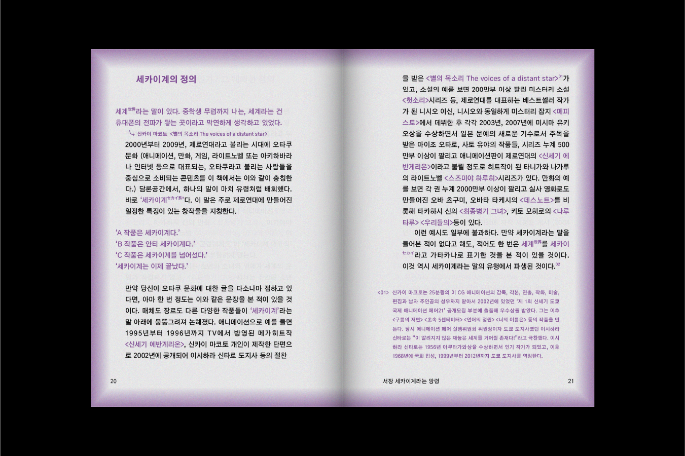 서브컬처에 관심 있는 사람들을 대상으로 한 몰입감 있는 내용으로 많은 독자의 집중을 이끌었던 서적 ‘세카이계란 무엇인가’ 그 몰입감에 비해 내부 디자인은 여백이 많고 지루한 구성으로 되어있었다.