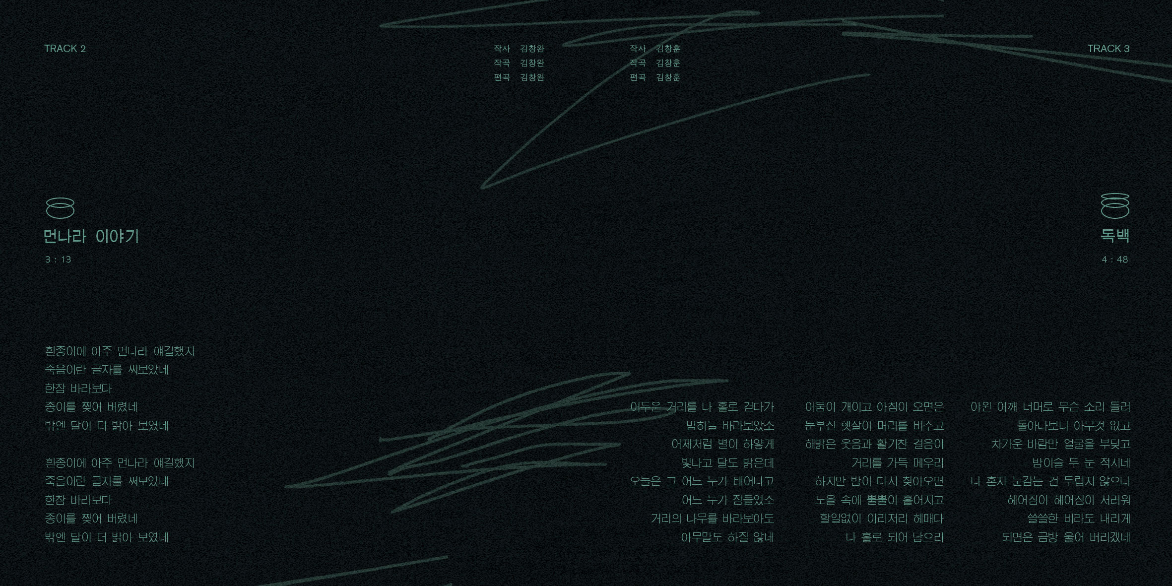 아티스트 산울림의 7집 '독백'의 앨범커버와 내지, CD 리디자인이다. 아무도 없는 공간에 홀로 남겨진 화자. 누군가에게 보내는 화자의 외침이 존재하지만, 화자의 공간에는 아무도 없기에 아무런 대답이 돌아오지 않는다. 홀로 독백을 하는 화자의 외로움과 쓸쓸함을 표현하였다. 최수영 swimchooi@gmail.com @swimchooi
