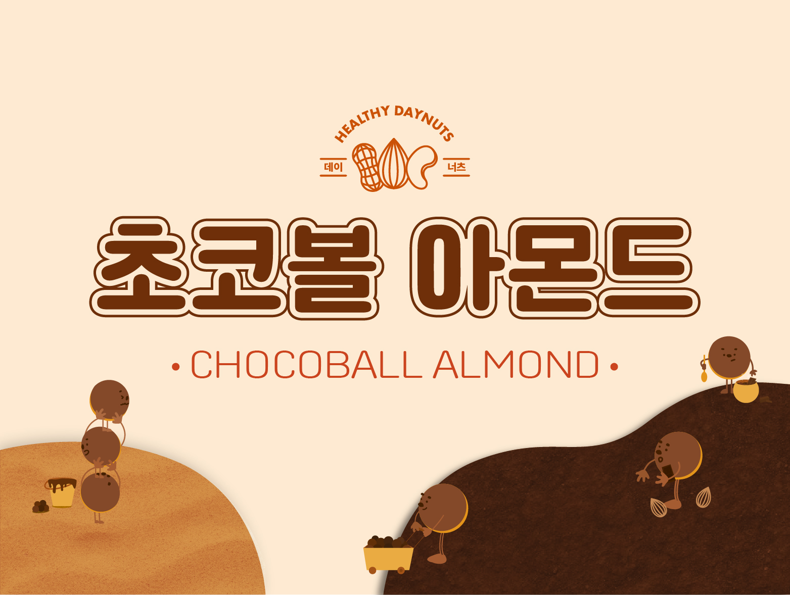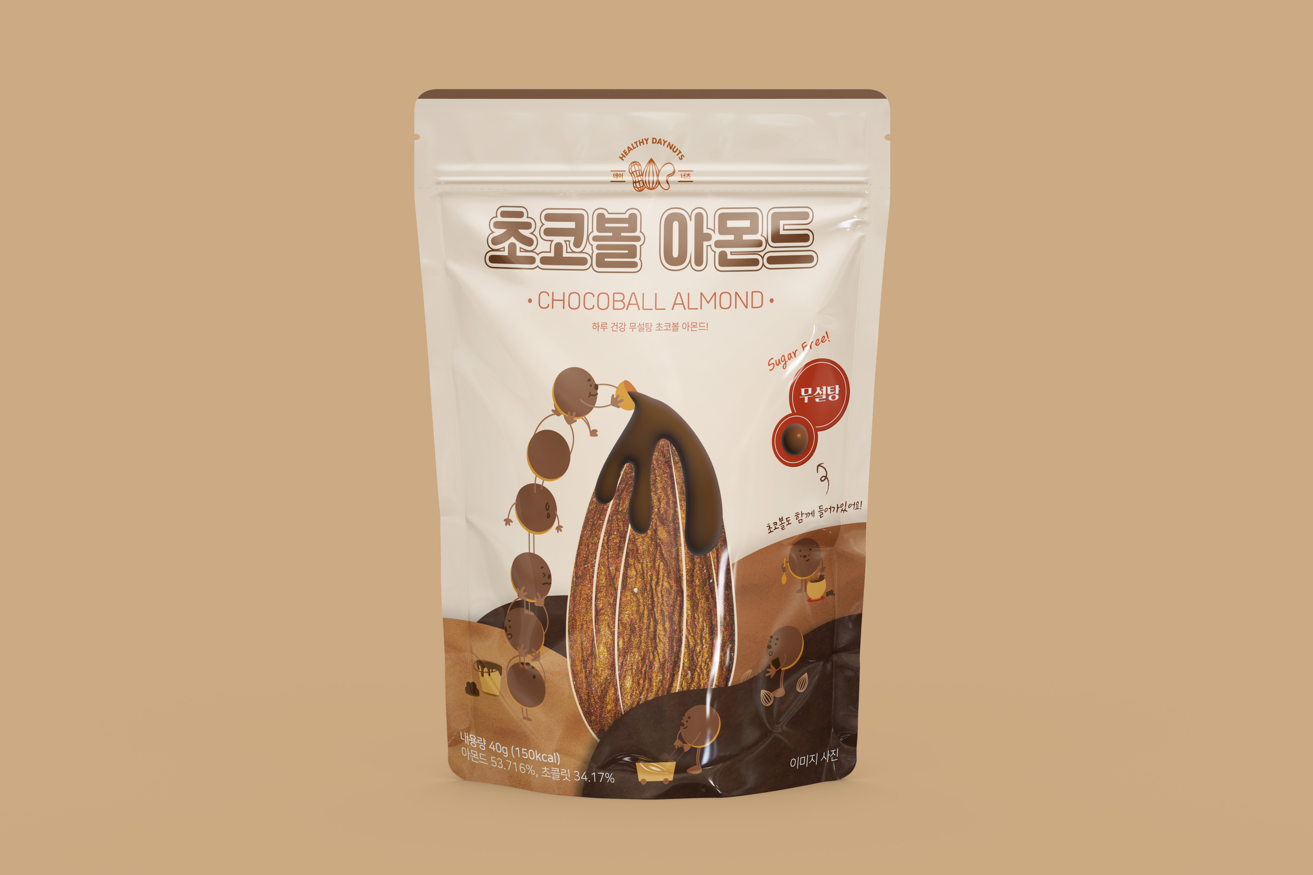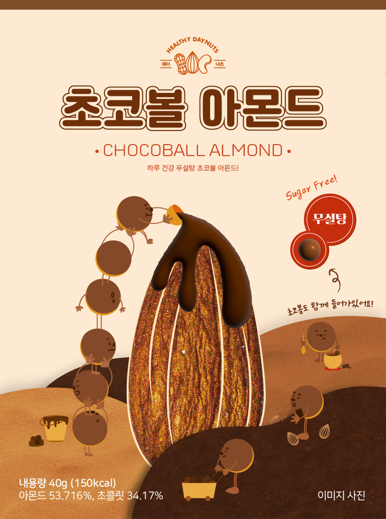 일반 아몬드에 무설탕 초코볼을 첨가한 건강한 아몬드 스낵 패키지를 제작했습니다. 초코볼을 캐릭터화하여 서로 도와가며 초콜릿을 붓거나 초콜릿을 녹이는 각각의 행동을 주어 귀여움과 생동감있는 디자인을 하였습니다. 배경에는 초콜릿 동산을 표현해 처음에는 단색으로만 했다가 텍스쳐를 주면 더 재밌겠다는 크리틱을 받고 모래과 흙 텍스쳐를 넣어 입체감을 주었습니다. 패키지의 타이포도 귀여운 컨셉에 맞게 동글동글한 폰트를 사용해주었습니다.