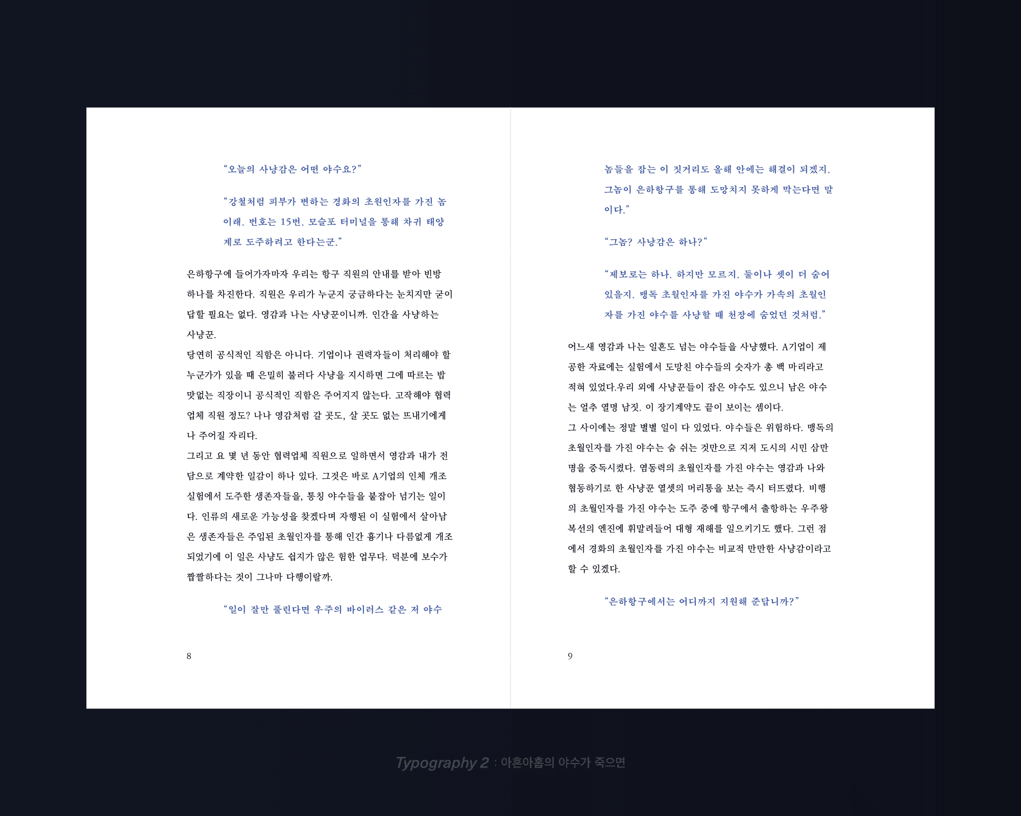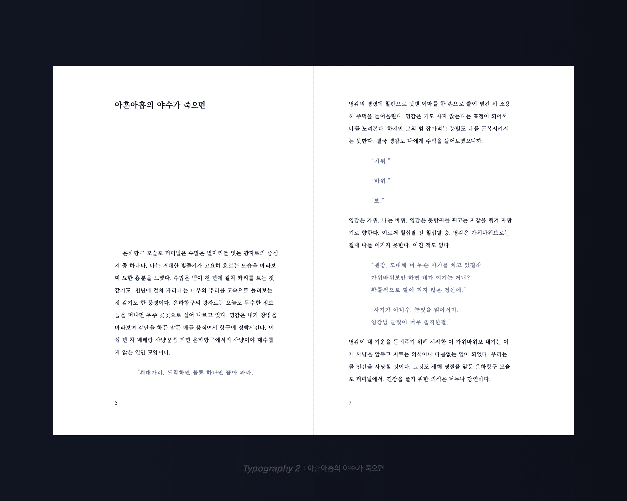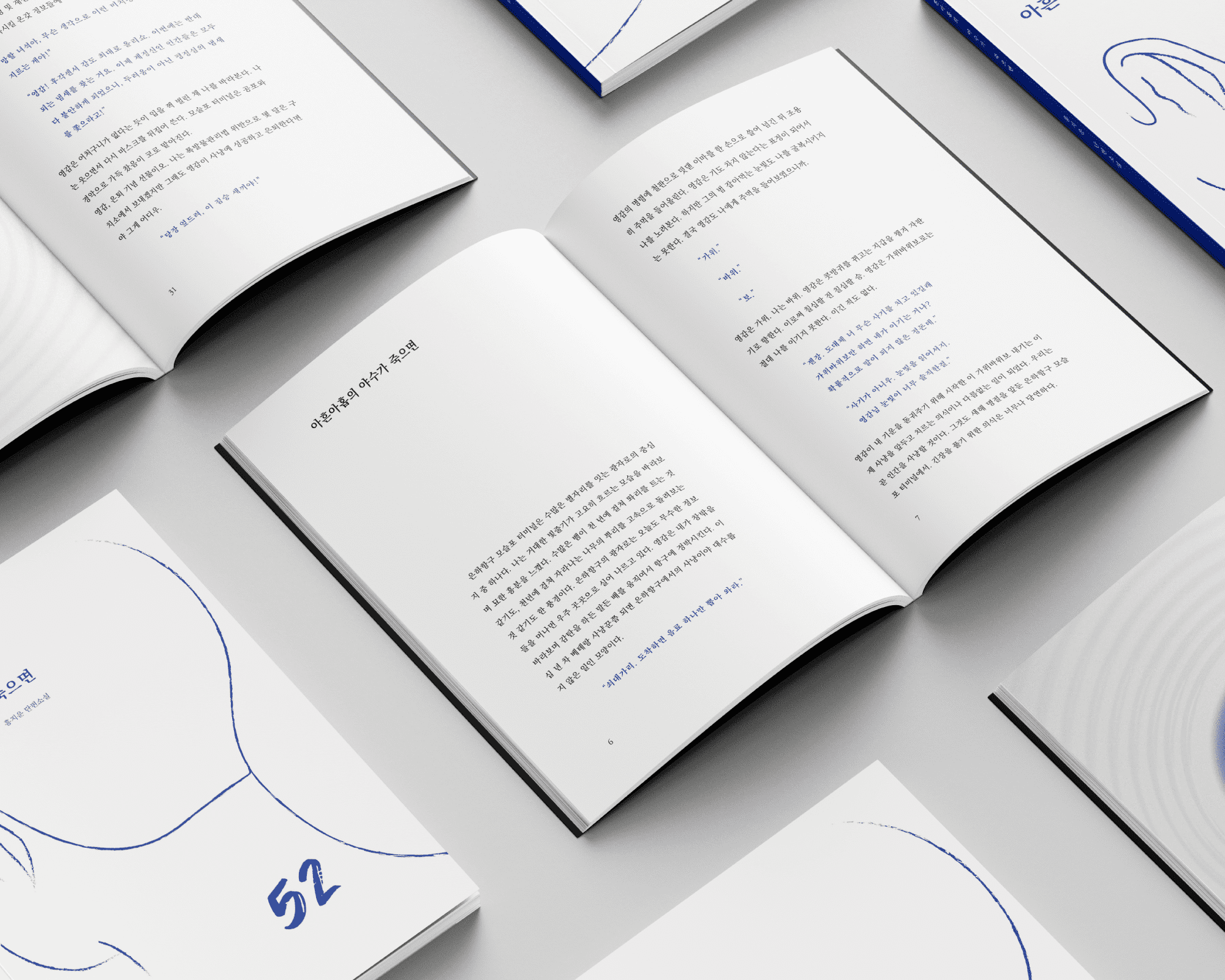 일곱 번째 달 일곱 번째 밤, 한, 중, 일 아시아 설화를 현대적으로 재해석한 단편 소설 모음집. 그중 홍지운 작가의 단편, [아흔아홉의 야수가 죽으면]을 책 디자인 형식으로 리 디자인했다. 가독성을 가장 우선으로 생각하여 작업했으며, 중간중간 내용과 관련된 그래픽을 디자인해 배치하였다. 이새빈 saibin2@naver.com @p_leesaebin