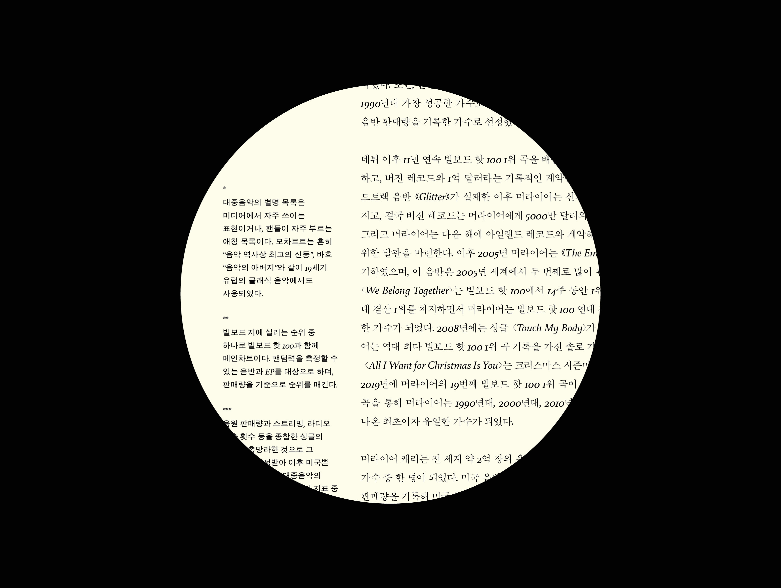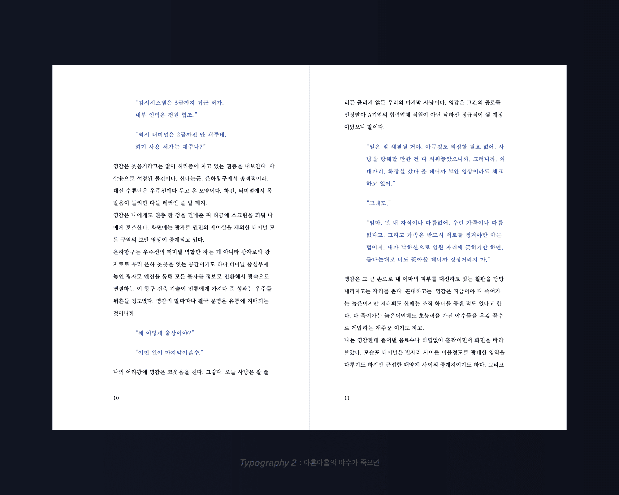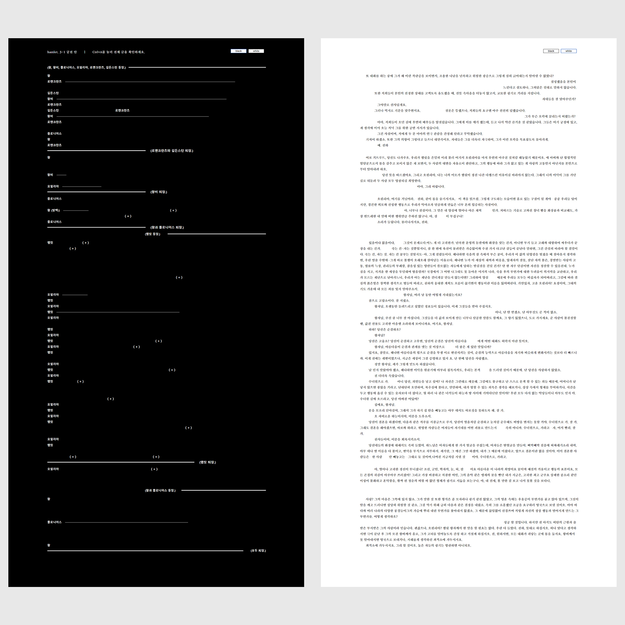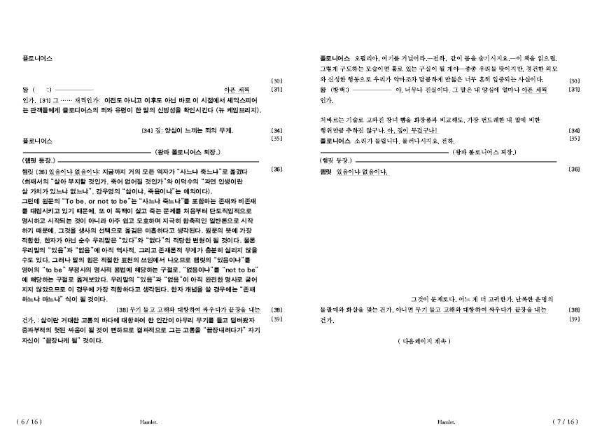 인물 1의 대화가 끝나면 다음장으로 넘겨 인물2의 대화를 확인 할 수 있다. 본문 바로 밑에 주석이 표시되는 희곡 텍스트와는 다르게 인물간의 대화의 흐름에 집중할 수 있도록 주석 페이지는 인물들의 대사와 분리하여 단독으로 구성했다. 수석은 인물 별로 구분하였으며 페이지 번호를 보고 찾아갈 수 있도록 페이지 번호도 표시해주었다. 종이의 지면으로 옮기는 작업을 한 뒤에 웹으로 구현하는 작업을 진행했다. 구성은 크게 바뀌지 않되, 주석은 해당 문장 위에 마우스를 올리면 표시되는 형식으로 바꾸었다. 버튼을 누르면 페이지가 이동하여 마치 e-book을 읽는 듯한 느낌을 준다.