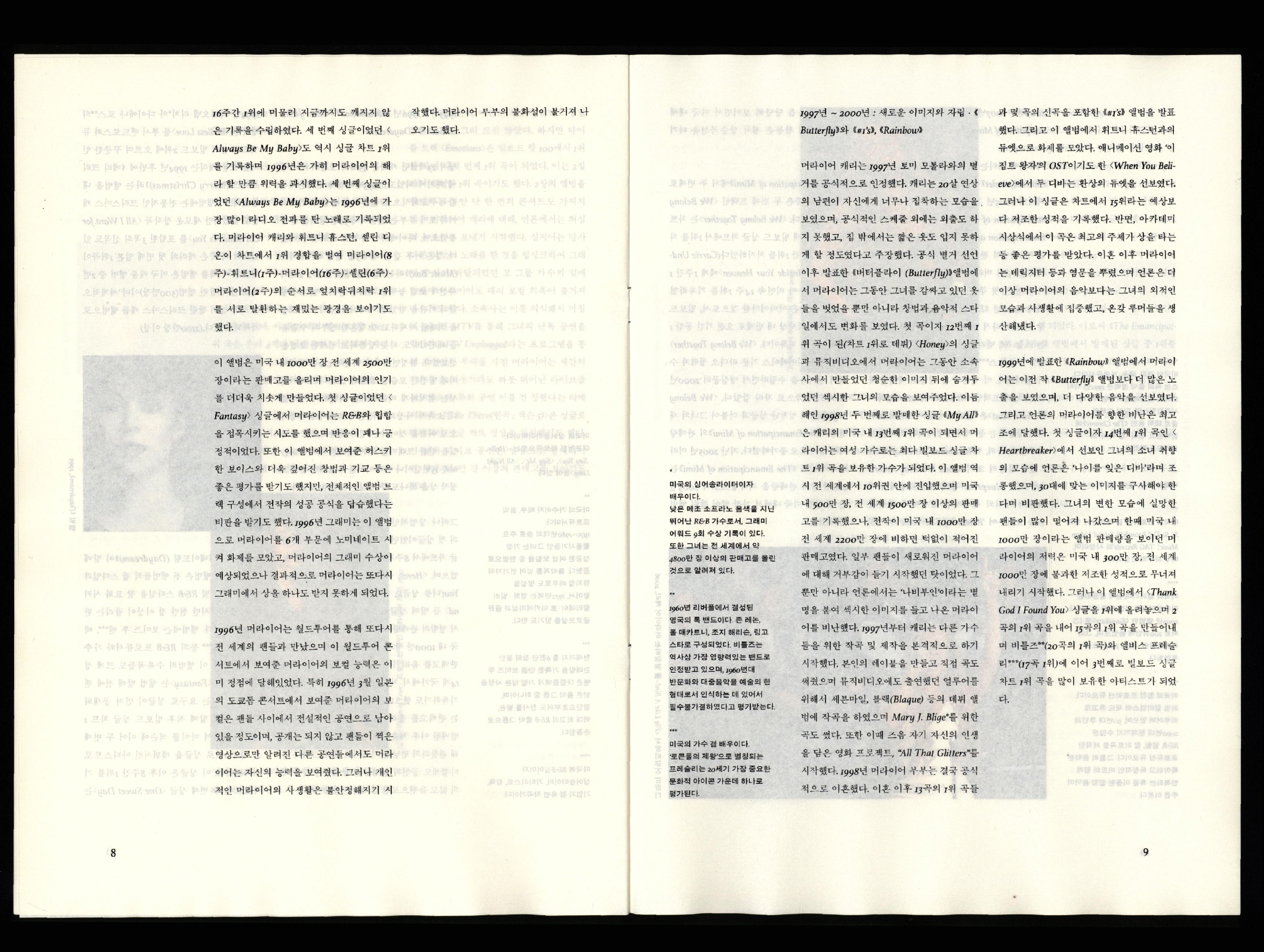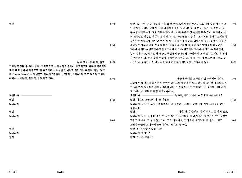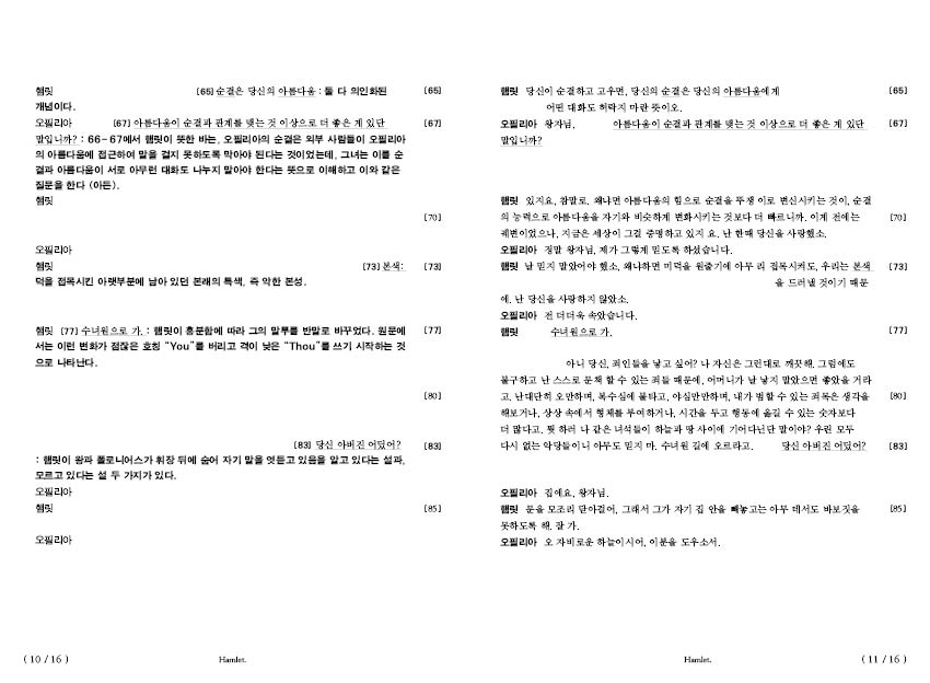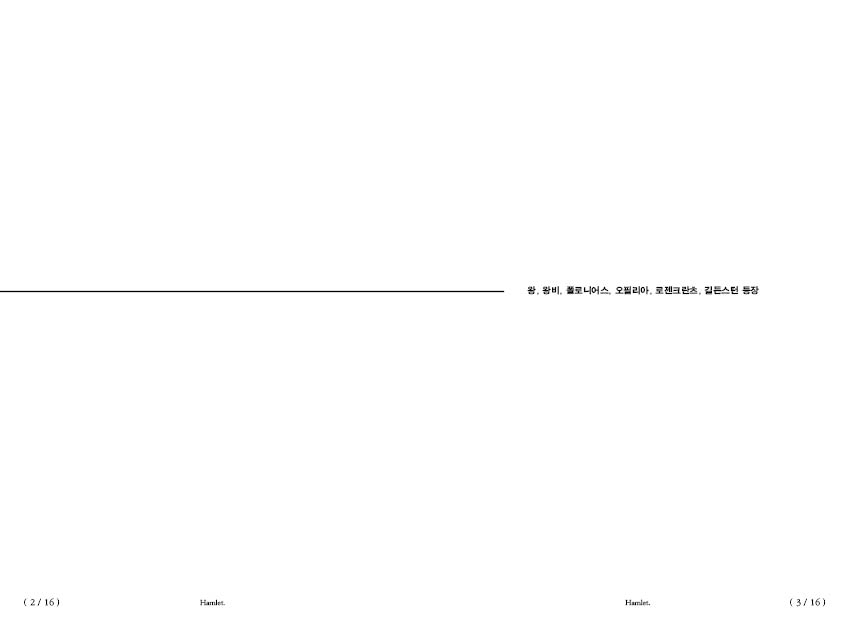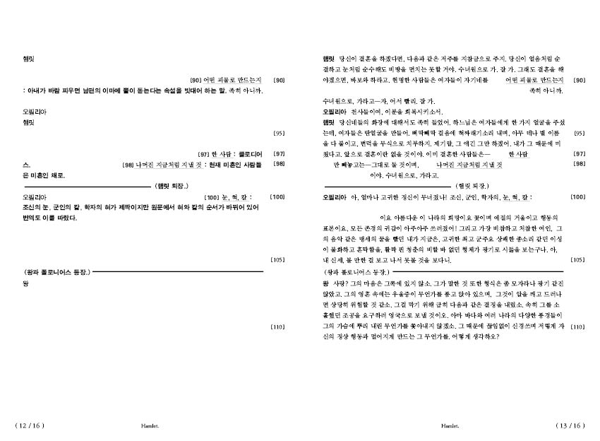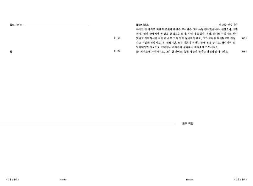 타이포그래피 수업의 햄릿 텍스트를 받고 개인적인 해석을 담아서 미니북 사이즈의 북 편집 작업을 했다. 희곡 텍스트에서 계층별 대화가 있다는 점에 주목하여 각 계층의 그리드를 나누고 해당 인물의 대사가 지정된 그리드를 넘지 않는 규칙을 적용하였다. 가장 상단부분은 왕족, 중간부분은 왕궁 신하들과 햄릿, 오필리아, 하단은 배우 셋으로 구분한다. 기본형식에서 변주가 되는 부분은 인물간 대화를 하는 부분인데, 책을 보는 이로 하여금 책장을 넘길 때 대화를 주고받는 것처럼 보이기도록 연출하기 위해 선을 따라 페이지를 자르는 작업을 했다. 인물 1의 대화가 끝나면 다음장으로 넘겨 인물2의 대화를 확인 할 수 있다. 본문 바로 밑에 주석이 표시되는 희곡 텍스트와는 다르게 인물간의 대화의 흐름에 집중할 수 있도록 주석..