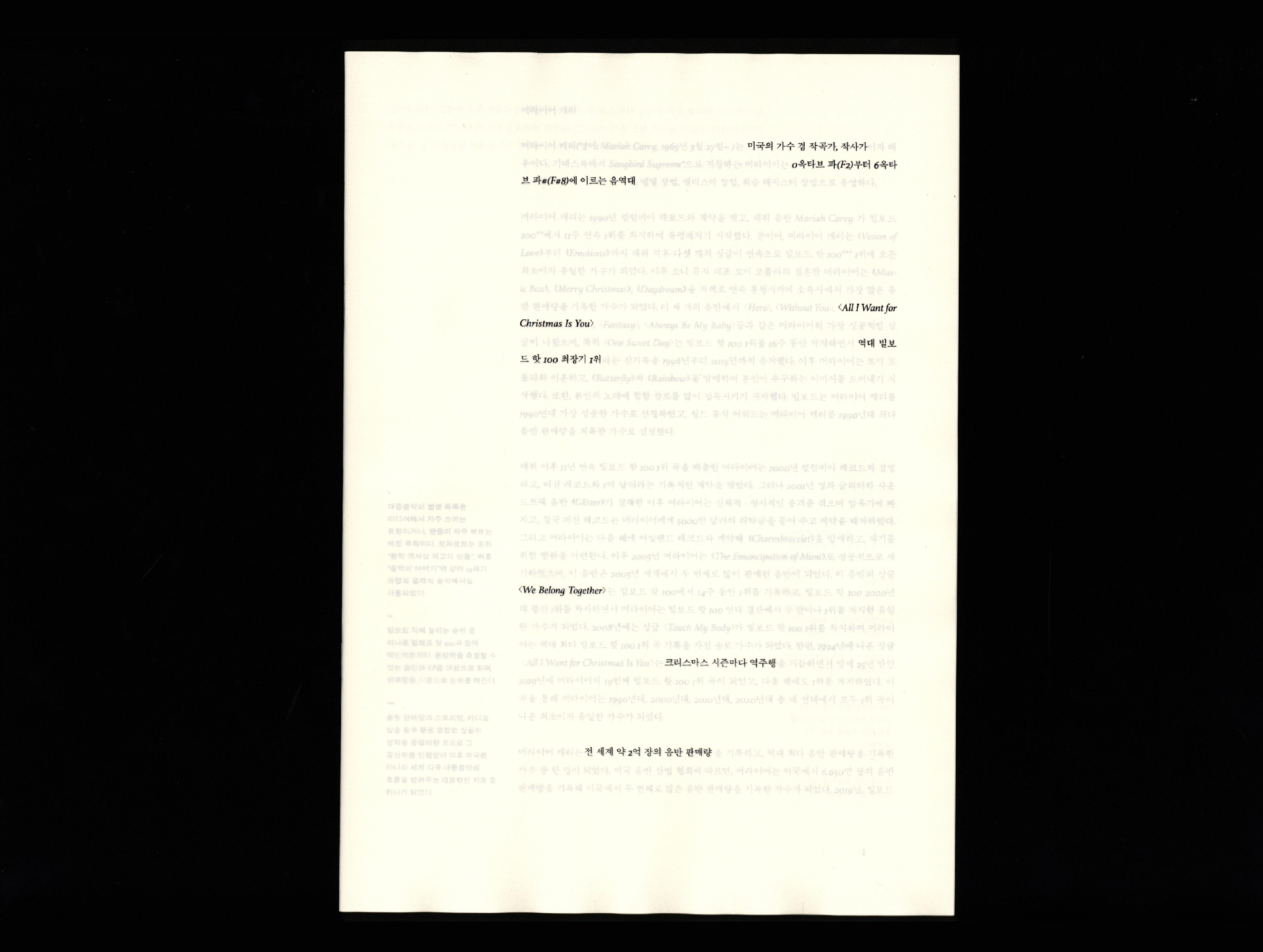 보험약관 책의 일부 지면을 평가하고 새롭게 구성한다. 작은 사이즈의 지면안에서 요소의 과장이나 낭비없이 텍스트의 구조가 눈에 잘 들어오게 하는 것이 목적이다. 디지털 연속화면에서는 보험약관의 목적과 컨셉을 극단적으로 확장시키고 추가했다.(모든 사항을 강제적으로 읽어야 하며 네비게이션 바가 제대로 기능하지 않는다.) 2쪽 지면과 8쪽 지면, 디지털 연속화면이 있다. 김하람 sh70900@naver.com HTML 삽입 미리보기할 수 없는 소스