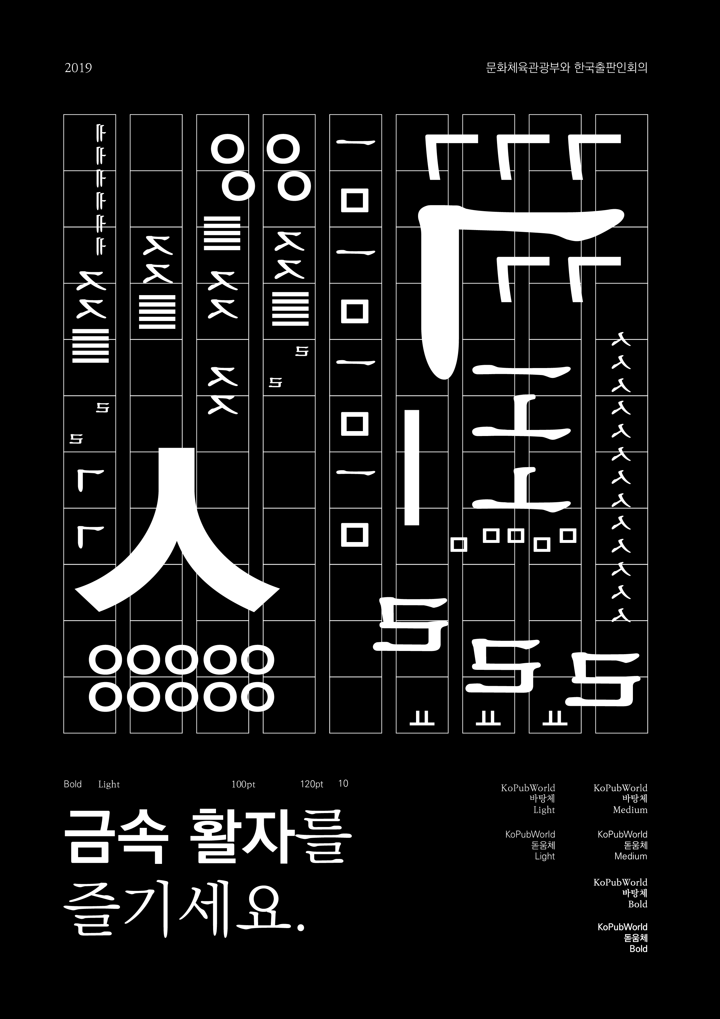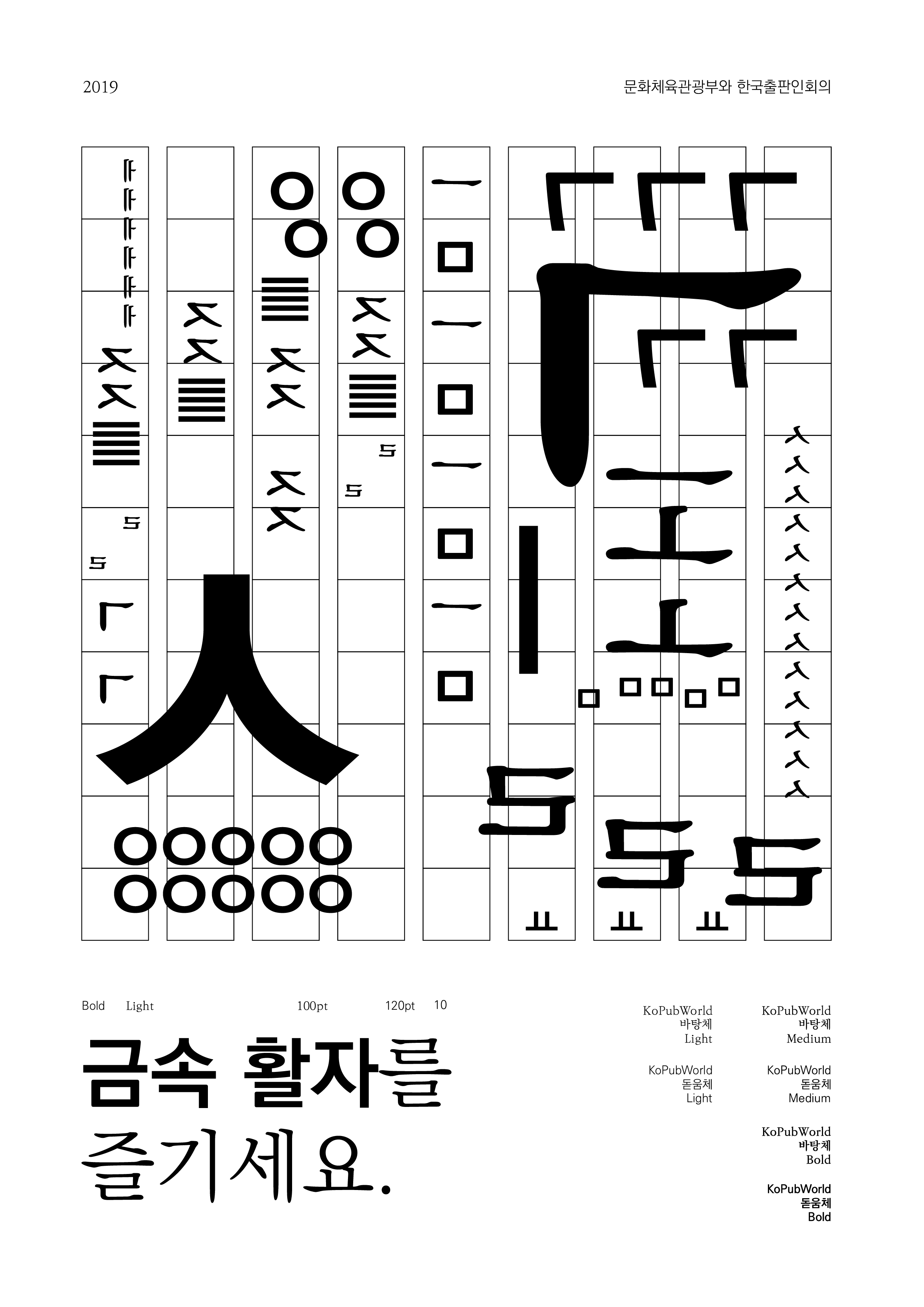 옛한글을 바탕으로 만들어진 'KoPub World 서체'를 조형적 특징으로 분석하여 활자체 정보를 시각화한 포스터이다.