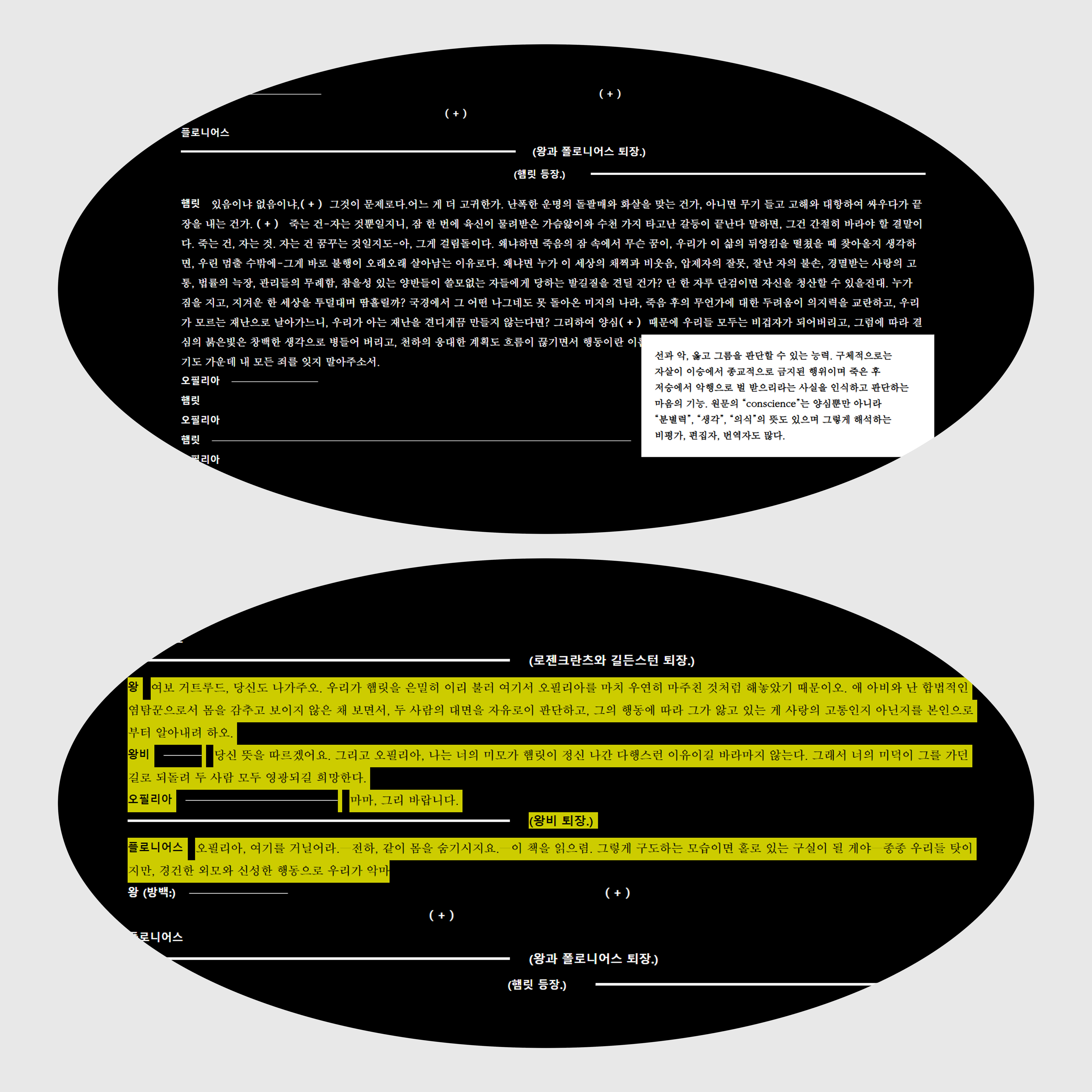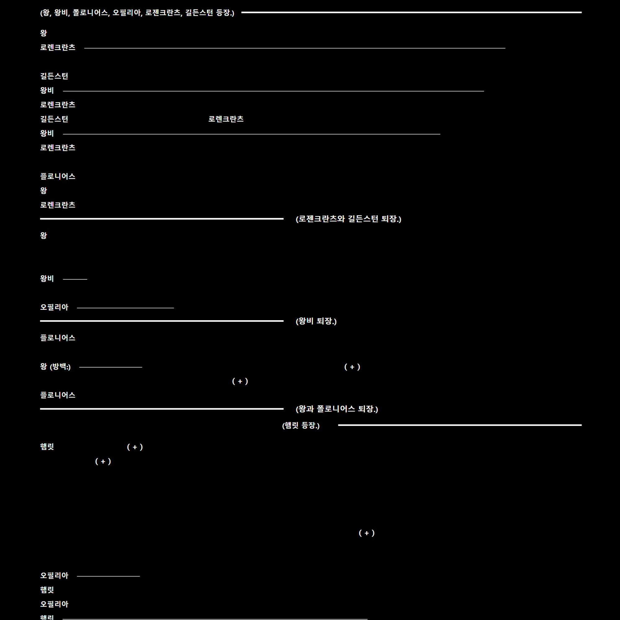 희곡 <햄릿>의 요소를 지키되 새로운 방식을 구성한다. 인물의 대사를 분석하여 지면에 요약해준다.