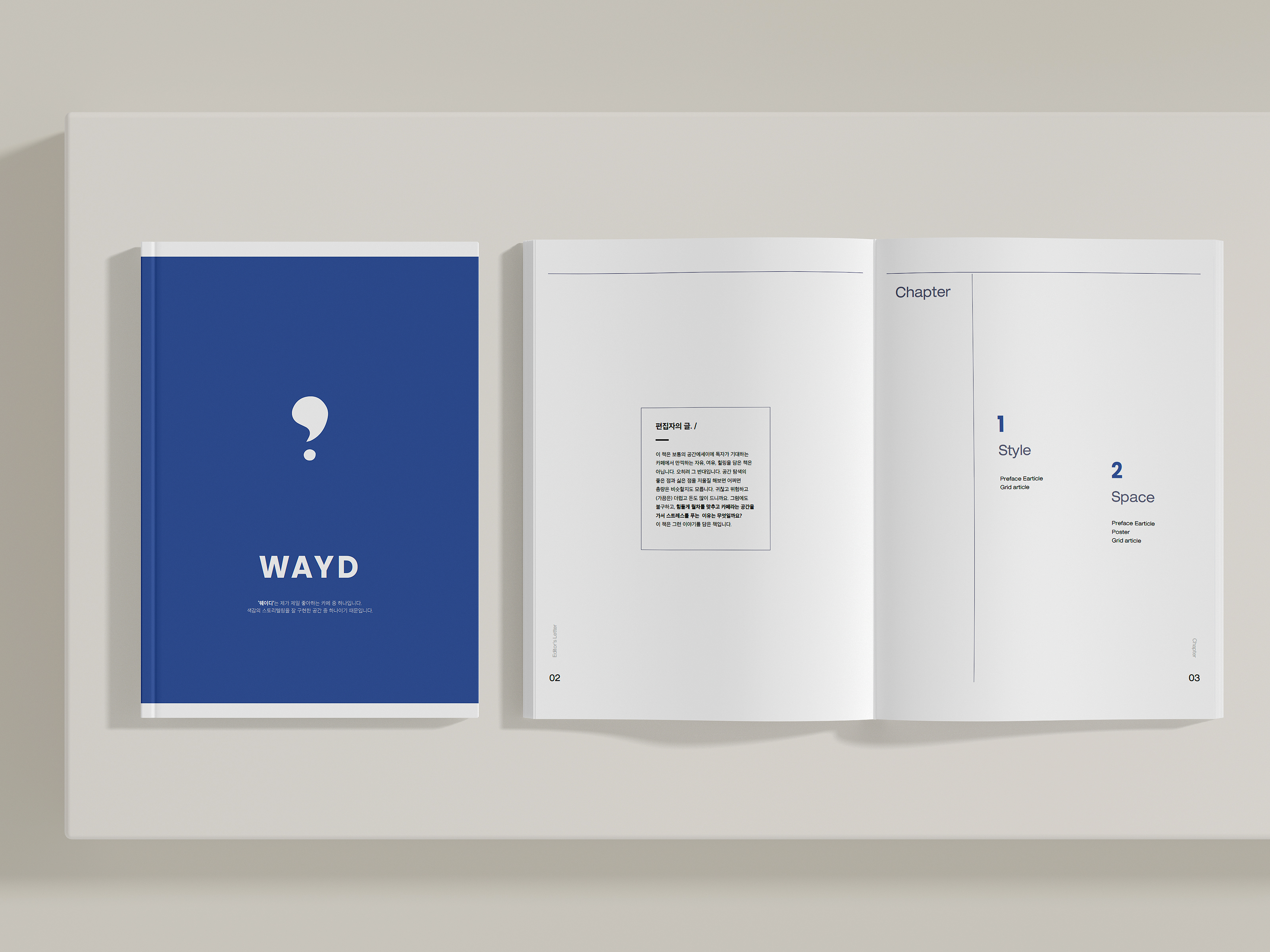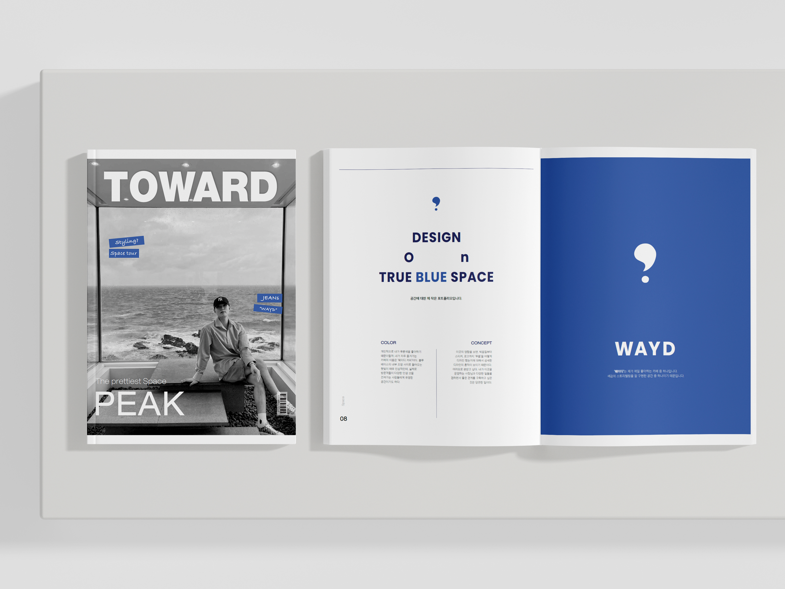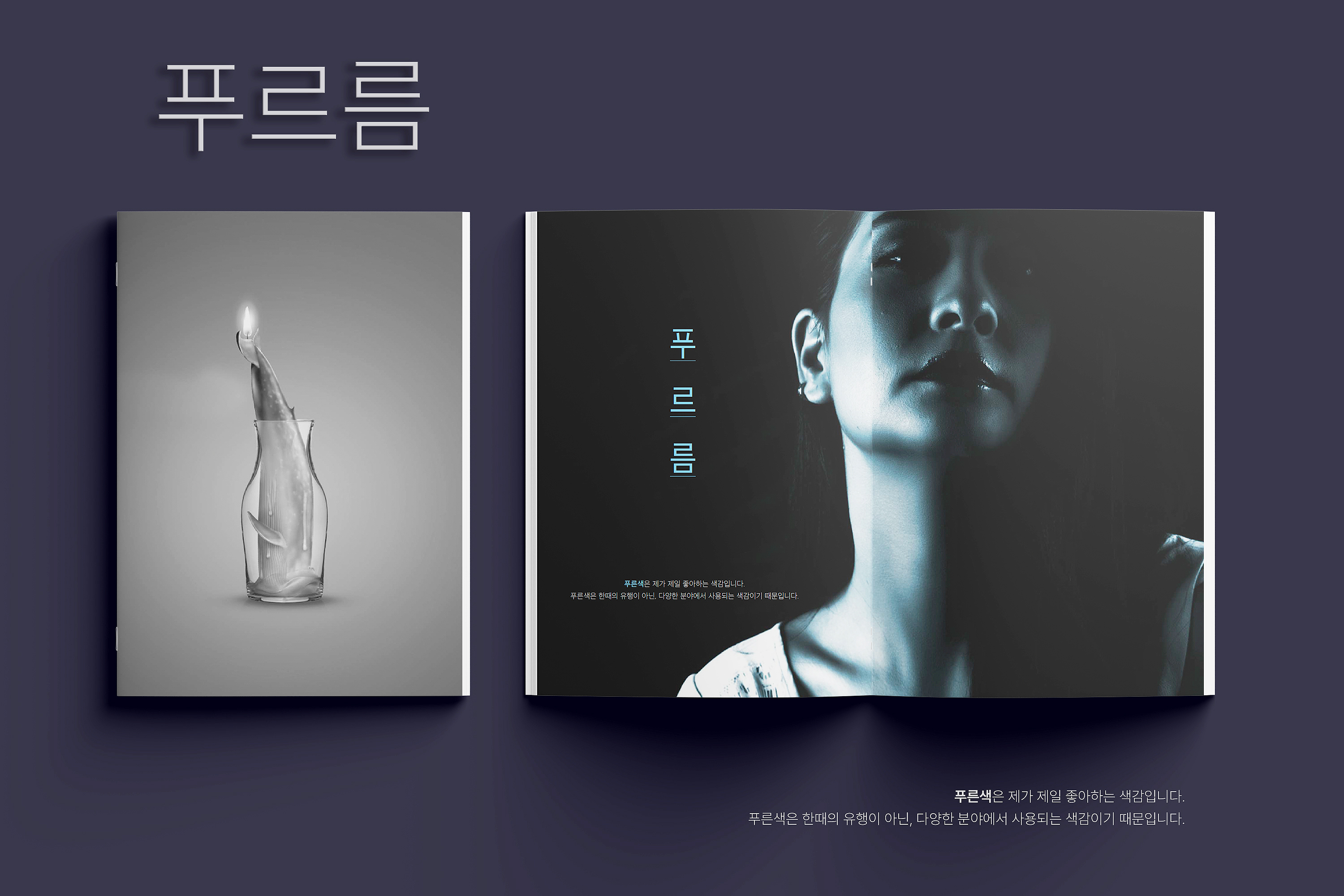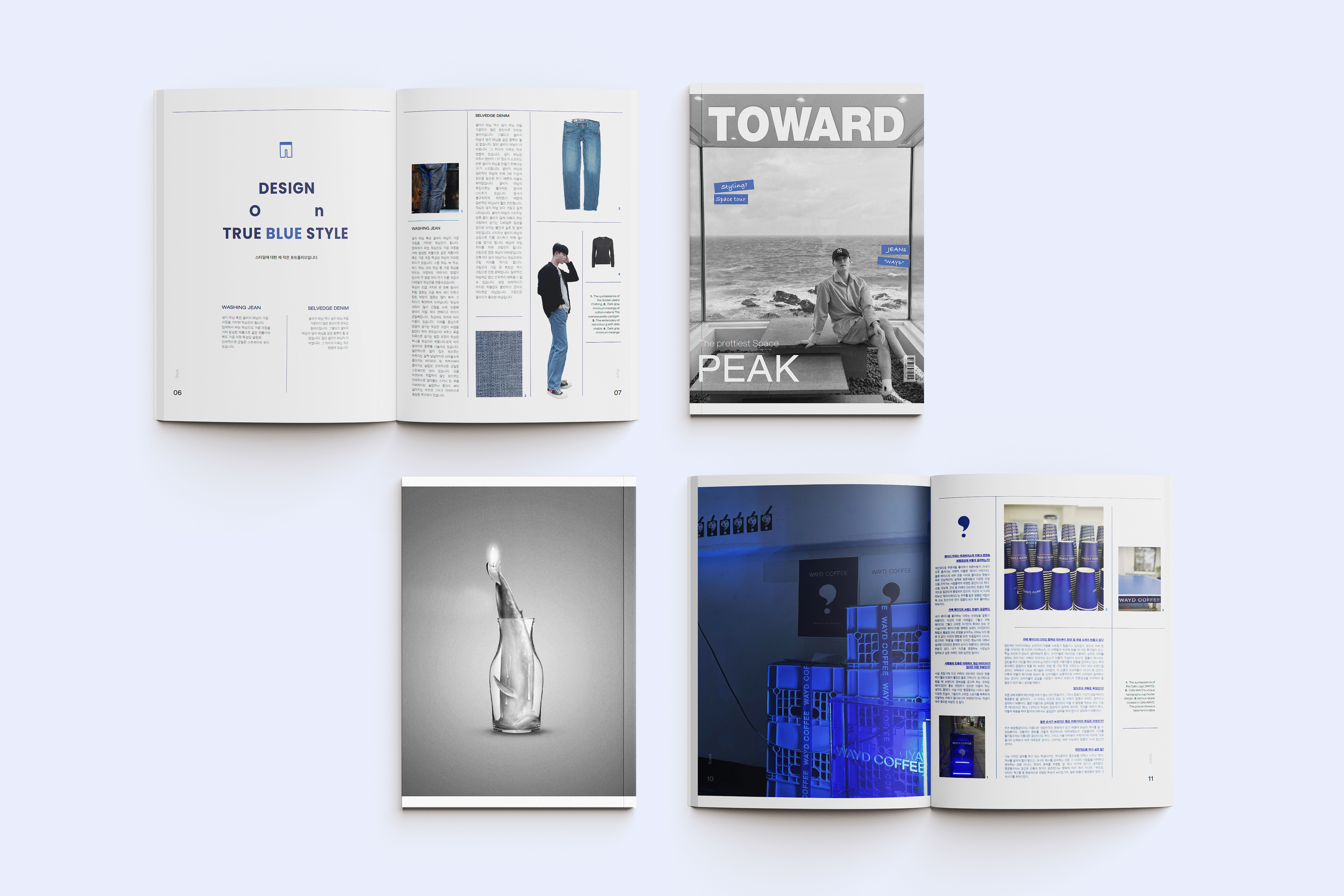 ‘푸른색'이라는 색감을 선정한 후, 공간과 패션이라는 새로운 분야에 접목해, 에세이 형식으로 제작한 잡지 디자인입니다. 제가 공간을 탐색하며 직접 보고, 찍고, 느낀 사진들을 주로 활용했으며, 단순한 푸른색도 다양한 환경과 분위기 속에서, 다채롭게 해석이 되는 부분이 매우 인상 깊었다고 할 수 있습니다. 임주원 7dlawndnjs@naver.com