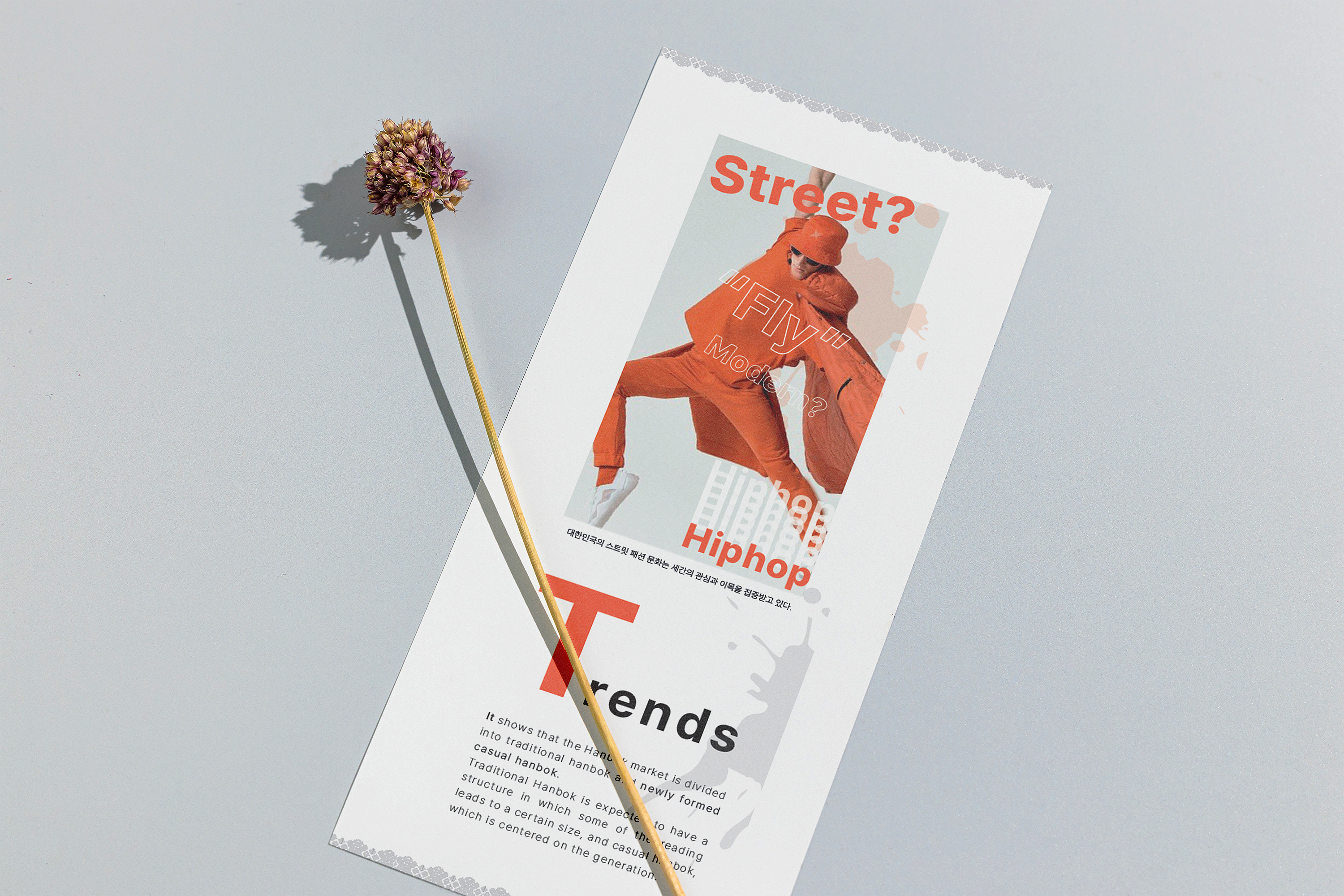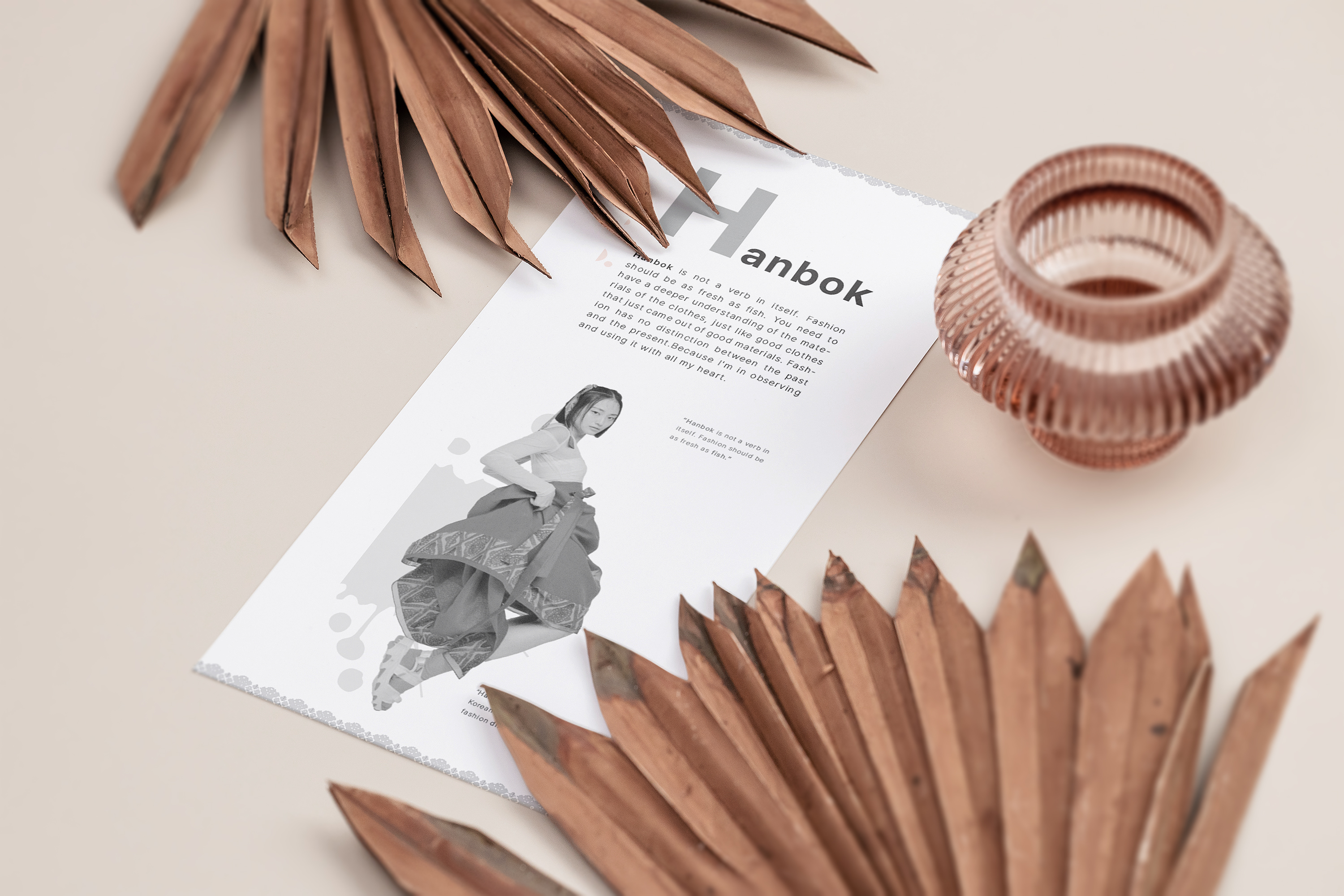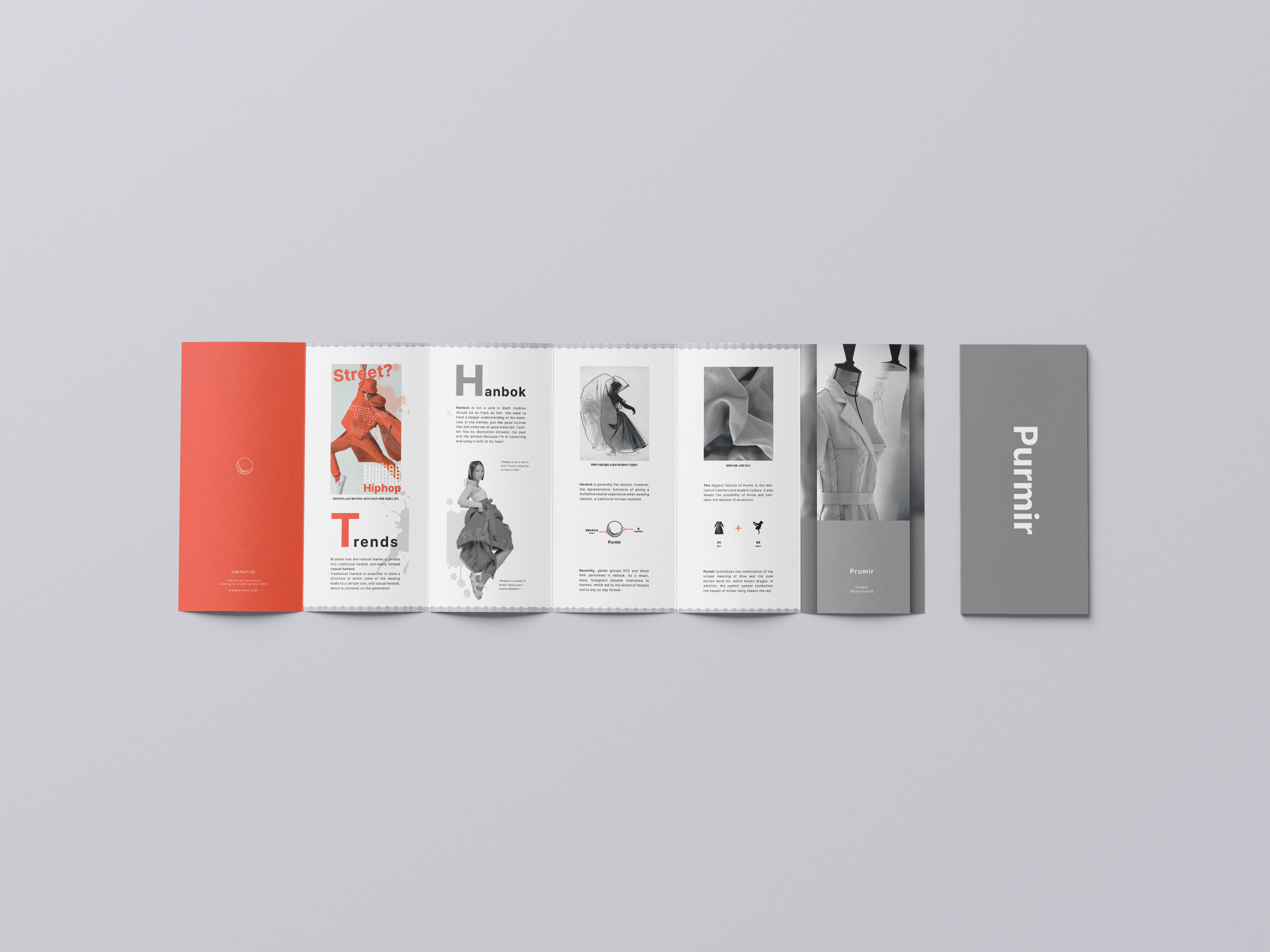 '푸르미르'라는 가상의 브랜드를 선정한 후, 대한민국의 전통의상인 한복을 스트릿 패션이라는 패션 트렌드의 컨셉으로 재해석해 만든 리플릿 디자인입니다. 브랜드 소개 페이지, 한복의 미, 스트릿 패션의 특징 등을 페이지 별로 간략하게 정리했으며, 타이포그래피의 배치를 통해 내용 전달을 극대화하고자 하였습니다.